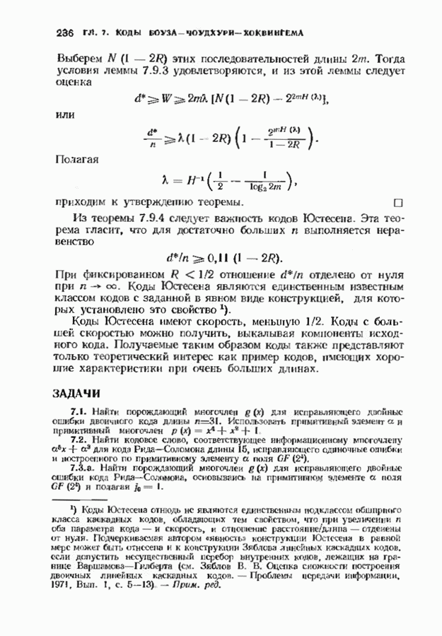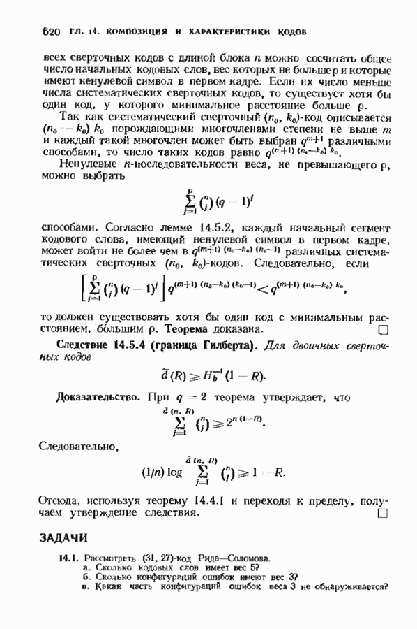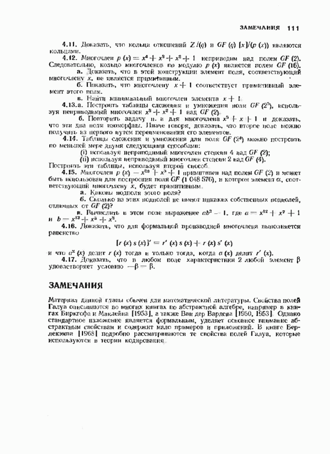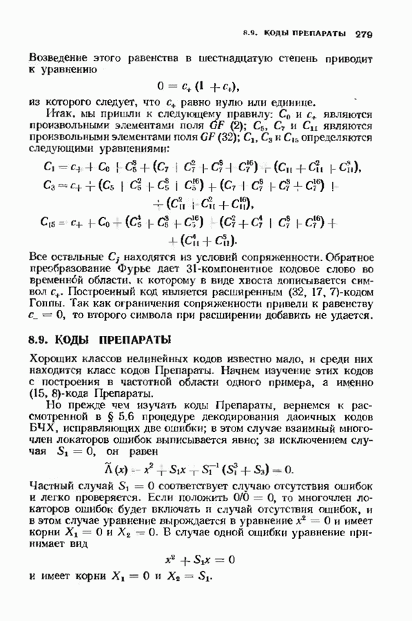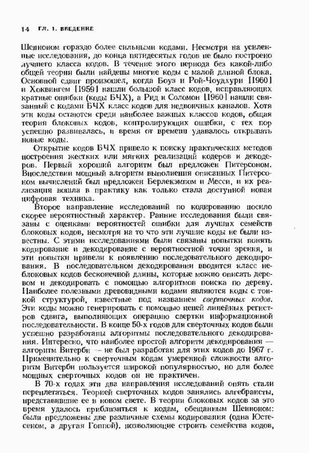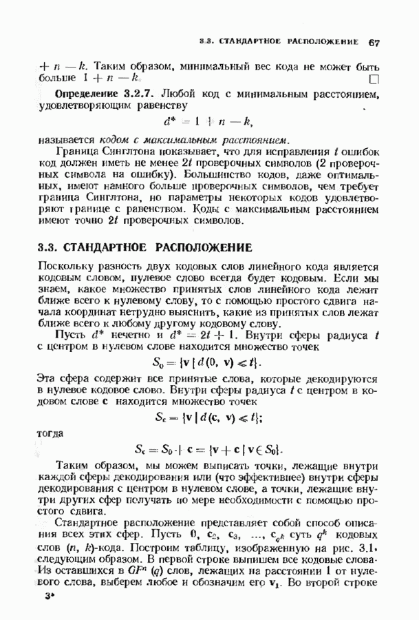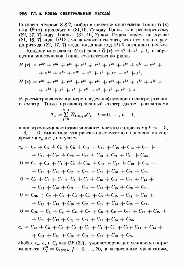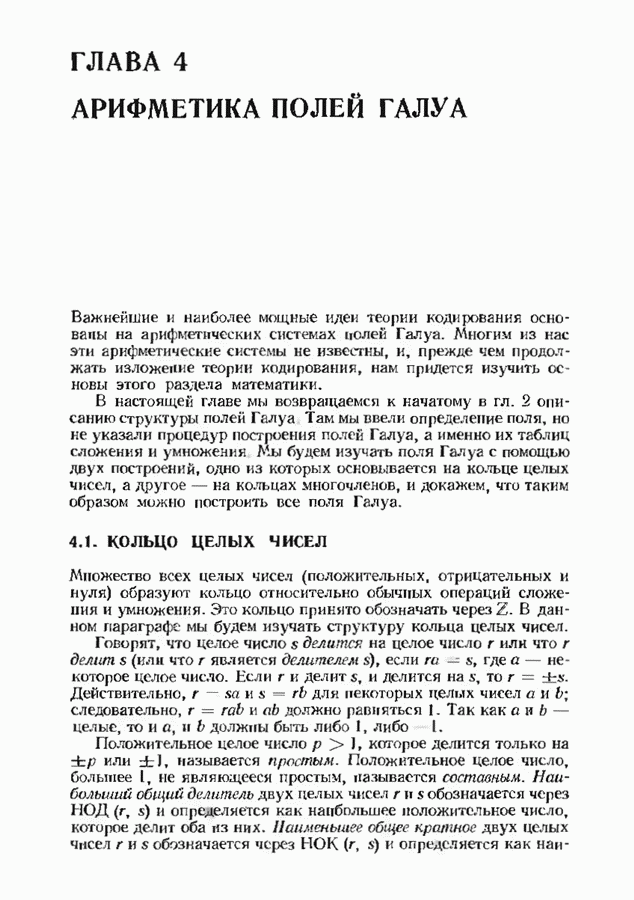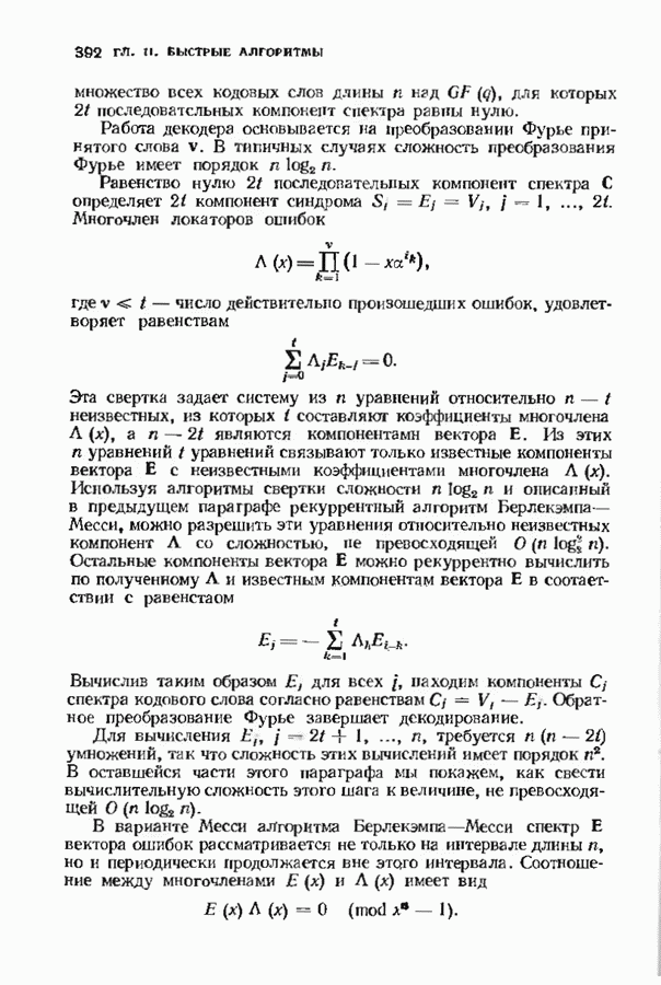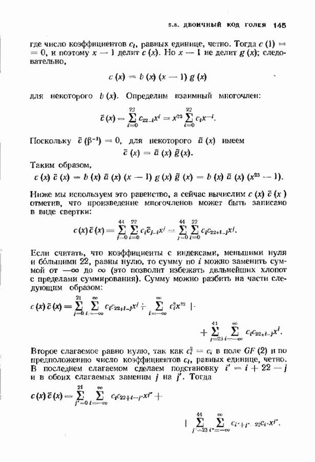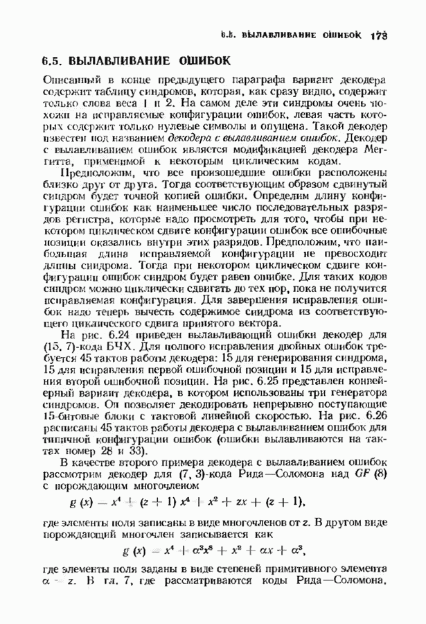 Если произошла только одна ошибка, то одна из оценок, даваемых проверочными суммами, будет неверна; мажоритарное решение дает значение Аналогично может быть продекодирован любой информационный символ, который умножается на одну из строк матрицы После того как эти информационные символы найдены, их вклад в кодовое слово вычитается из принятого слова. Это эквивалентно тому, что мы получаем слово кода Рида — Маллера Этот процесс повторяется до тех пор, пока не будут найдены все информационные биты. ЗАДАЧИ(см. скан) (см. скан) (см. скан) ЗАМЕЧАНИЯИзучение линейных кодов восходит к ранним работам Хэмминга [1950] и Голея 119491. Большинство положений, используемых в настоящее время при изучении линейных колов, заложено Слепяном [1956, 1960]: первые три параграфа тесно связаны с этими работами. Еще до этого Киксу 119537 обратил внимание на связь между линейными кодами и подпространствами векторных пространств. Коды с максимальным расстоянием впервые изучал Синглтон Двоичные коды Хэмминга как коды, исправляющие ошибки, впервые рассматривал Хэмминг, хотя подобные комбнпаторные структуры, рацее встречались в задачах статистики. Недвоичные коды Хэмминга были получены Голсем [1958] и Коком [1959]. Понятие совершенного кода впервые истречается у Голея, хотя он не пользовался таким термином. Делалось много попыток найти новые совершенные коды, но лишь отдельные из них увенчались успехом. В ряде работ Тиотявяйнен и Ван Лиит (работы завершились в 1974 и 1975 гг. соответственно) доказали, что не существует линейных (нетривиальных) совершенных кодов, отличных от кодов Хэмминга или Голея, и не существует нелинейных (нетривиальных) кодов, за исключением кодоп Васильева [1962] и Шёнхейма [1968]. Коды Рида-Маллера были получены Маллером [1954], и в этом же году Рид разработал алгоритм их декодирования. Этот алгоритм необычем тем, что принимает решение, основанное «а мажоритарной логике. Коды Рида-Маллера являются предшественниками обширных семейств мажоритарно декодируемых кодов, с которыми мы встретимся в следующих главах.