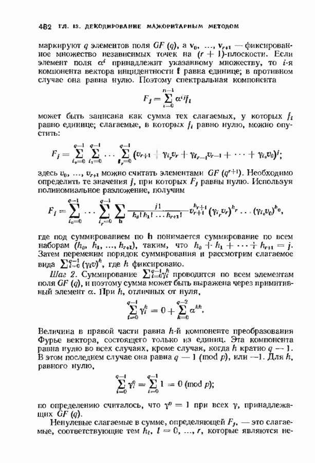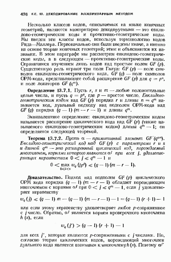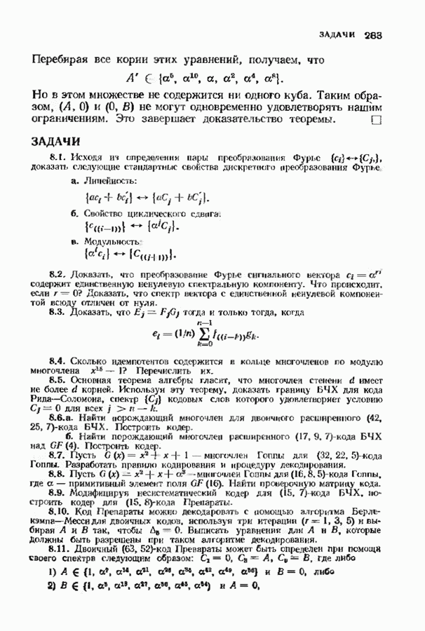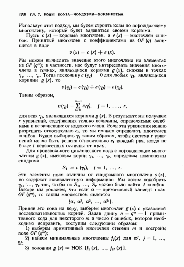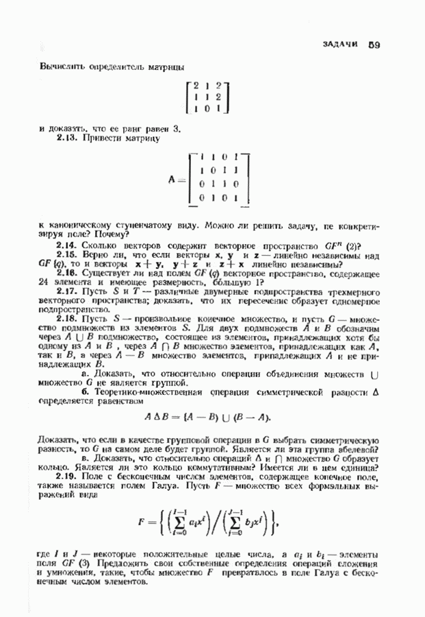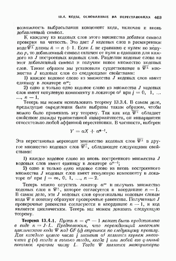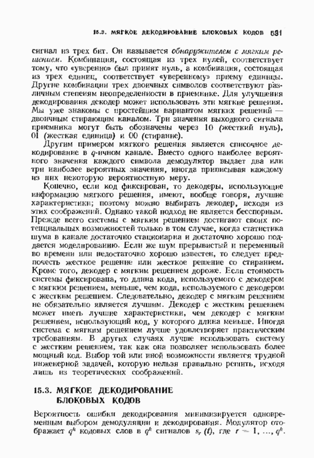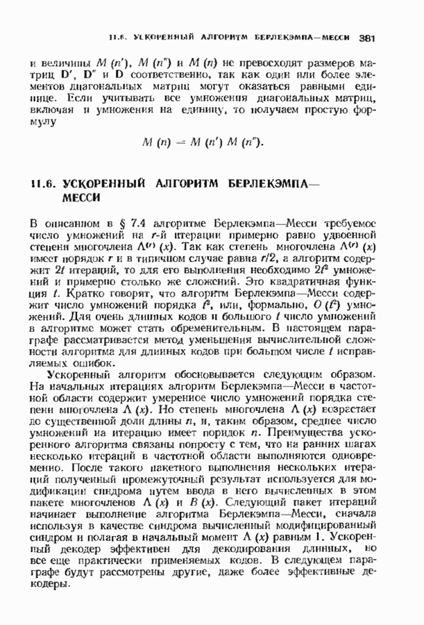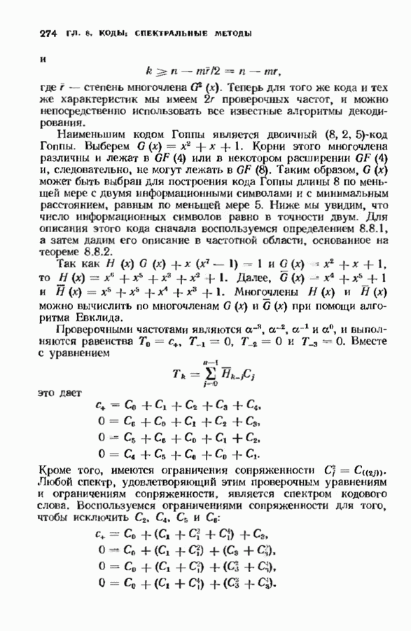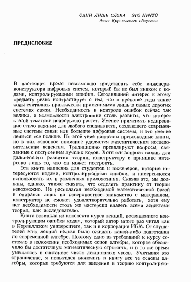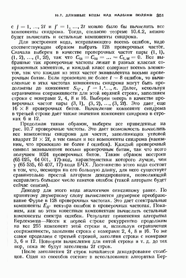 Если произошла только одна ошибка, то одна из оценок, даваемых проверочными суммами, будет неверна; мажоритарное решение дает значение Аналогично может быть продекодирован любой информационный символ, который умножается на одну из строк матрицы После того как эти информационные символы найдены, их вклад в кодовое слово вычитается из принятого слова. Это эквивалентно тому, что мы получаем слово кода Рида — Маллера Этот процесс повторяется до тех пор, пока не будут найдены все информационные биты. ЗАДАЧИ(см. скан) (см. скан) (см. скан) ЗАМЕЧАНИЯИзучение линейных кодов восходит к ранним работам Хэмминга [1950] и Голея 119491. Большинство положений, используемых в настоящее время при изучении линейных колов, заложено Слепяном [1956, 1960]: первые три параграфа тесно связаны с этими работами. Еще до этого Киксу 119537 обратил внимание на связь между линейными кодами и подпространствами векторных пространств. Коды с максимальным расстоянием впервые изучал Синглтон Двоичные коды Хэмминга как коды, исправляющие ошибки, впервые рассматривал Хэмминг, хотя подобные комбнпаторные структуры, рацее встречались в задачах статистики. Недвоичные коды Хэмминга были получены Голсем [1958] и Коком [1959]. Понятие совершенного кода впервые истречается у Голея, хотя он не пользовался таким термином. Делалось много попыток найти новые совершенные коды, но лишь отдельные из них увенчались успехом. В ряде работ Тиотявяйнен и Ван Лиит (работы завершились в 1974 и 1975 гг. соответственно) доказали, что не существует линейных (нетривиальных) совершенных кодов, отличных от кодов Хэмминга или Голея, и не существует нелинейных (нетривиальных) кодов, за исключением кодоп Васильева [1962] и Шёнхейма [1968]. Коды Рида-Маллера были получены Маллером [1954], и в этом же году Рид разработал алгоритм их декодирования. Этот алгоритм необычем тем, что принимает решение, основанное «а мажоритарной логике. Коды Рида-Маллера являются предшественниками обширных семейств мажоритарно декодируемых кодов, с которыми мы встретимся в следующих главах.