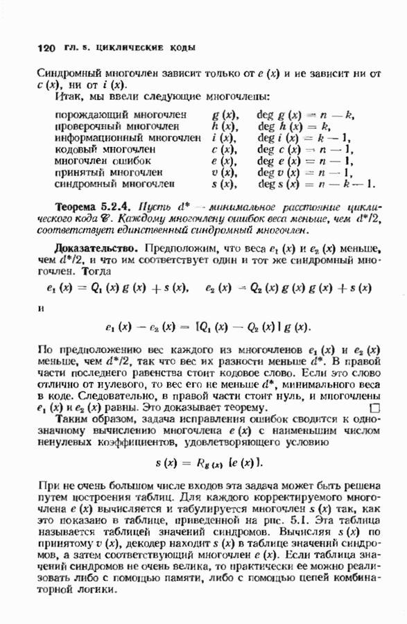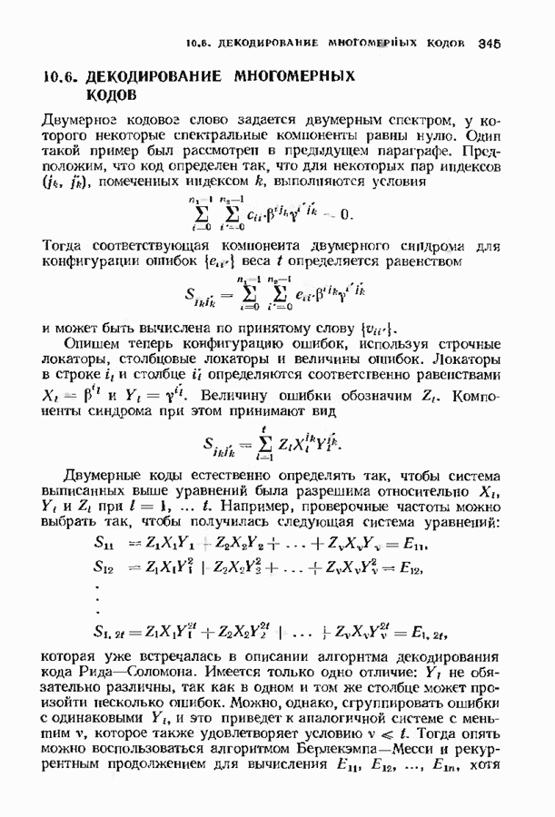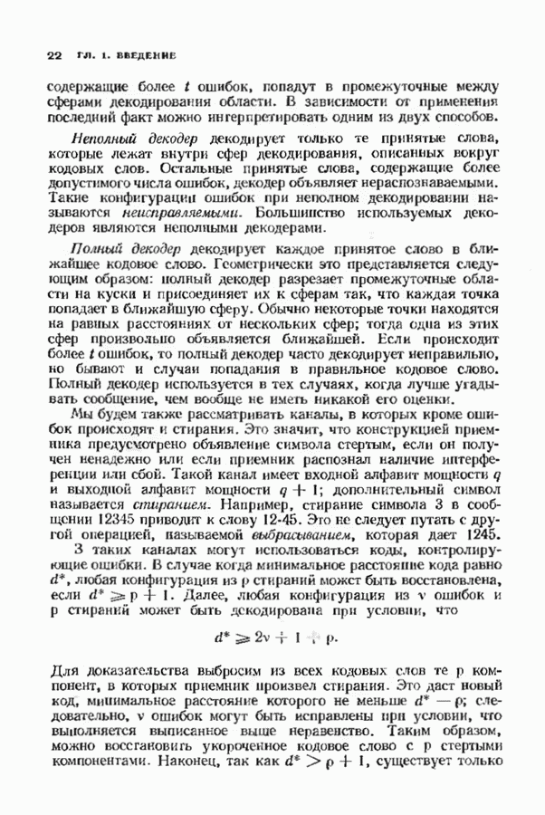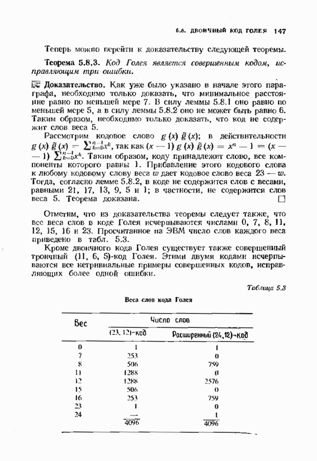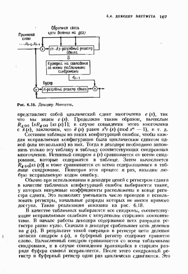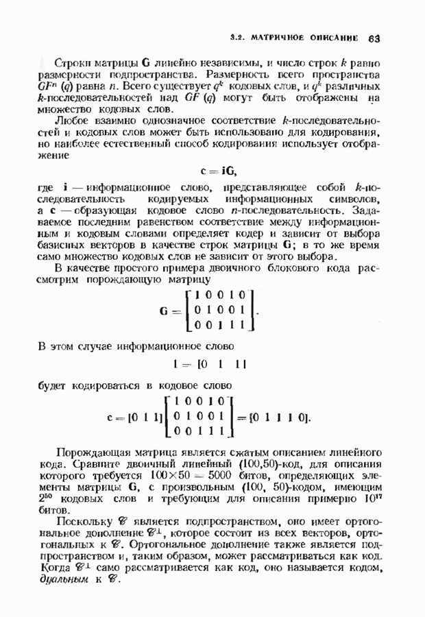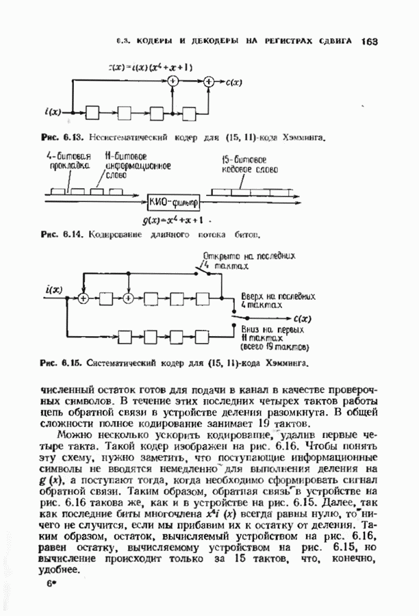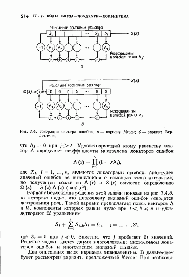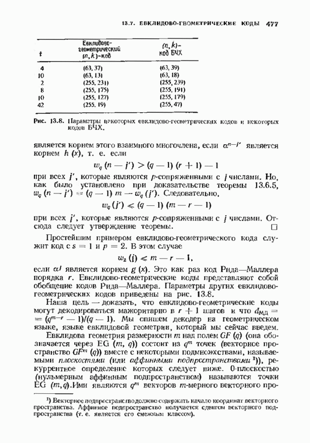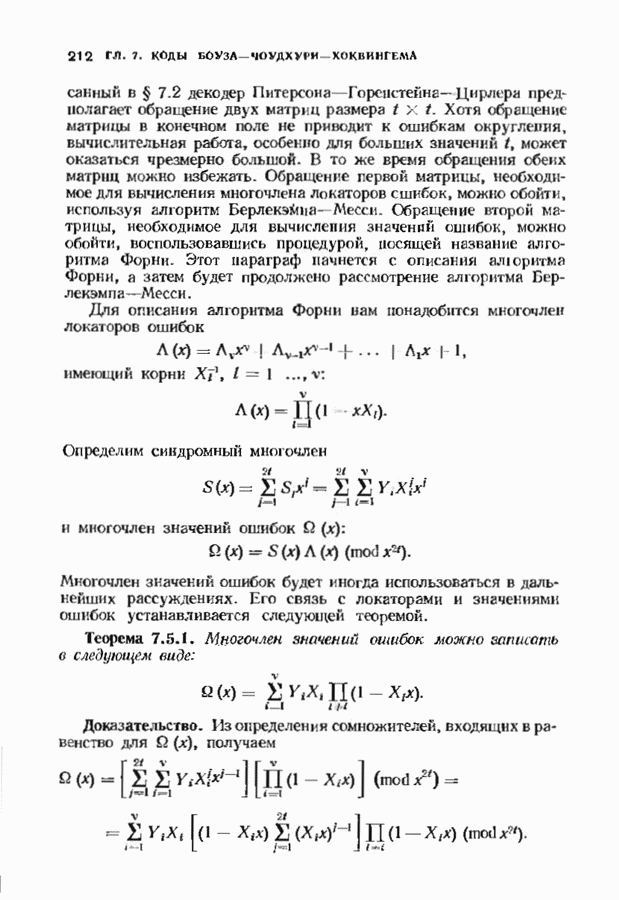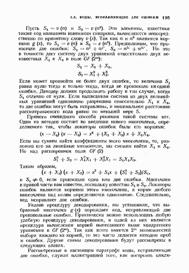 Если произошла только одна ошибка, то одна из оценок, даваемых проверочными суммами, будет неверна; мажоритарное решение дает значение Аналогично может быть продекодирован любой информационный символ, который умножается на одну из строк матрицы После того как эти информационные символы найдены, их вклад в кодовое слово вычитается из принятого слова. Это эквивалентно тому, что мы получаем слово кода Рида — Маллера Этот процесс повторяется до тех пор, пока не будут найдены все информационные биты. ЗАДАЧИ(см. скан) (см. скан) (см. скан) ЗАМЕЧАНИЯИзучение линейных кодов восходит к ранним работам Хэмминга [1950] и Голея 119491. Большинство положений, используемых в настоящее время при изучении линейных колов, заложено Слепяном [1956, 1960]: первые три параграфа тесно связаны с этими работами. Еще до этого Киксу 119537 обратил внимание на связь между линейными кодами и подпространствами векторных пространств. Коды с максимальным расстоянием впервые изучал Синглтон Двоичные коды Хэмминга как коды, исправляющие ошибки, впервые рассматривал Хэмминг, хотя подобные комбнпаторные структуры, рацее встречались в задачах статистики. Недвоичные коды Хэмминга были получены Голсем [1958] и Коком [1959]. Понятие совершенного кода впервые истречается у Голея, хотя он не пользовался таким термином. Делалось много попыток найти новые совершенные коды, но лишь отдельные из них увенчались успехом. В ряде работ Тиотявяйнен и Ван Лиит (работы завершились в 1974 и 1975 гг. соответственно) доказали, что не существует линейных (нетривиальных) совершенных кодов, отличных от кодов Хэмминга или Голея, и не существует нелинейных (нетривиальных) кодов, за исключением кодоп Васильева [1962] и Шёнхейма [1968]. Коды Рида-Маллера были получены Маллером [1954], и в этом же году Рид разработал алгоритм их декодирования. Этот алгоритм необычем тем, что принимает решение, основанное «а мажоритарной логике. Коды Рида-Маллера являются предшественниками обширных семейств мажоритарно декодируемых кодов, с которыми мы встретимся в следующих главах.
