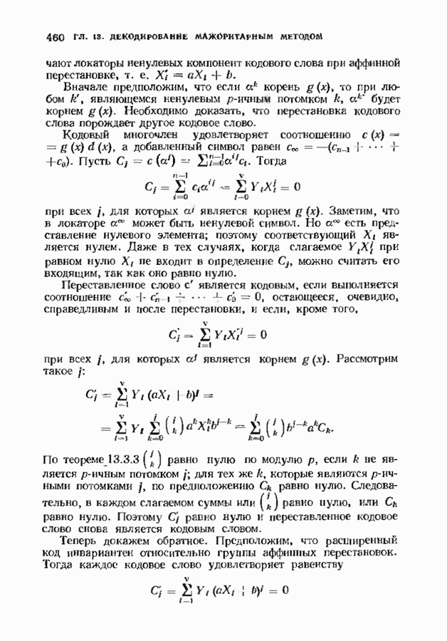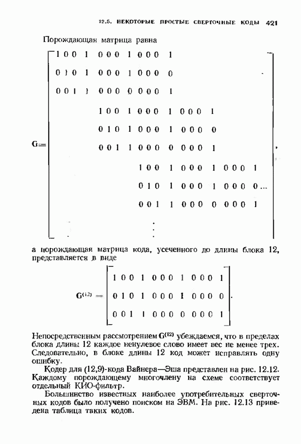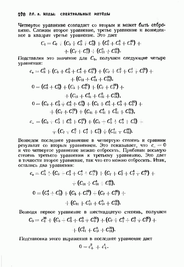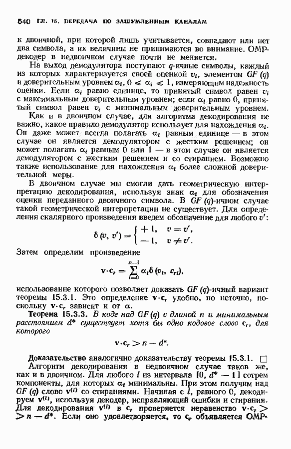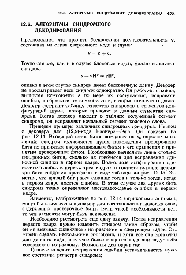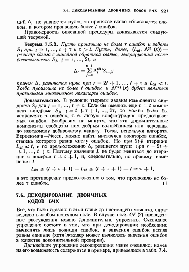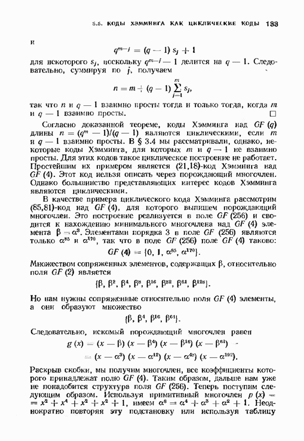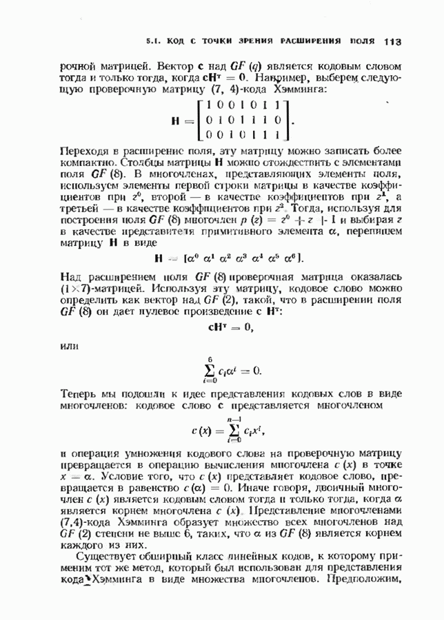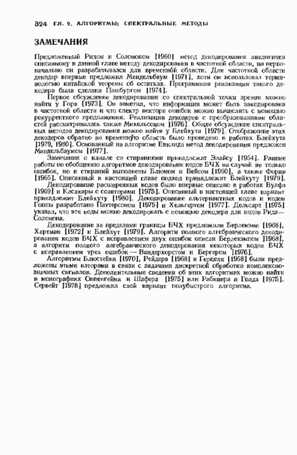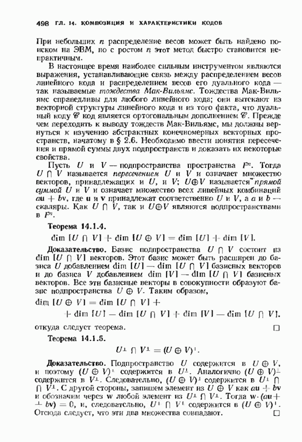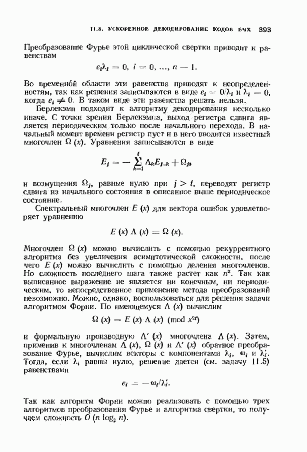 Если произошла только одна ошибка, то одна из оценок, даваемых проверочными суммами, будет неверна; мажоритарное решение дает значение Аналогично может быть продекодирован любой информационный символ, который умножается на одну из строк матрицы После того как эти информационные символы найдены, их вклад в кодовое слово вычитается из принятого слова. Это эквивалентно тому, что мы получаем слово кода Рида — Маллера Этот процесс повторяется до тех пор, пока не будут найдены все информационные биты. ЗАДАЧИ(см. скан) (см. скан) (см. скан) ЗАМЕЧАНИЯИзучение линейных кодов восходит к ранним работам Хэмминга [1950] и Голея 119491. Большинство положений, используемых в настоящее время при изучении линейных колов, заложено Слепяном [1956, 1960]: первые три параграфа тесно связаны с этими работами. Еще до этого Киксу 119537 обратил внимание на связь между линейными кодами и подпространствами векторных пространств. Коды с максимальным расстоянием впервые изучал Синглтон Двоичные коды Хэмминга как коды, исправляющие ошибки, впервые рассматривал Хэмминг, хотя подобные комбнпаторные структуры, рацее встречались в задачах статистики. Недвоичные коды Хэмминга были получены Голсем [1958] и Коком [1959]. Понятие совершенного кода впервые истречается у Голея, хотя он не пользовался таким термином. Делалось много попыток найти новые совершенные коды, но лишь отдельные из них увенчались успехом. В ряде работ Тиотявяйнен и Ван Лиит (работы завершились в 1974 и 1975 гг. соответственно) доказали, что не существует линейных (нетривиальных) совершенных кодов, отличных от кодов Хэмминга или Голея, и не существует нелинейных (нетривиальных) кодов, за исключением кодоп Васильева [1962] и Шёнхейма [1968]. Коды Рида-Маллера были получены Маллером [1954], и в этом же году Рид разработал алгоритм их декодирования. Этот алгоритм необычем тем, что принимает решение, основанное «а мажоритарной логике. Коды Рида-Маллера являются предшественниками обширных семейств мажоритарно декодируемых кодов, с которыми мы встретимся в следующих главах.