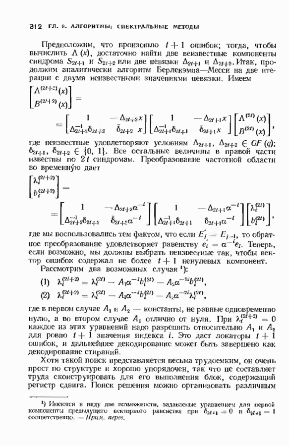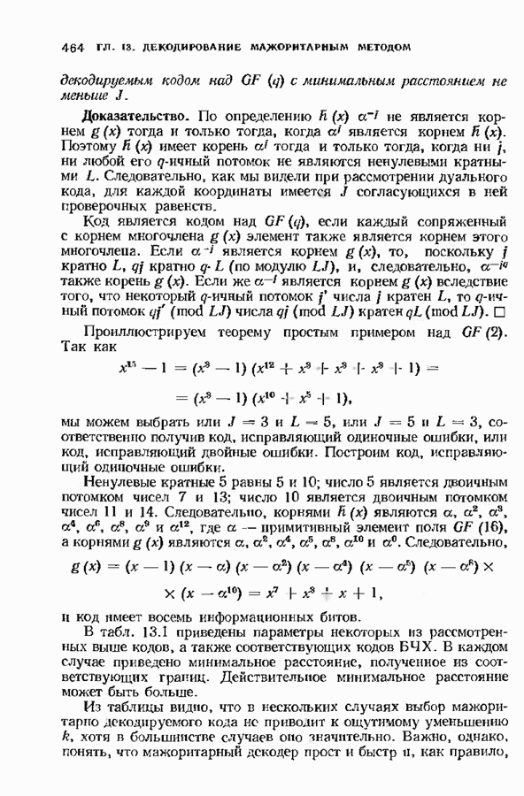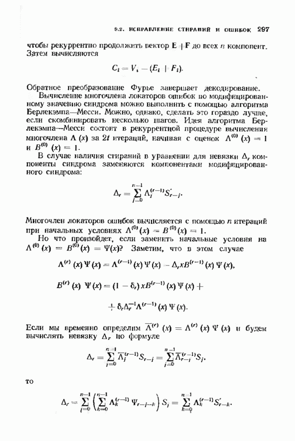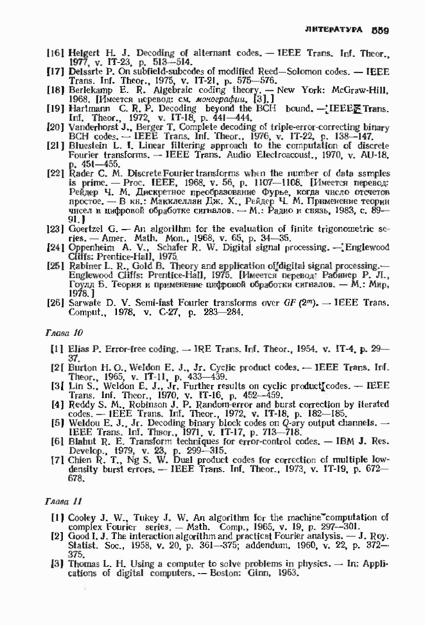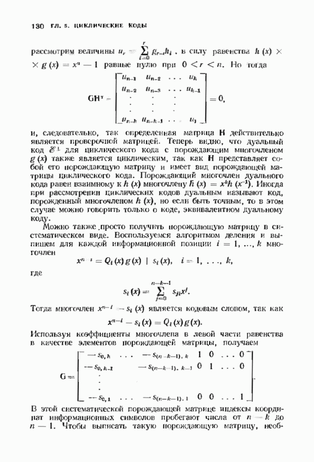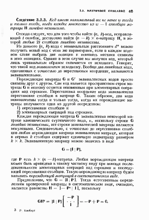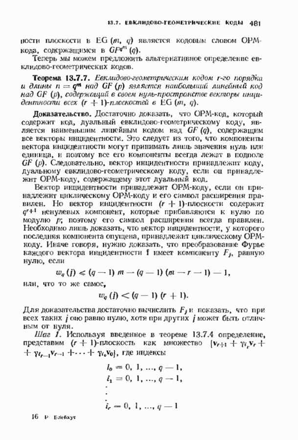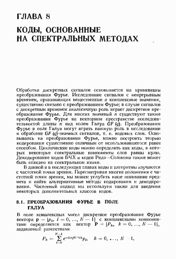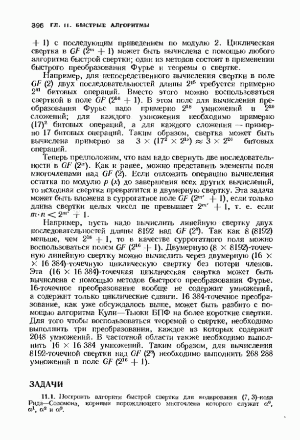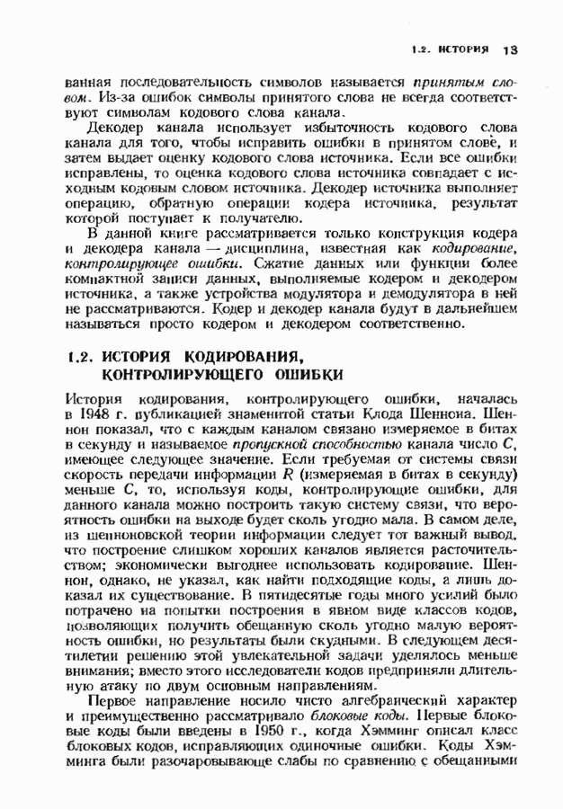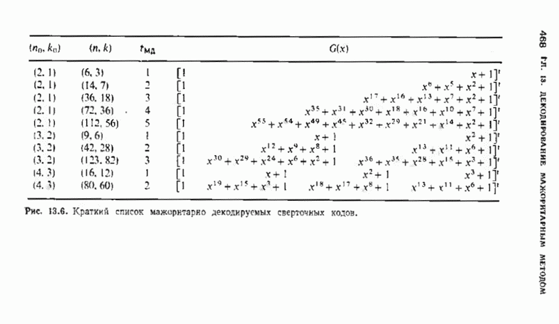 Если произошла только одна ошибка, то одна из оценок, даваемых проверочными суммами, будет неверна; мажоритарное решение дает значение Аналогично может быть продекодирован любой информационный символ, который умножается на одну из строк матрицы После того как эти информационные символы найдены, их вклад в кодовое слово вычитается из принятого слова. Это эквивалентно тому, что мы получаем слово кода Рида — Маллера Этот процесс повторяется до тех пор, пока не будут найдены все информационные биты. ЗАДАЧИ(см. скан) (см. скан) (см. скан) ЗАМЕЧАНИЯИзучение линейных кодов восходит к ранним работам Хэмминга [1950] и Голея 119491. Большинство положений, используемых в настоящее время при изучении линейных колов, заложено Слепяном [1956, 1960]: первые три параграфа тесно связаны с этими работами. Еще до этого Киксу 119537 обратил внимание на связь между линейными кодами и подпространствами векторных пространств. Коды с максимальным расстоянием впервые изучал Синглтон Двоичные коды Хэмминга как коды, исправляющие ошибки, впервые рассматривал Хэмминг, хотя подобные комбнпаторные структуры, рацее встречались в задачах статистики. Недвоичные коды Хэмминга были получены Голсем [1958] и Коком [1959]. Понятие совершенного кода впервые истречается у Голея, хотя он не пользовался таким термином. Делалось много попыток найти новые совершенные коды, но лишь отдельные из них увенчались успехом. В ряде работ Тиотявяйнен и Ван Лиит (работы завершились в 1974 и 1975 гг. соответственно) доказали, что не существует линейных (нетривиальных) совершенных кодов, отличных от кодов Хэмминга или Голея, и не существует нелинейных (нетривиальных) кодов, за исключением кодоп Васильева [1962] и Шёнхейма [1968]. Коды Рида-Маллера были получены Маллером [1954], и в этом же году Рид разработал алгоритм их декодирования. Этот алгоритм необычем тем, что принимает решение, основанное «а мажоритарной логике. Коды Рида-Маллера являются предшественниками обширных семейств мажоритарно декодируемых кодов, с которыми мы встретимся в следующих главах.