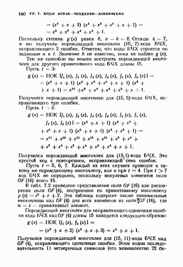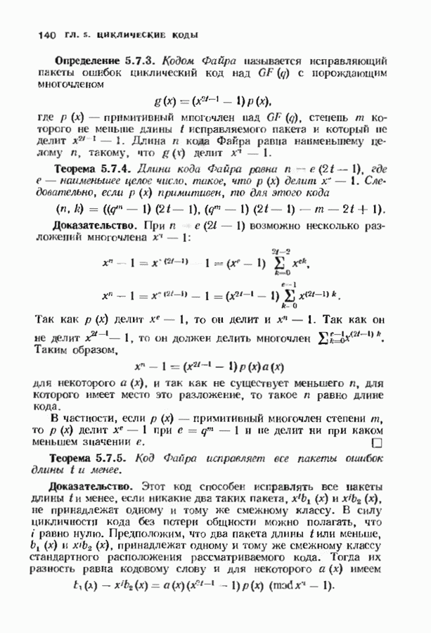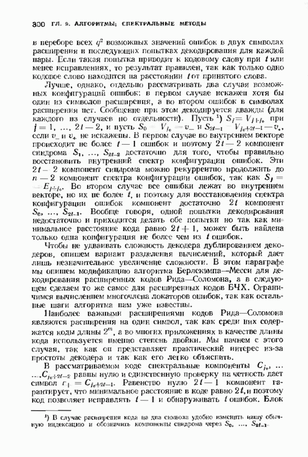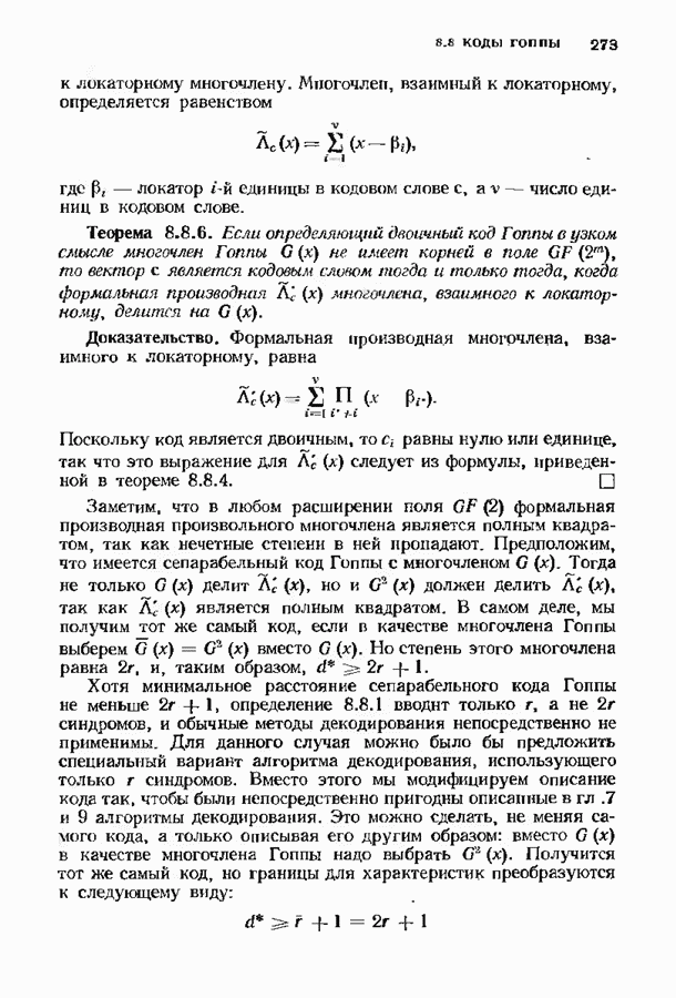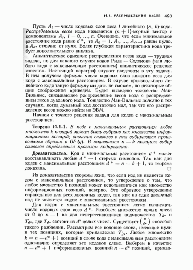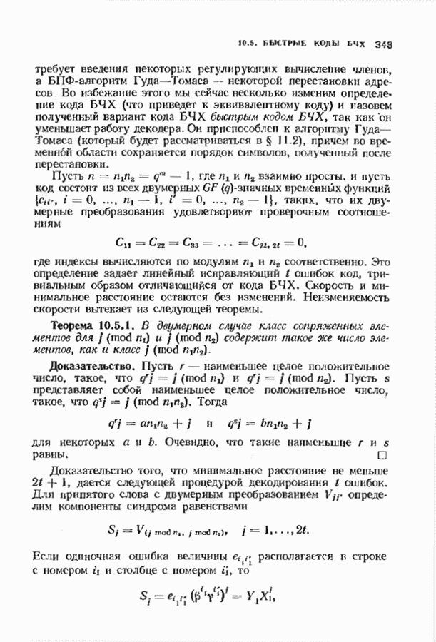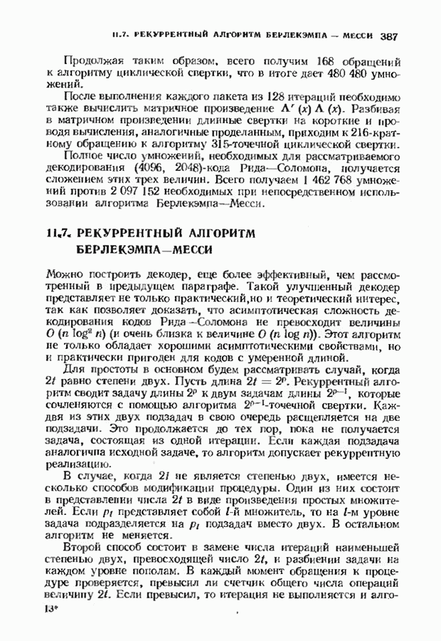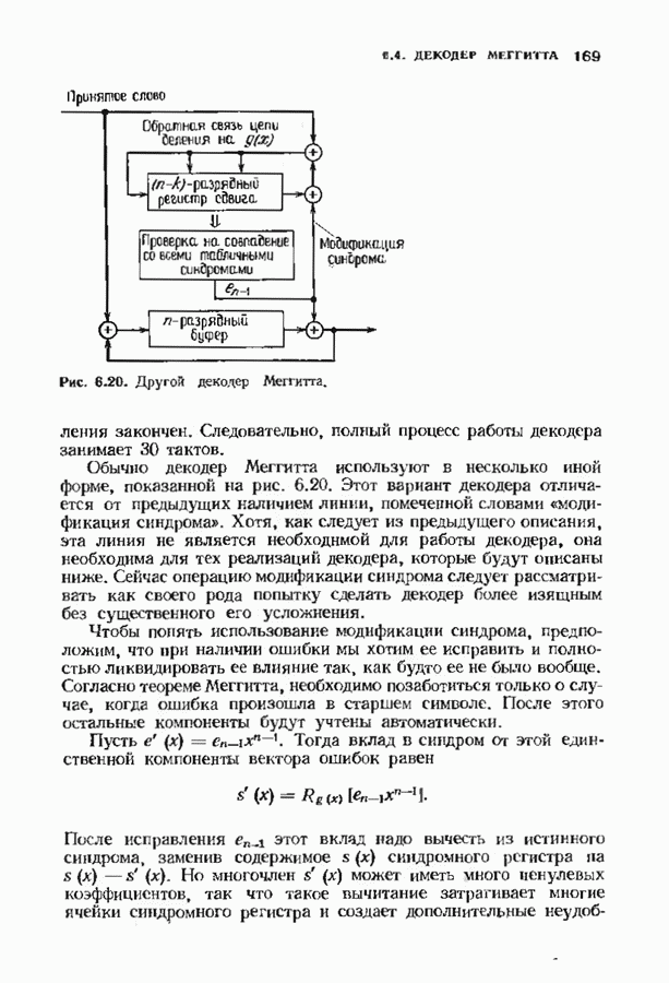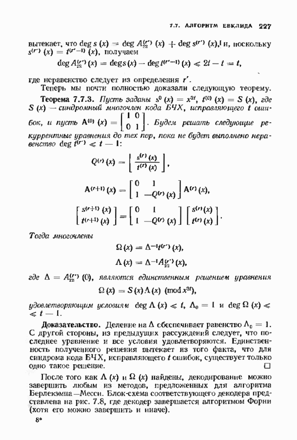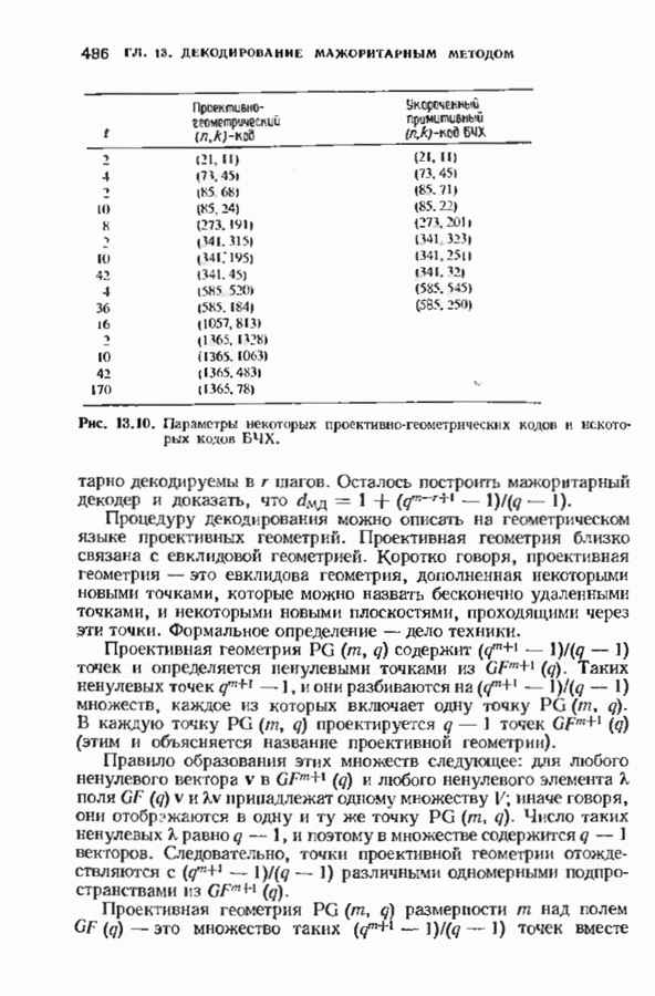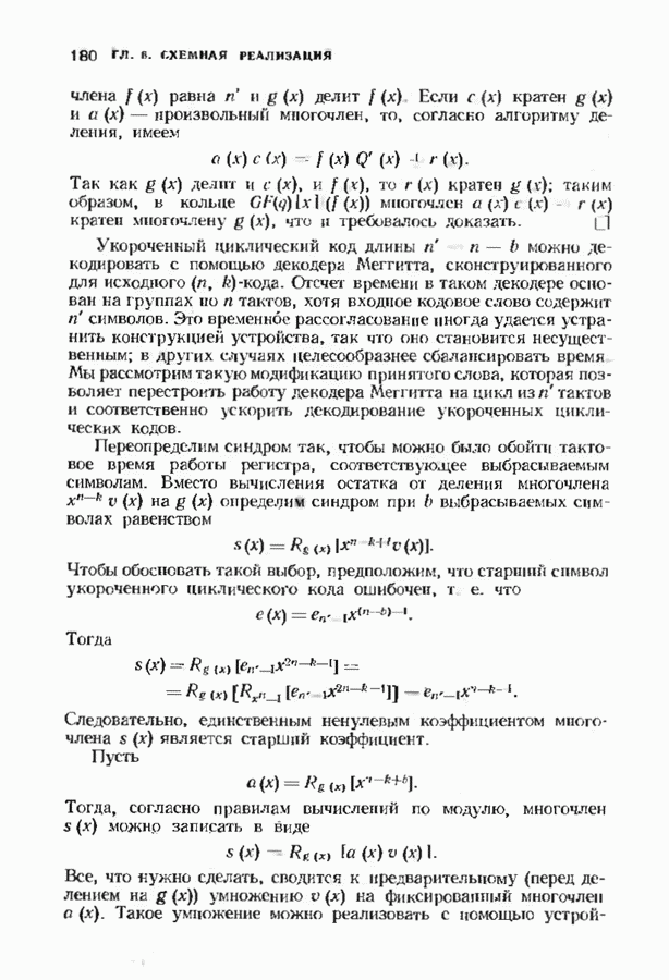 Если произошла только одна ошибка, то одна из оценок, даваемых проверочными суммами, будет неверна; мажоритарное решение дает значение Аналогично может быть продекодирован любой информационный символ, который умножается на одну из строк матрицы После того как эти информационные символы найдены, их вклад в кодовое слово вычитается из принятого слова. Это эквивалентно тому, что мы получаем слово кода Рида — Маллера Этот процесс повторяется до тех пор, пока не будут найдены все информационные биты. ЗАДАЧИ(см. скан) (см. скан) (см. скан) ЗАМЕЧАНИЯИзучение линейных кодов восходит к ранним работам Хэмминга [1950] и Голея 119491. Большинство положений, используемых в настоящее время при изучении линейных колов, заложено Слепяном [1956, 1960]: первые три параграфа тесно связаны с этими работами. Еще до этого Киксу 119537 обратил внимание на связь между линейными кодами и подпространствами векторных пространств. Коды с максимальным расстоянием впервые изучал Синглтон Двоичные коды Хэмминга как коды, исправляющие ошибки, впервые рассматривал Хэмминг, хотя подобные комбнпаторные структуры, рацее встречались в задачах статистики. Недвоичные коды Хэмминга были получены Голсем [1958] и Коком [1959]. Понятие совершенного кода впервые истречается у Голея, хотя он не пользовался таким термином. Делалось много попыток найти новые совершенные коды, но лишь отдельные из них увенчались успехом. В ряде работ Тиотявяйнен и Ван Лиит (работы завершились в 1974 и 1975 гг. соответственно) доказали, что не существует линейных (нетривиальных) совершенных кодов, отличных от кодов Хэмминга или Голея, и не существует нелинейных (нетривиальных) кодов, за исключением кодоп Васильева [1962] и Шёнхейма [1968]. Коды Рида-Маллера были получены Маллером [1954], и в этом же году Рид разработал алгоритм их декодирования. Этот алгоритм необычем тем, что принимает решение, основанное «а мажоритарной логике. Коды Рида-Маллера являются предшественниками обширных семейств мажоритарно декодируемых кодов, с которыми мы встретимся в следующих главах.