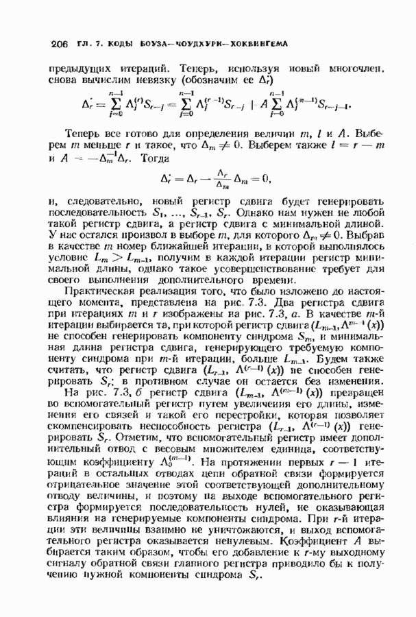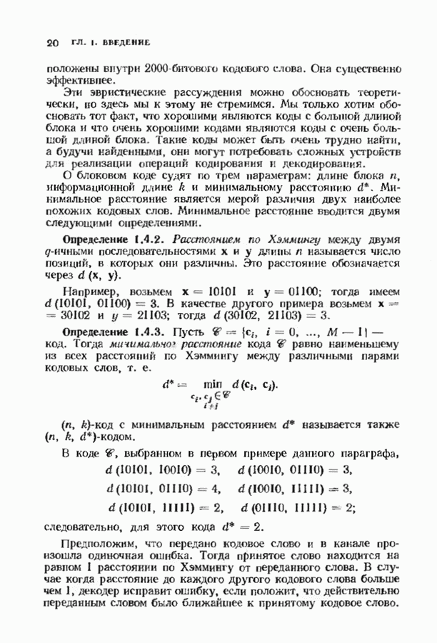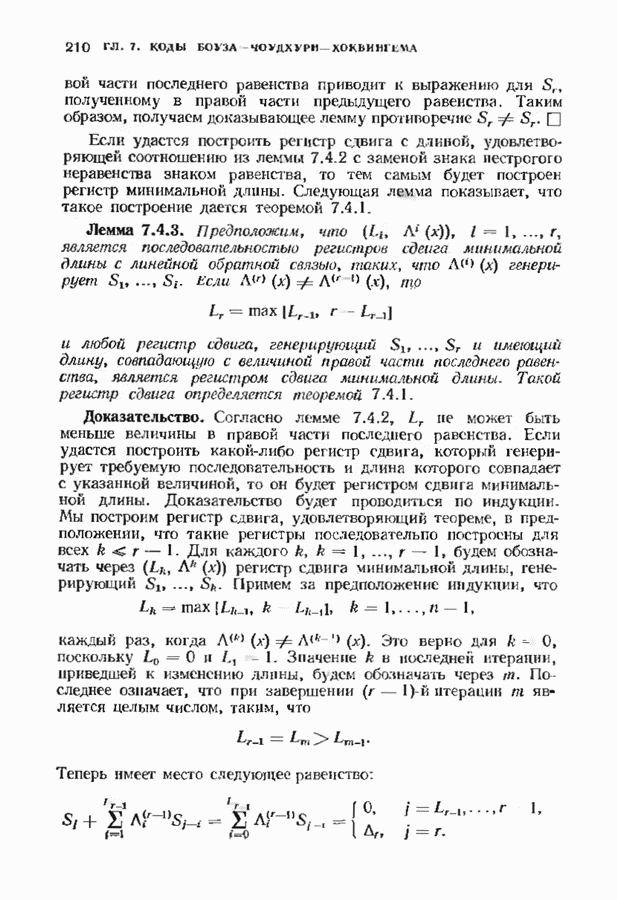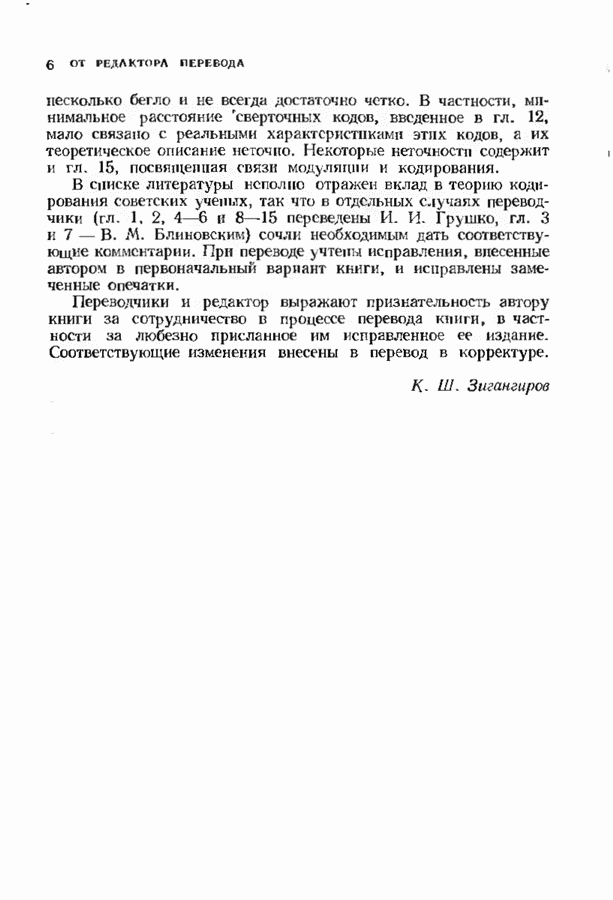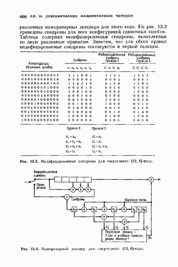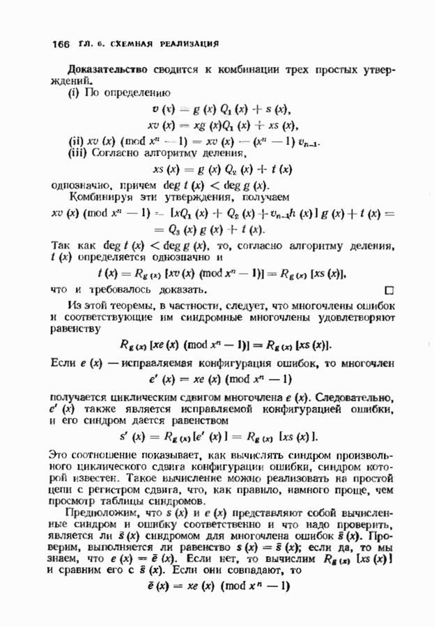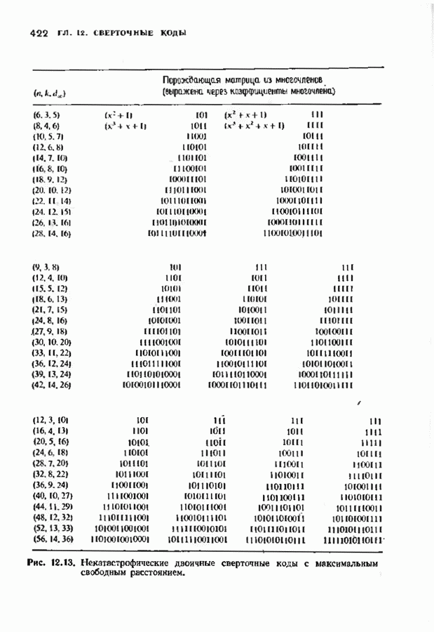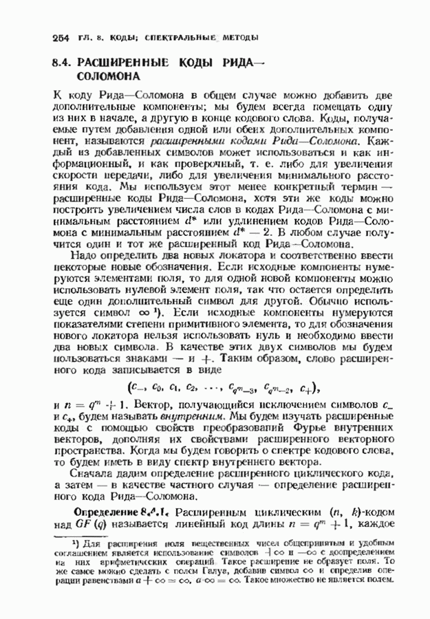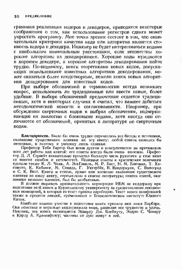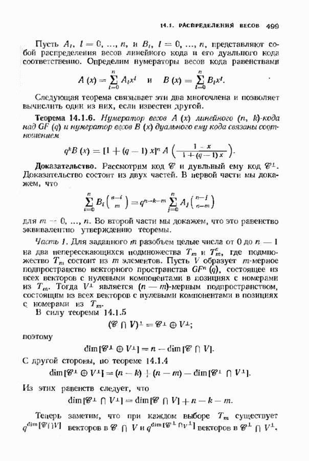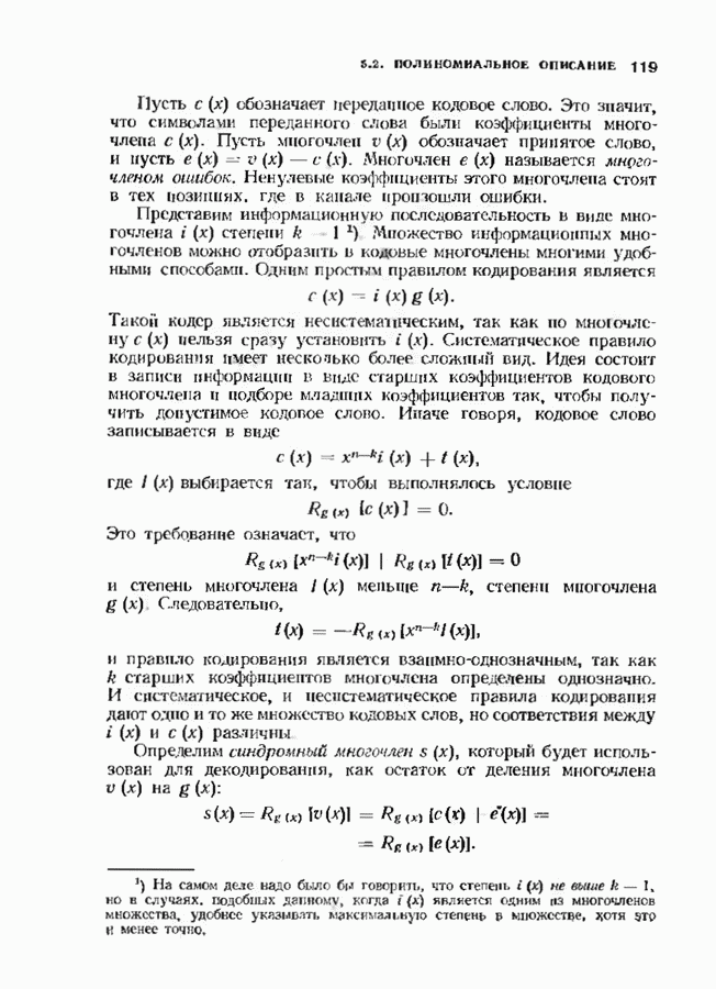 Если произошла только одна ошибка, то одна из оценок, даваемых проверочными суммами, будет неверна; мажоритарное решение дает значение Аналогично может быть продекодирован любой информационный символ, который умножается на одну из строк матрицы После того как эти информационные символы найдены, их вклад в кодовое слово вычитается из принятого слова. Это эквивалентно тому, что мы получаем слово кода Рида — Маллера Этот процесс повторяется до тех пор, пока не будут найдены все информационные биты. ЗАДАЧИ(см. скан) (см. скан) (см. скан) ЗАМЕЧАНИЯИзучение линейных кодов восходит к ранним работам Хэмминга [1950] и Голея 119491. Большинство положений, используемых в настоящее время при изучении линейных колов, заложено Слепяном [1956, 1960]: первые три параграфа тесно связаны с этими работами. Еще до этого Киксу 119537 обратил внимание на связь между линейными кодами и подпространствами векторных пространств. Коды с максимальным расстоянием впервые изучал Синглтон Двоичные коды Хэмминга как коды, исправляющие ошибки, впервые рассматривал Хэмминг, хотя подобные комбнпаторные структуры, рацее встречались в задачах статистики. Недвоичные коды Хэмминга были получены Голсем [1958] и Коком [1959]. Понятие совершенного кода впервые истречается у Голея, хотя он не пользовался таким термином. Делалось много попыток найти новые совершенные коды, но лишь отдельные из них увенчались успехом. В ряде работ Тиотявяйнен и Ван Лиит (работы завершились в 1974 и 1975 гг. соответственно) доказали, что не существует линейных (нетривиальных) совершенных кодов, отличных от кодов Хэмминга или Голея, и не существует нелинейных (нетривиальных) кодов, за исключением кодоп Васильева [1962] и Шёнхейма [1968]. Коды Рида-Маллера были получены Маллером [1954], и в этом же году Рид разработал алгоритм их декодирования. Этот алгоритм необычем тем, что принимает решение, основанное «а мажоритарной логике. Коды Рида-Маллера являются предшественниками обширных семейств мажоритарно декодируемых кодов, с которыми мы встретимся в следующих главах.