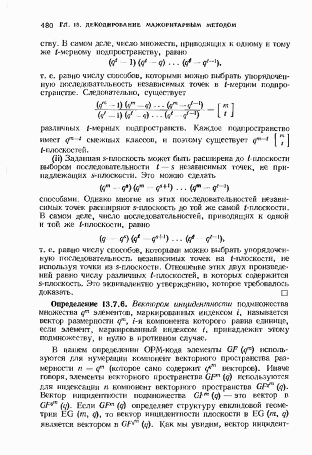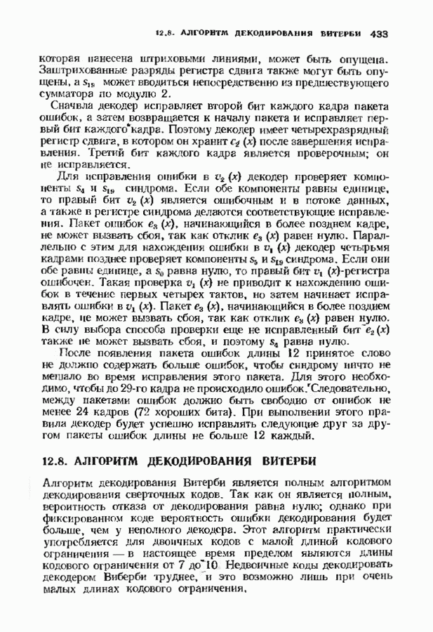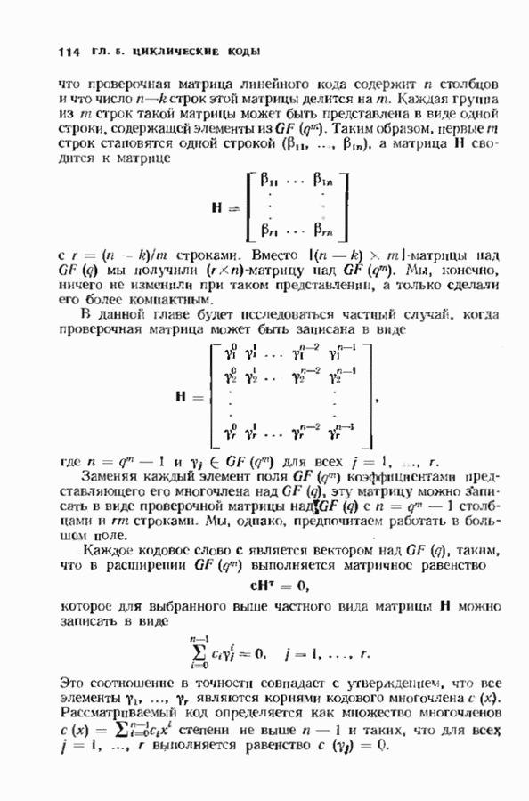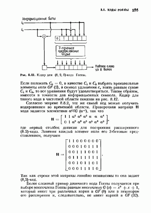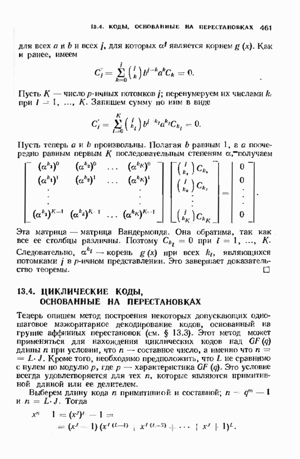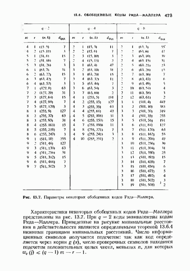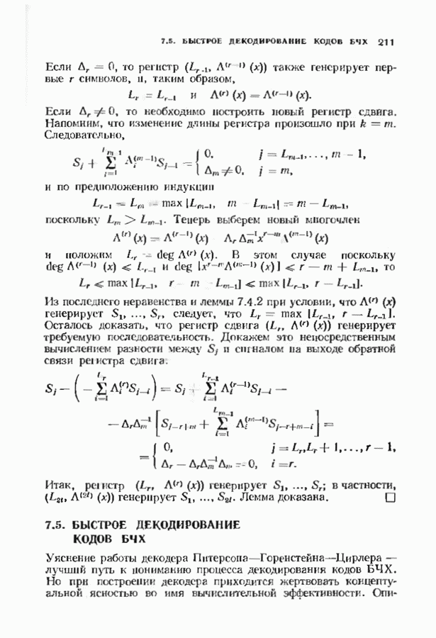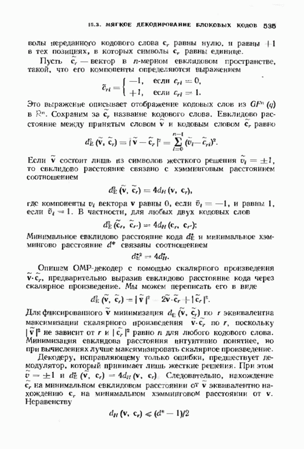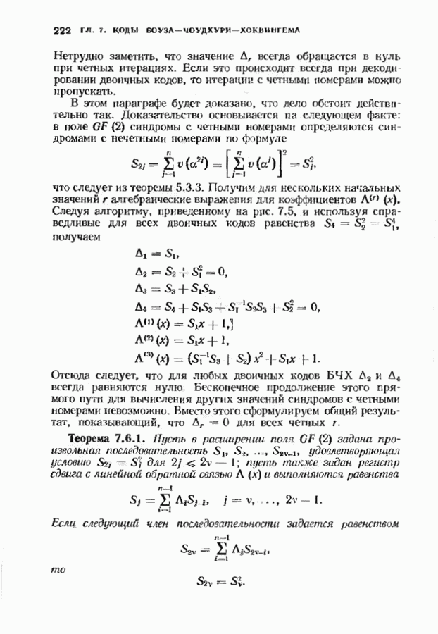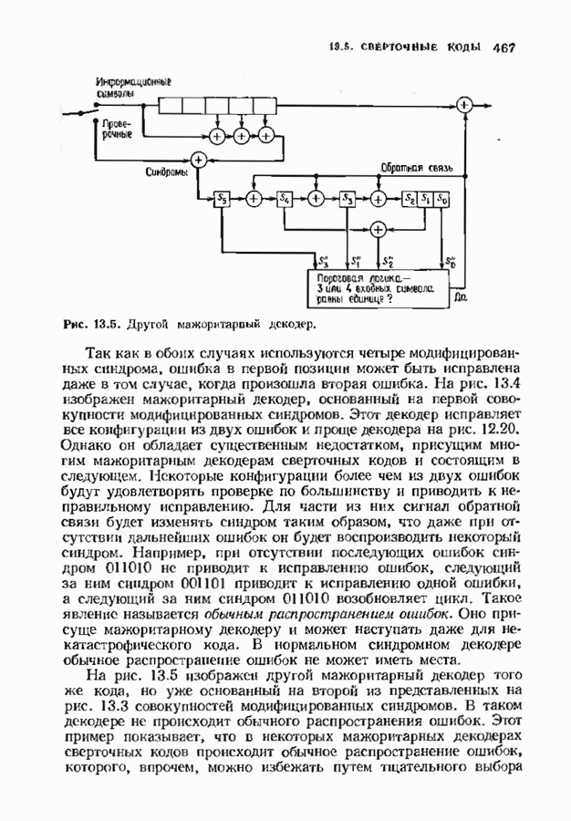 Если произошла только одна ошибка, то одна из оценок, даваемых проверочными суммами, будет неверна; мажоритарное решение дает значение Аналогично может быть продекодирован любой информационный символ, который умножается на одну из строк матрицы После того как эти информационные символы найдены, их вклад в кодовое слово вычитается из принятого слова. Это эквивалентно тому, что мы получаем слово кода Рида — Маллера Этот процесс повторяется до тех пор, пока не будут найдены все информационные биты. ЗАДАЧИ(см. скан) (см. скан) (см. скан) ЗАМЕЧАНИЯИзучение линейных кодов восходит к ранним работам Хэмминга [1950] и Голея 119491. Большинство положений, используемых в настоящее время при изучении линейных колов, заложено Слепяном [1956, 1960]: первые три параграфа тесно связаны с этими работами. Еще до этого Киксу 119537 обратил внимание на связь между линейными кодами и подпространствами векторных пространств. Коды с максимальным расстоянием впервые изучал Синглтон Двоичные коды Хэмминга как коды, исправляющие ошибки, впервые рассматривал Хэмминг, хотя подобные комбнпаторные структуры, рацее встречались в задачах статистики. Недвоичные коды Хэмминга были получены Голсем [1958] и Коком [1959]. Понятие совершенного кода впервые истречается у Голея, хотя он не пользовался таким термином. Делалось много попыток найти новые совершенные коды, но лишь отдельные из них увенчались успехом. В ряде работ Тиотявяйнен и Ван Лиит (работы завершились в 1974 и 1975 гг. соответственно) доказали, что не существует линейных (нетривиальных) совершенных кодов, отличных от кодов Хэмминга или Голея, и не существует нелинейных (нетривиальных) кодов, за исключением кодоп Васильева [1962] и Шёнхейма [1968]. Коды Рида-Маллера были получены Маллером [1954], и в этом же году Рид разработал алгоритм их декодирования. Этот алгоритм необычем тем, что принимает решение, основанное «а мажоритарной логике. Коды Рида-Маллера являются предшественниками обширных семейств мажоритарно декодируемых кодов, с которыми мы встретимся в следующих главах.