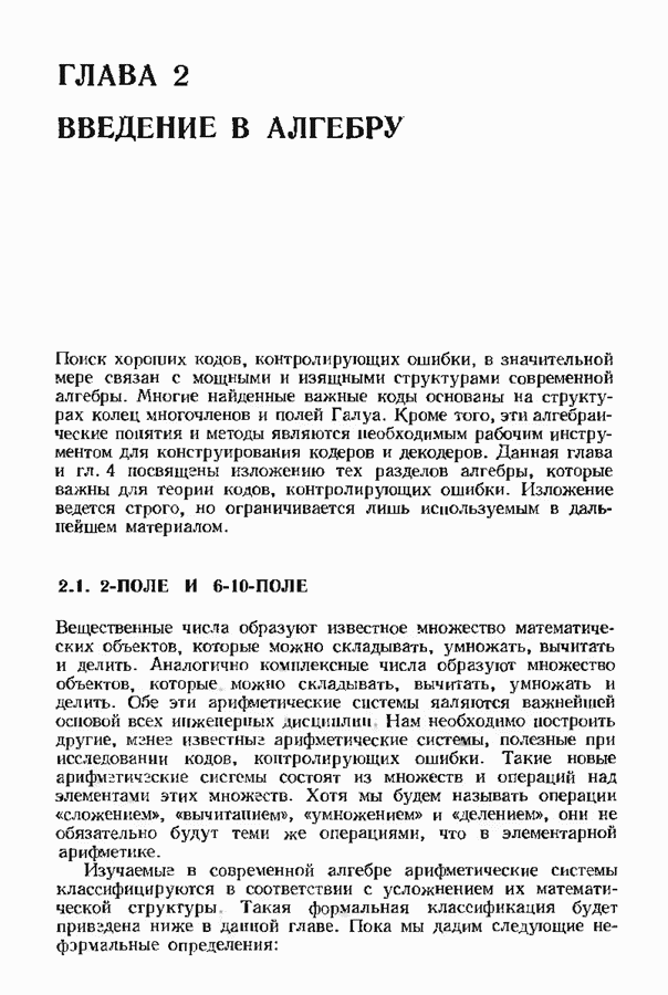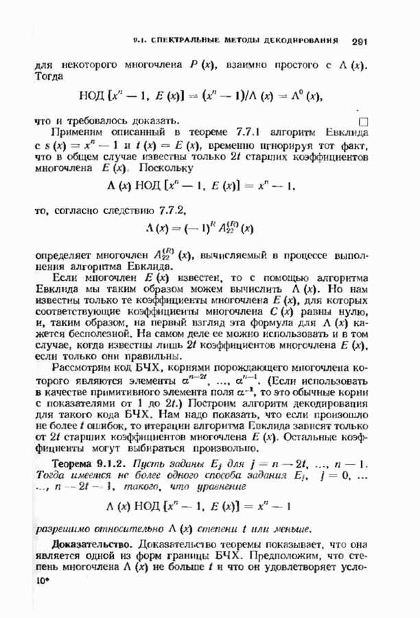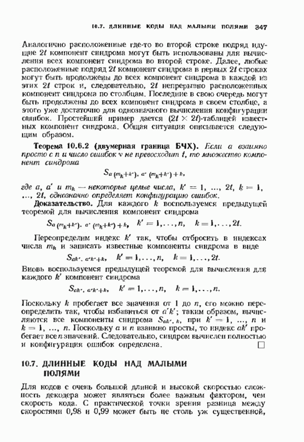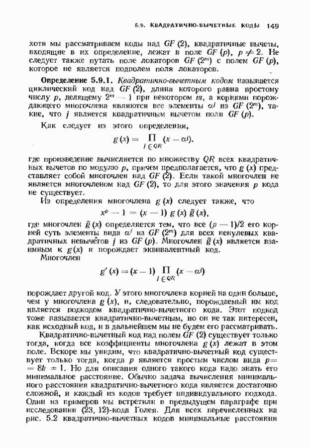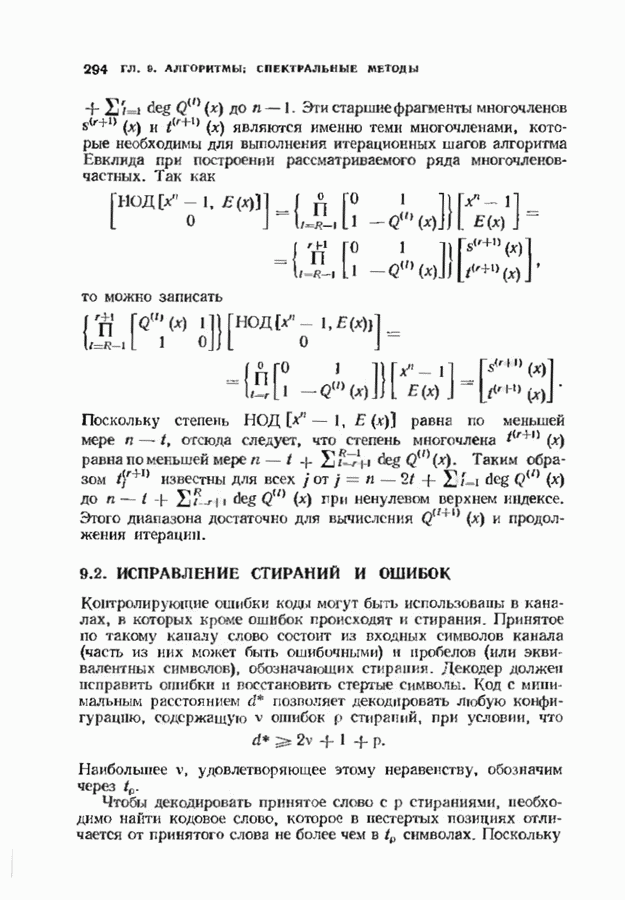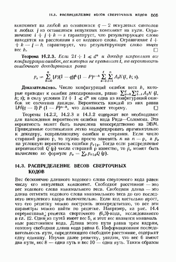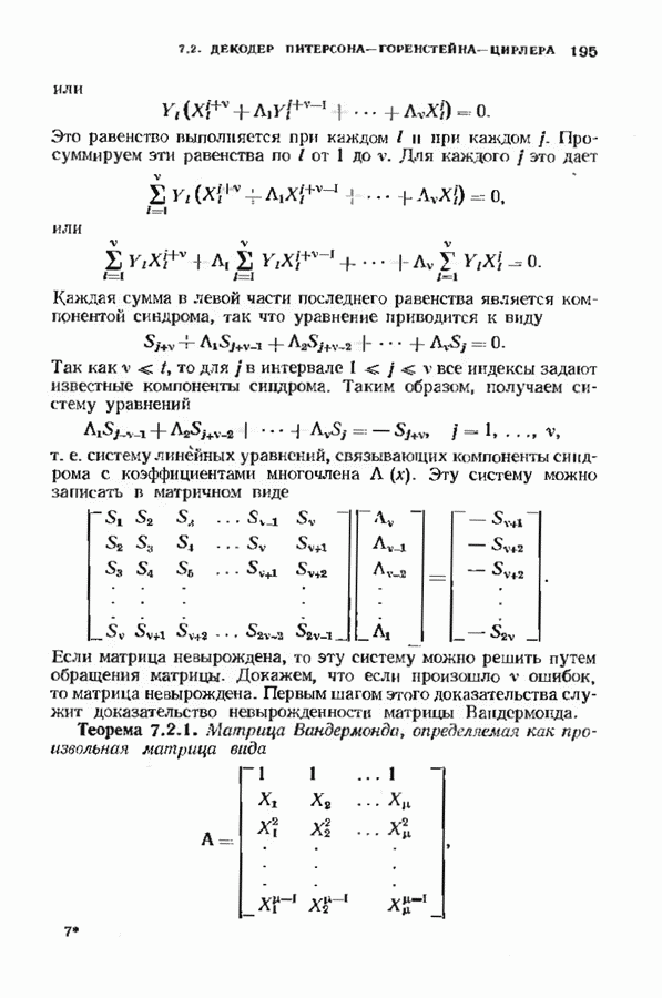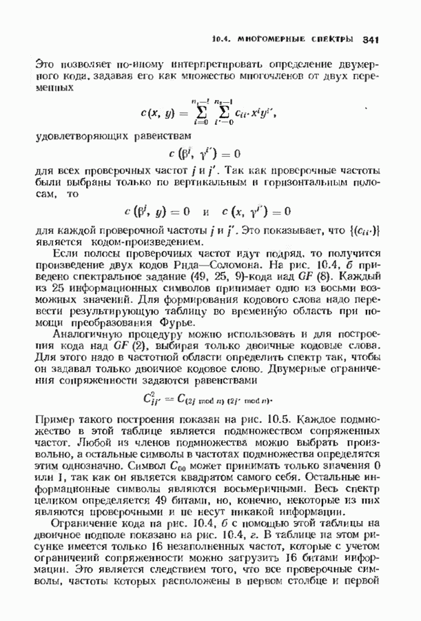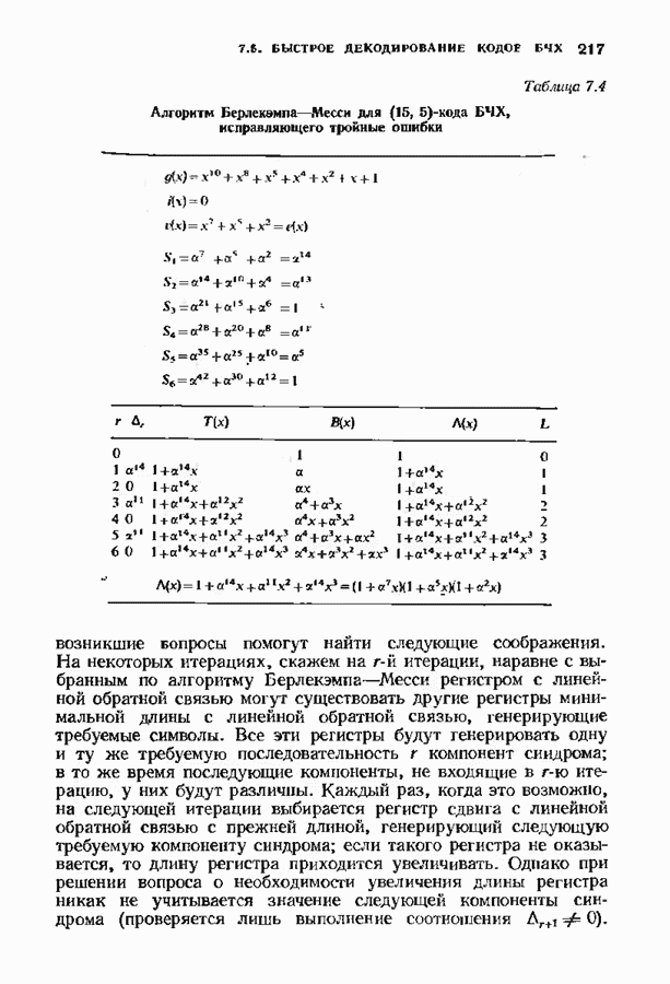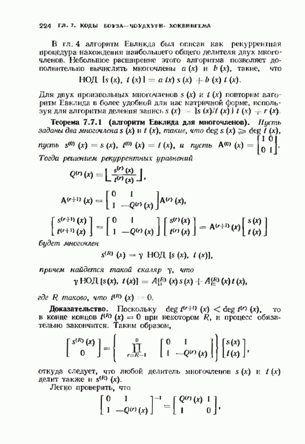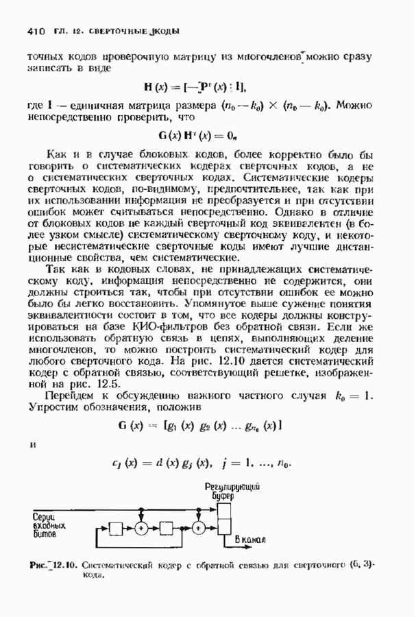 Если произошла только одна ошибка, то одна из оценок, даваемых проверочными суммами, будет неверна; мажоритарное решение дает значение Аналогично может быть продекодирован любой информационный символ, который умножается на одну из строк матрицы После того как эти информационные символы найдены, их вклад в кодовое слово вычитается из принятого слова. Это эквивалентно тому, что мы получаем слово кода Рида — Маллера Этот процесс повторяется до тех пор, пока не будут найдены все информационные биты. ЗАДАЧИ(см. скан) (см. скан) (см. скан) ЗАМЕЧАНИЯИзучение линейных кодов восходит к ранним работам Хэмминга [1950] и Голея 119491. Большинство положений, используемых в настоящее время при изучении линейных колов, заложено Слепяном [1956, 1960]: первые три параграфа тесно связаны с этими работами. Еще до этого Киксу 119537 обратил внимание на связь между линейными кодами и подпространствами векторных пространств. Коды с максимальным расстоянием впервые изучал Синглтон Двоичные коды Хэмминга как коды, исправляющие ошибки, впервые рассматривал Хэмминг, хотя подобные комбнпаторные структуры, рацее встречались в задачах статистики. Недвоичные коды Хэмминга были получены Голсем [1958] и Коком [1959]. Понятие совершенного кода впервые истречается у Голея, хотя он не пользовался таким термином. Делалось много попыток найти новые совершенные коды, но лишь отдельные из них увенчались успехом. В ряде работ Тиотявяйнен и Ван Лиит (работы завершились в 1974 и 1975 гг. соответственно) доказали, что не существует линейных (нетривиальных) совершенных кодов, отличных от кодов Хэмминга или Голея, и не существует нелинейных (нетривиальных) кодов, за исключением кодоп Васильева [1962] и Шёнхейма [1968]. Коды Рида-Маллера были получены Маллером [1954], и в этом же году Рид разработал алгоритм их декодирования. Этот алгоритм необычем тем, что принимает решение, основанное «а мажоритарной логике. Коды Рида-Маллера являются предшественниками обширных семейств мажоритарно декодируемых кодов, с которыми мы встретимся в следующих главах.