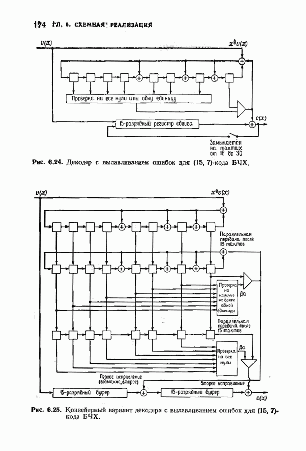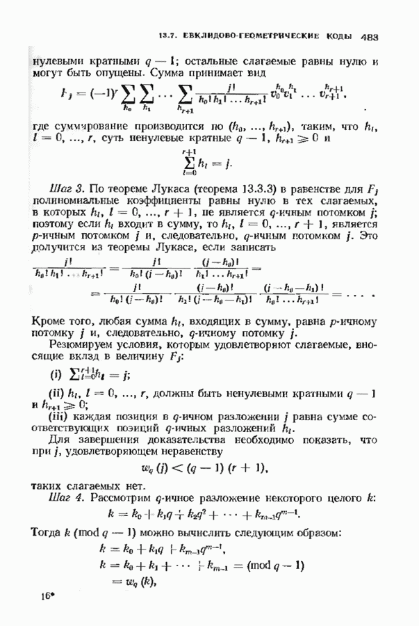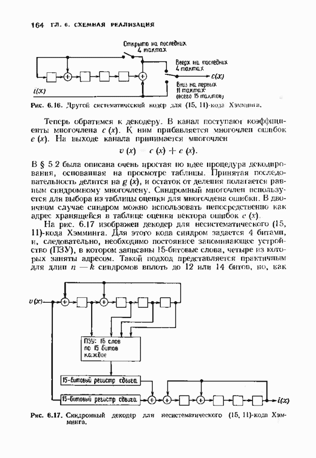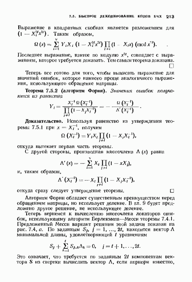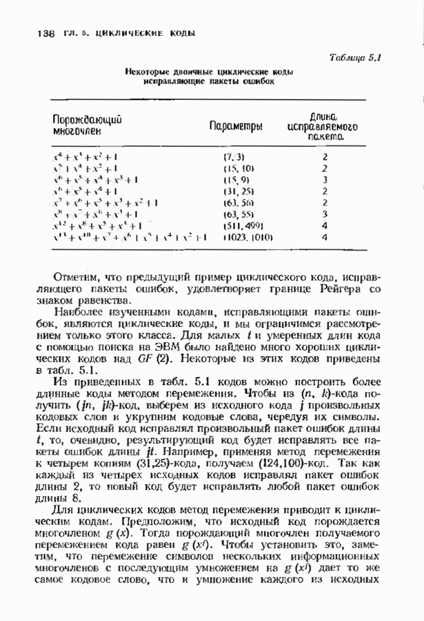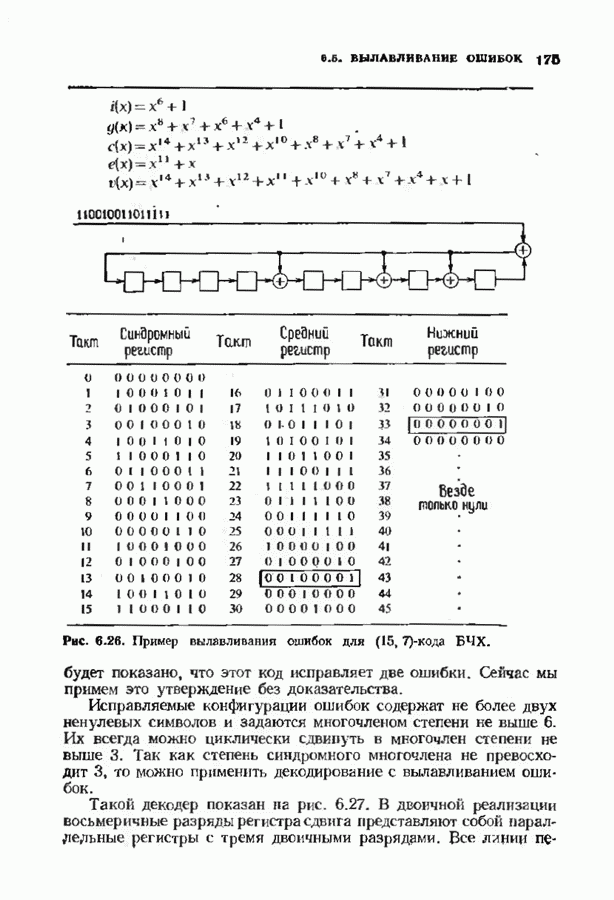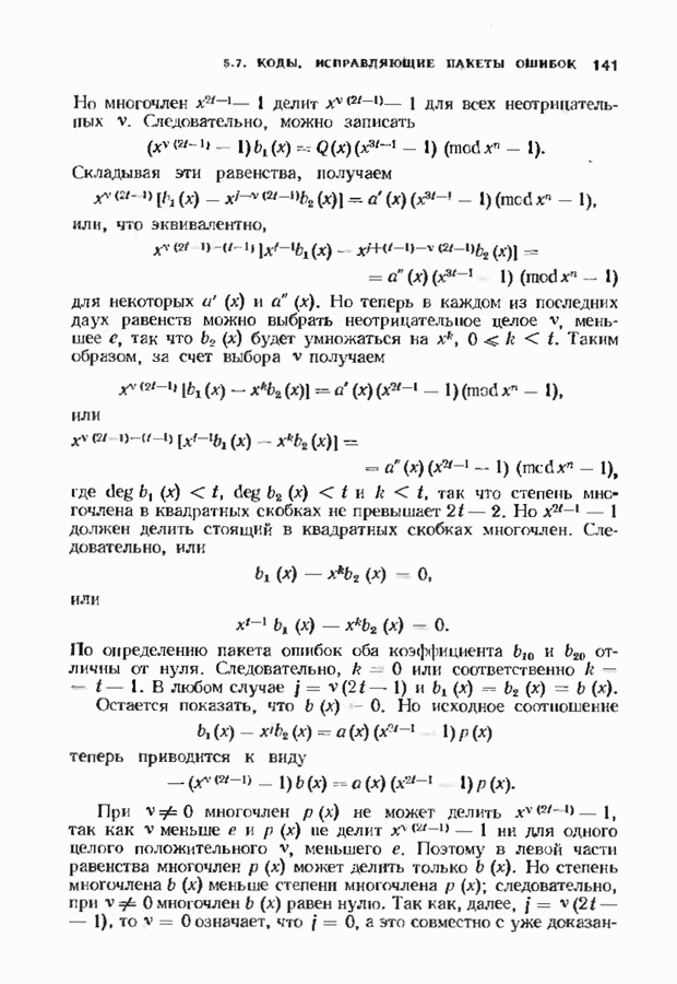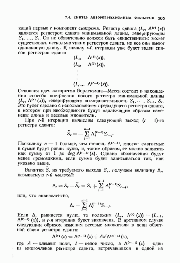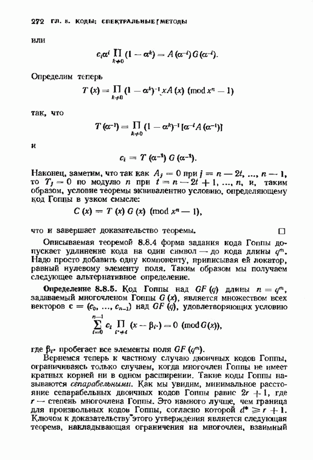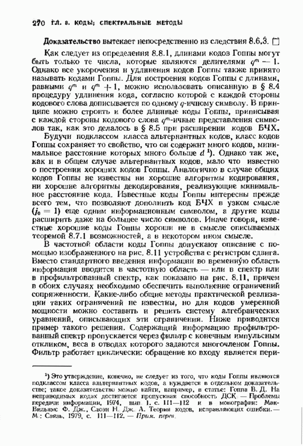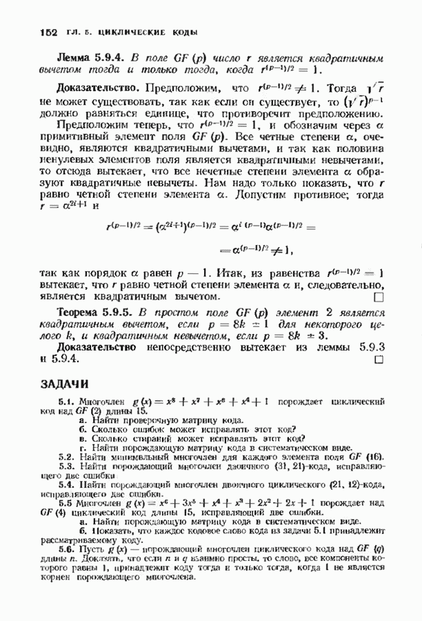 Если произошла только одна ошибка, то одна из оценок, даваемых проверочными суммами, будет неверна; мажоритарное решение дает значение Аналогично может быть продекодирован любой информационный символ, который умножается на одну из строк матрицы После того как эти информационные символы найдены, их вклад в кодовое слово вычитается из принятого слова. Это эквивалентно тому, что мы получаем слово кода Рида — Маллера Этот процесс повторяется до тех пор, пока не будут найдены все информационные биты. ЗАДАЧИ(см. скан) (см. скан) (см. скан) ЗАМЕЧАНИЯИзучение линейных кодов восходит к ранним работам Хэмминга [1950] и Голея 119491. Большинство положений, используемых в настоящее время при изучении линейных колов, заложено Слепяном [1956, 1960]: первые три параграфа тесно связаны с этими работами. Еще до этого Киксу 119537 обратил внимание на связь между линейными кодами и подпространствами векторных пространств. Коды с максимальным расстоянием впервые изучал Синглтон Двоичные коды Хэмминга как коды, исправляющие ошибки, впервые рассматривал Хэмминг, хотя подобные комбнпаторные структуры, рацее встречались в задачах статистики. Недвоичные коды Хэмминга были получены Голсем [1958] и Коком [1959]. Понятие совершенного кода впервые истречается у Голея, хотя он не пользовался таким термином. Делалось много попыток найти новые совершенные коды, но лишь отдельные из них увенчались успехом. В ряде работ Тиотявяйнен и Ван Лиит (работы завершились в 1974 и 1975 гг. соответственно) доказали, что не существует линейных (нетривиальных) совершенных кодов, отличных от кодов Хэмминга или Голея, и не существует нелинейных (нетривиальных) кодов, за исключением кодоп Васильева [1962] и Шёнхейма [1968]. Коды Рида-Маллера были получены Маллером [1954], и в этом же году Рид разработал алгоритм их декодирования. Этот алгоритм необычем тем, что принимает решение, основанное «а мажоритарной логике. Коды Рида-Маллера являются предшественниками обширных семейств мажоритарно декодируемых кодов, с которыми мы встретимся в следующих главах.
