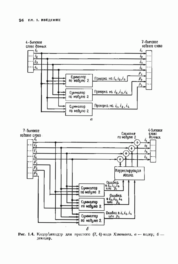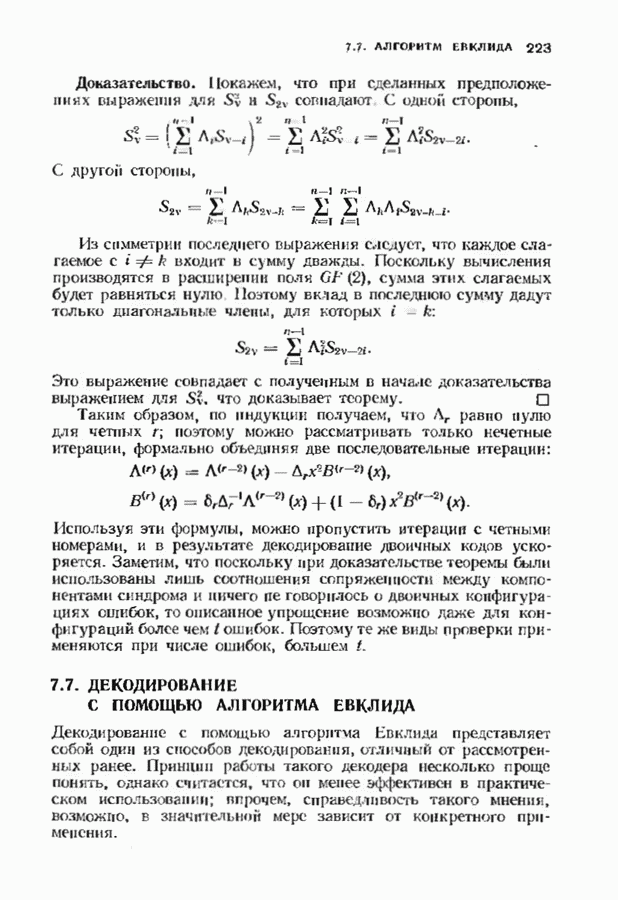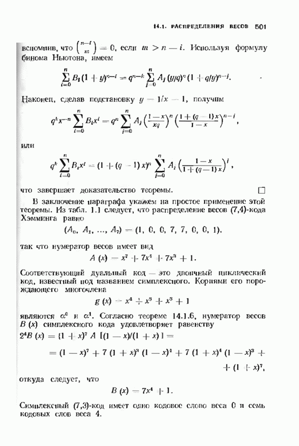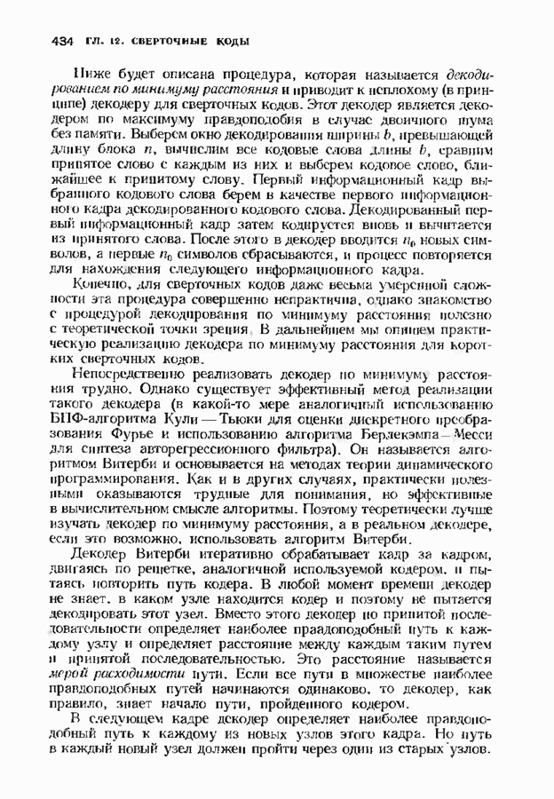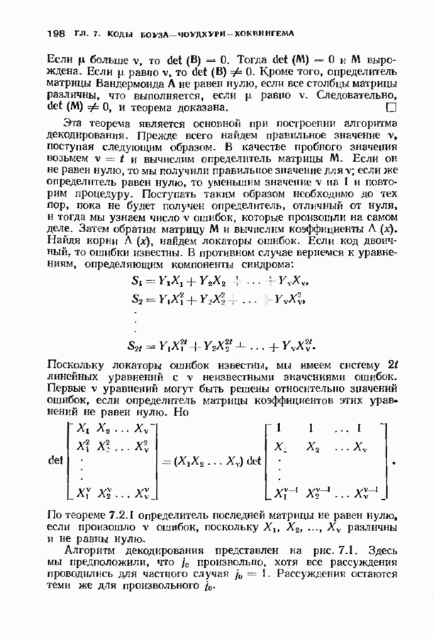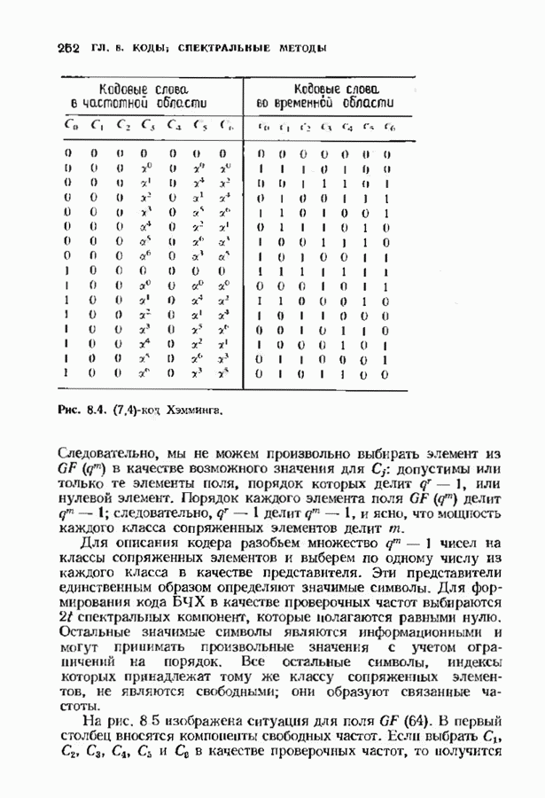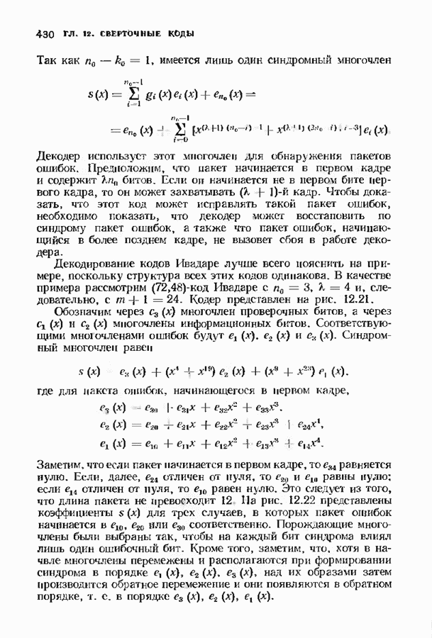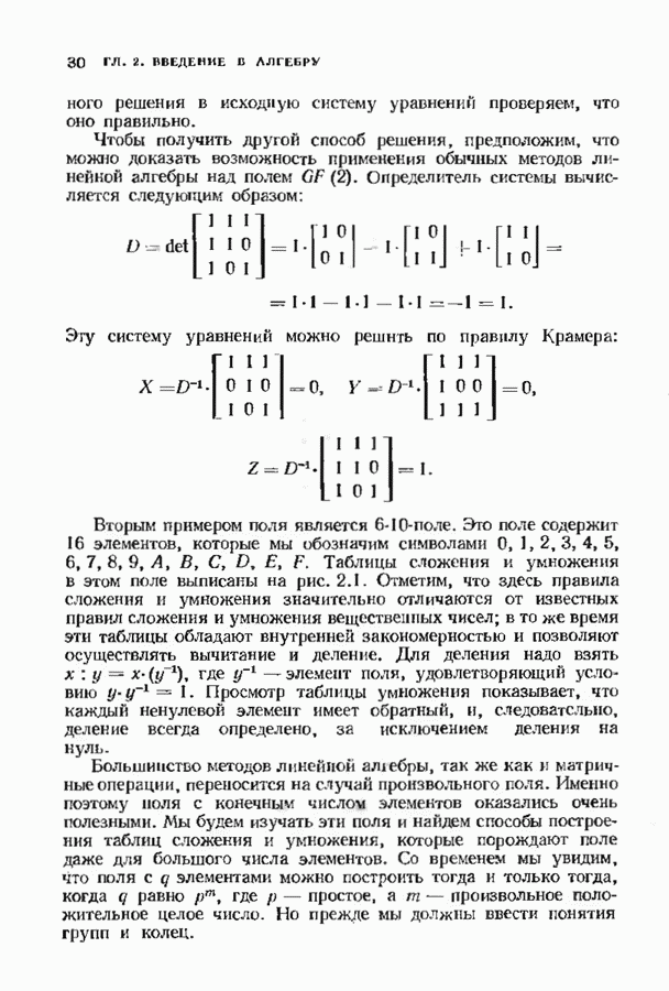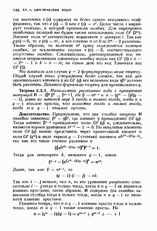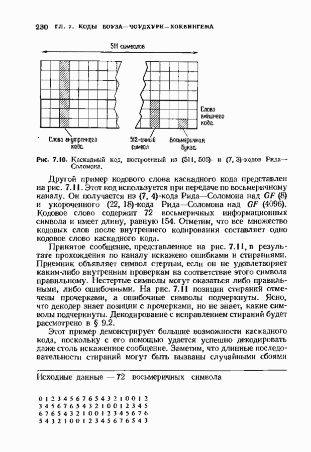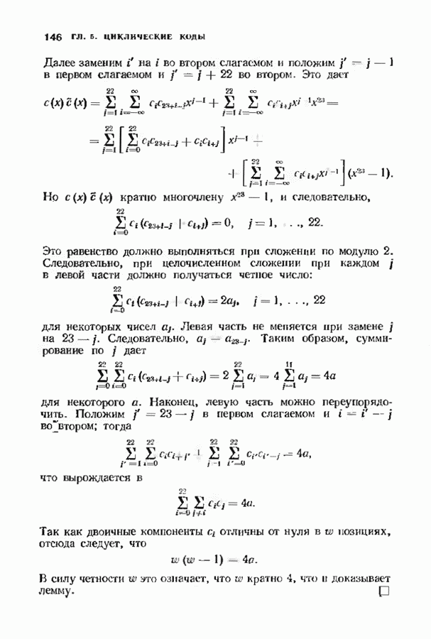 Если произошла только одна ошибка, то одна из оценок, даваемых проверочными суммами, будет неверна; мажоритарное решение дает значение Аналогично может быть продекодирован любой информационный символ, который умножается на одну из строк матрицы После того как эти информационные символы найдены, их вклад в кодовое слово вычитается из принятого слова. Это эквивалентно тому, что мы получаем слово кода Рида — Маллера Этот процесс повторяется до тех пор, пока не будут найдены все информационные биты. ЗАДАЧИ(см. скан) (см. скан) (см. скан) ЗАМЕЧАНИЯИзучение линейных кодов восходит к ранним работам Хэмминга [1950] и Голея 119491. Большинство положений, используемых в настоящее время при изучении линейных колов, заложено Слепяном [1956, 1960]: первые три параграфа тесно связаны с этими работами. Еще до этого Киксу 119537 обратил внимание на связь между линейными кодами и подпространствами векторных пространств. Коды с максимальным расстоянием впервые изучал Синглтон Двоичные коды Хэмминга как коды, исправляющие ошибки, впервые рассматривал Хэмминг, хотя подобные комбнпаторные структуры, рацее встречались в задачах статистики. Недвоичные коды Хэмминга были получены Голсем [1958] и Коком [1959]. Понятие совершенного кода впервые истречается у Голея, хотя он не пользовался таким термином. Делалось много попыток найти новые совершенные коды, но лишь отдельные из них увенчались успехом. В ряде работ Тиотявяйнен и Ван Лиит (работы завершились в 1974 и 1975 гг. соответственно) доказали, что не существует линейных (нетривиальных) совершенных кодов, отличных от кодов Хэмминга или Голея, и не существует нелинейных (нетривиальных) кодов, за исключением кодоп Васильева [1962] и Шёнхейма [1968]. Коды Рида-Маллера были получены Маллером [1954], и в этом же году Рид разработал алгоритм их декодирования. Этот алгоритм необычем тем, что принимает решение, основанное «а мажоритарной логике. Коды Рида-Маллера являются предшественниками обширных семейств мажоритарно декодируемых кодов, с которыми мы встретимся в следующих главах.