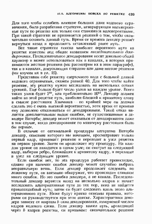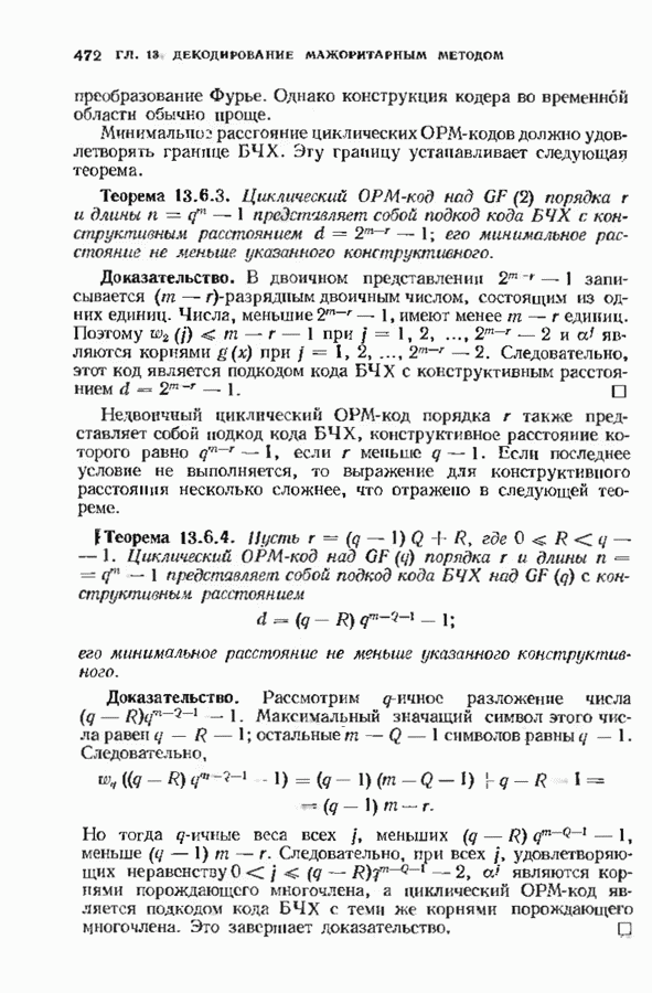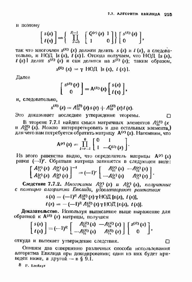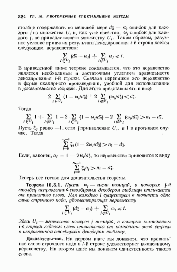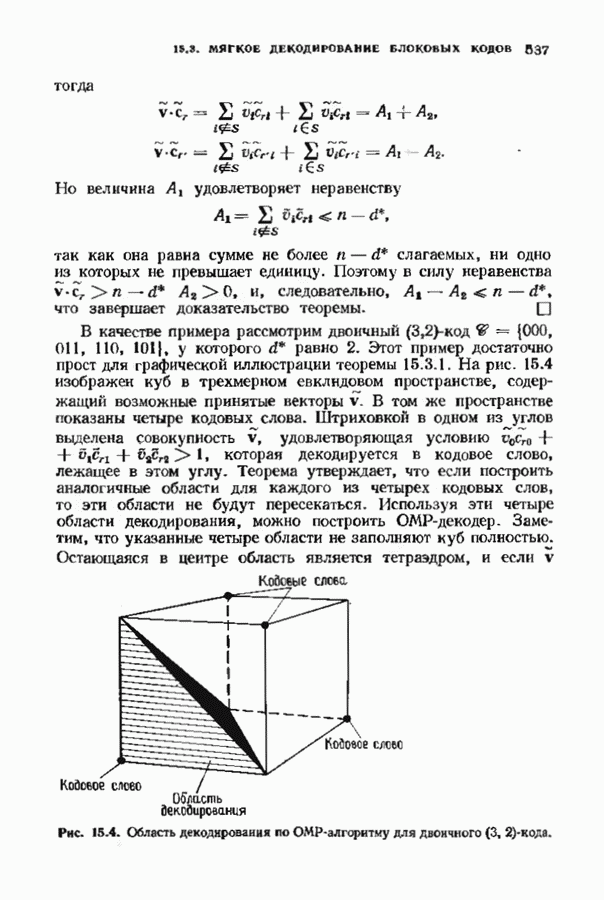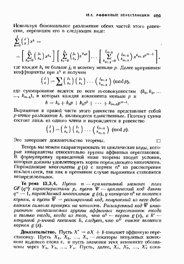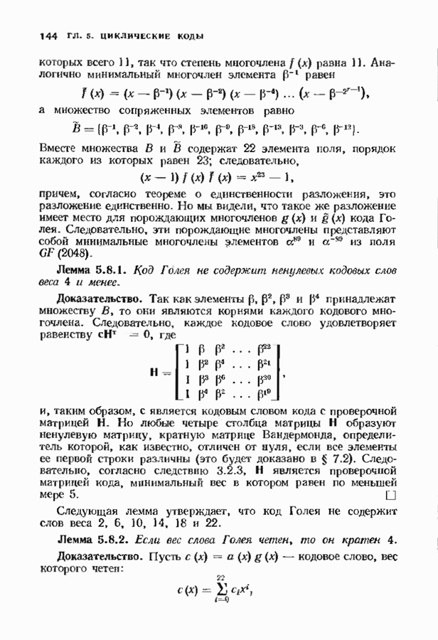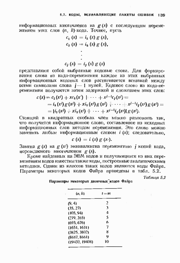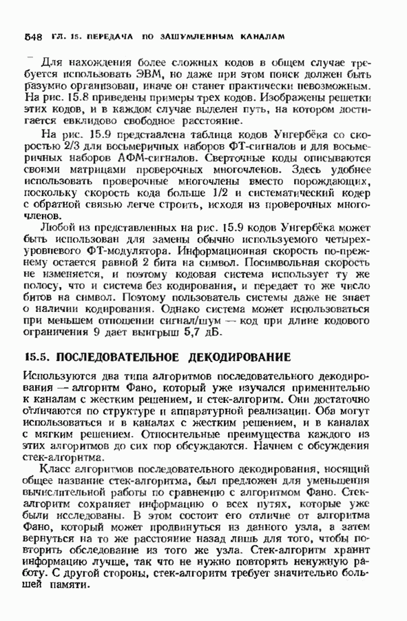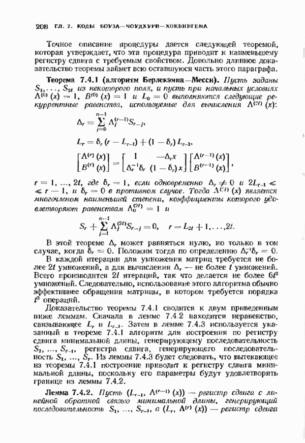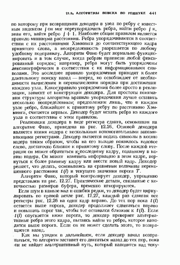 Если произошла только одна ошибка, то одна из оценок, даваемых проверочными суммами, будет неверна; мажоритарное решение дает значение Аналогично может быть продекодирован любой информационный символ, который умножается на одну из строк матрицы После того как эти информационные символы найдены, их вклад в кодовое слово вычитается из принятого слова. Это эквивалентно тому, что мы получаем слово кода Рида — Маллера Этот процесс повторяется до тех пор, пока не будут найдены все информационные биты. ЗАДАЧИ(см. скан) (см. скан) (см. скан) ЗАМЕЧАНИЯИзучение линейных кодов восходит к ранним работам Хэмминга [1950] и Голея 119491. Большинство положений, используемых в настоящее время при изучении линейных колов, заложено Слепяном [1956, 1960]: первые три параграфа тесно связаны с этими работами. Еще до этого Киксу 119537 обратил внимание на связь между линейными кодами и подпространствами векторных пространств. Коды с максимальным расстоянием впервые изучал Синглтон Двоичные коды Хэмминга как коды, исправляющие ошибки, впервые рассматривал Хэмминг, хотя подобные комбнпаторные структуры, рацее встречались в задачах статистики. Недвоичные коды Хэмминга были получены Голсем [1958] и Коком [1959]. Понятие совершенного кода впервые истречается у Голея, хотя он не пользовался таким термином. Делалось много попыток найти новые совершенные коды, но лишь отдельные из них увенчались успехом. В ряде работ Тиотявяйнен и Ван Лиит (работы завершились в 1974 и 1975 гг. соответственно) доказали, что не существует линейных (нетривиальных) совершенных кодов, отличных от кодов Хэмминга или Голея, и не существует нелинейных (нетривиальных) кодов, за исключением кодоп Васильева [1962] и Шёнхейма [1968]. Коды Рида-Маллера были получены Маллером [1954], и в этом же году Рид разработал алгоритм их декодирования. Этот алгоритм необычем тем, что принимает решение, основанное «а мажоритарной логике. Коды Рида-Маллера являются предшественниками обширных семейств мажоритарно декодируемых кодов, с которыми мы встретимся в следующих главах.