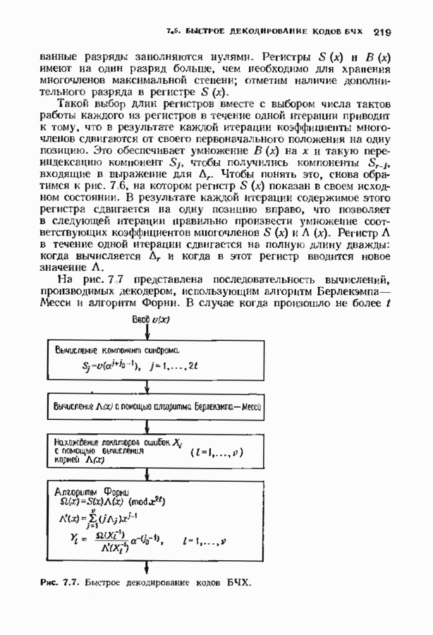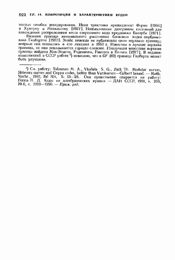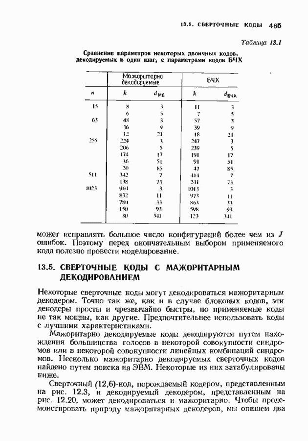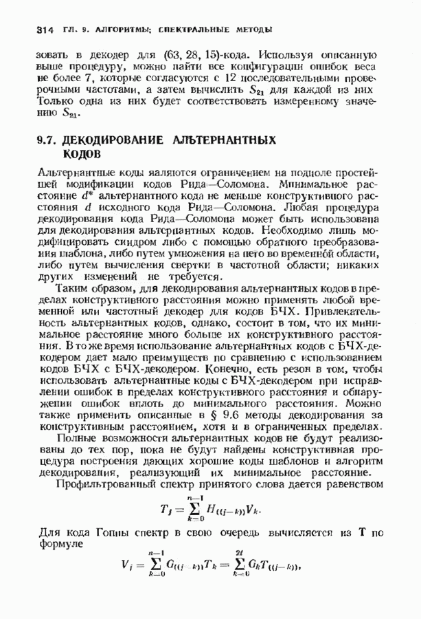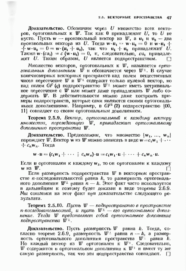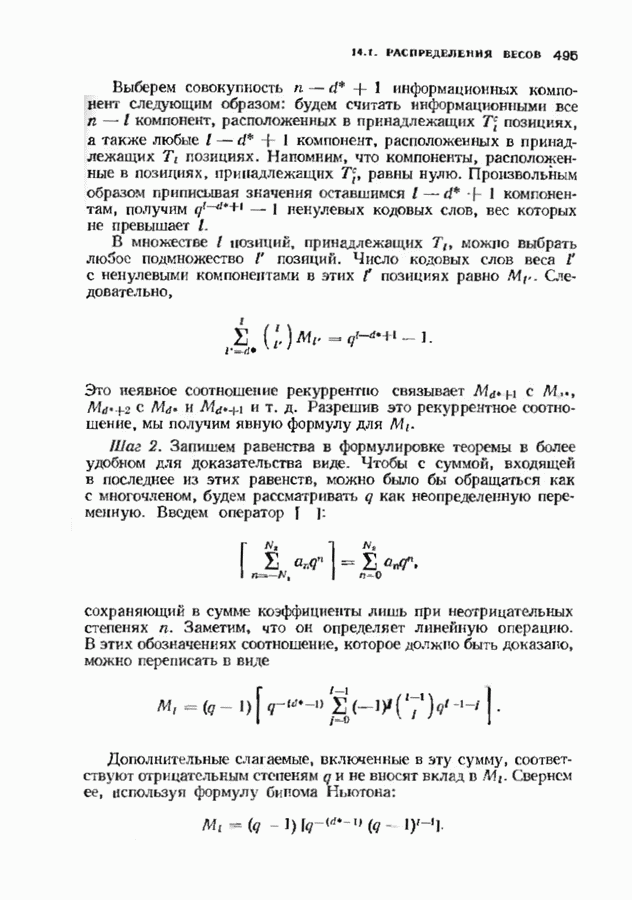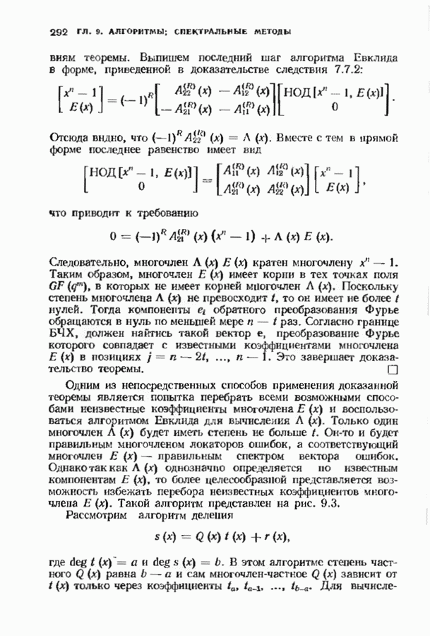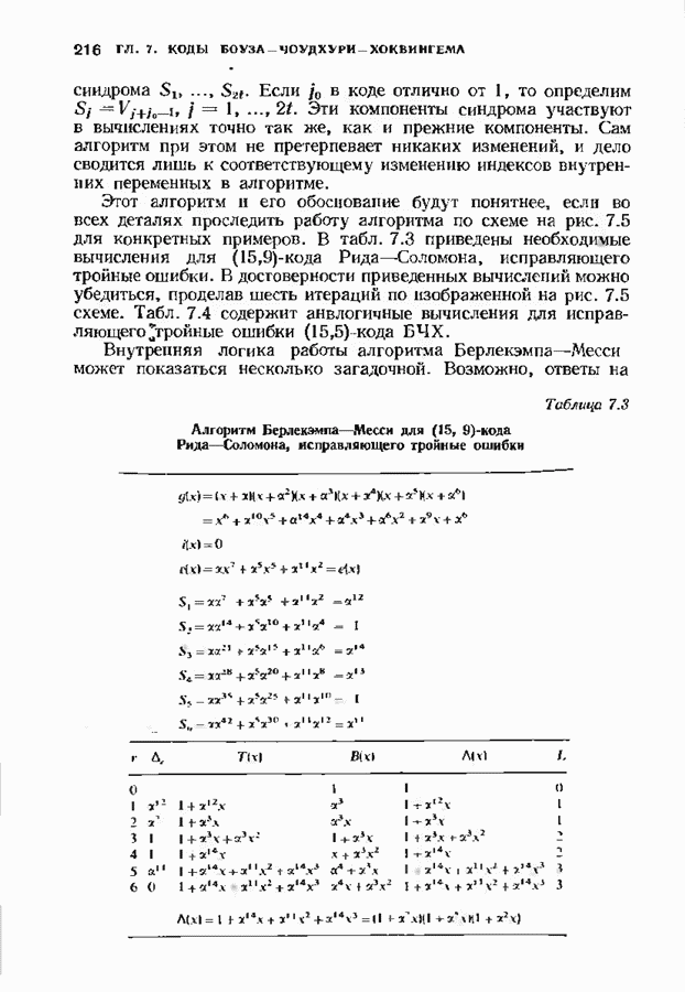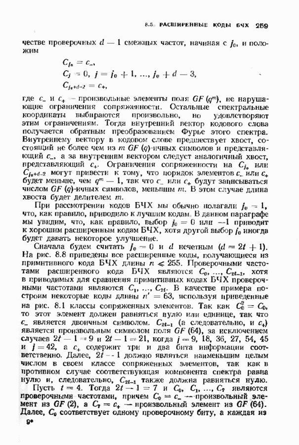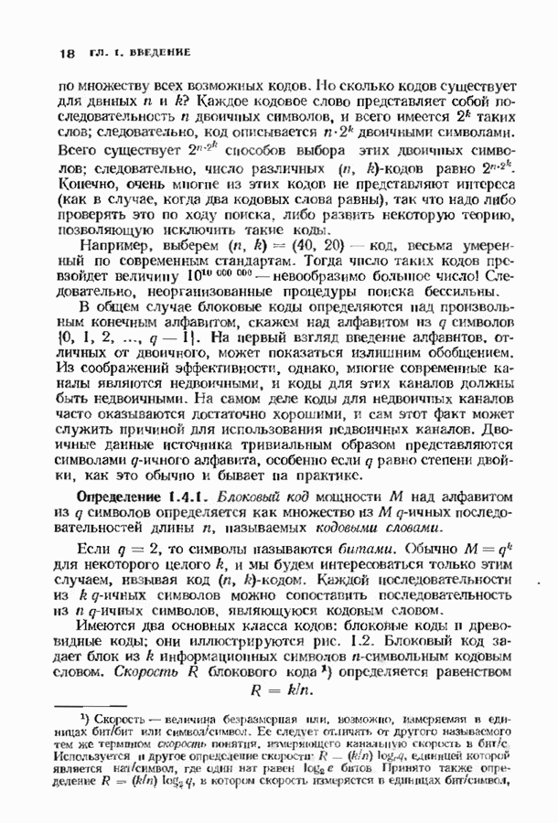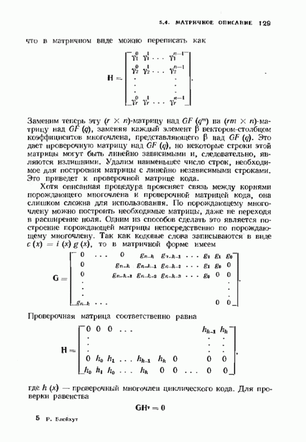 Если произошла только одна ошибка, то одна из оценок, даваемых проверочными суммами, будет неверна; мажоритарное решение дает значение Аналогично может быть продекодирован любой информационный символ, который умножается на одну из строк матрицы После того как эти информационные символы найдены, их вклад в кодовое слово вычитается из принятого слова. Это эквивалентно тому, что мы получаем слово кода Рида — Маллера Этот процесс повторяется до тех пор, пока не будут найдены все информационные биты. ЗАДАЧИ(см. скан) (см. скан) (см. скан) ЗАМЕЧАНИЯИзучение линейных кодов восходит к ранним работам Хэмминга [1950] и Голея 119491. Большинство положений, используемых в настоящее время при изучении линейных колов, заложено Слепяном [1956, 1960]: первые три параграфа тесно связаны с этими работами. Еще до этого Киксу 119537 обратил внимание на связь между линейными кодами и подпространствами векторных пространств. Коды с максимальным расстоянием впервые изучал Синглтон Двоичные коды Хэмминга как коды, исправляющие ошибки, впервые рассматривал Хэмминг, хотя подобные комбнпаторные структуры, рацее встречались в задачах статистики. Недвоичные коды Хэмминга были получены Голсем [1958] и Коком [1959]. Понятие совершенного кода впервые истречается у Голея, хотя он не пользовался таким термином. Делалось много попыток найти новые совершенные коды, но лишь отдельные из них увенчались успехом. В ряде работ Тиотявяйнен и Ван Лиит (работы завершились в 1974 и 1975 гг. соответственно) доказали, что не существует линейных (нетривиальных) совершенных кодов, отличных от кодов Хэмминга или Голея, и не существует нелинейных (нетривиальных) кодов, за исключением кодоп Васильева [1962] и Шёнхейма [1968]. Коды Рида-Маллера были получены Маллером [1954], и в этом же году Рид разработал алгоритм их декодирования. Этот алгоритм необычем тем, что принимает решение, основанное «а мажоритарной логике. Коды Рида-Маллера являются предшественниками обширных семейств мажоритарно декодируемых кодов, с которыми мы встретимся в следующих главах.