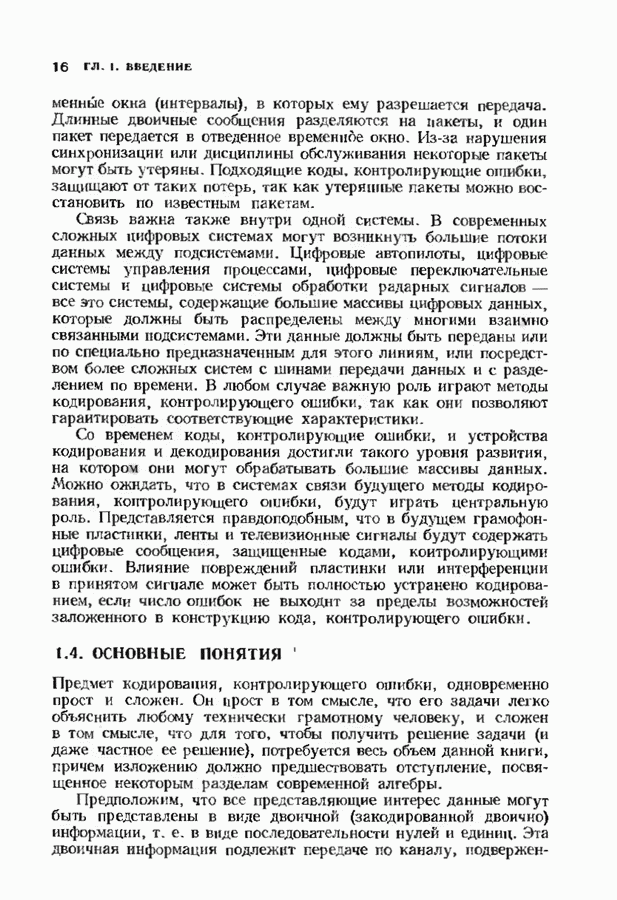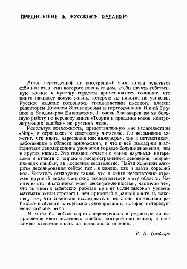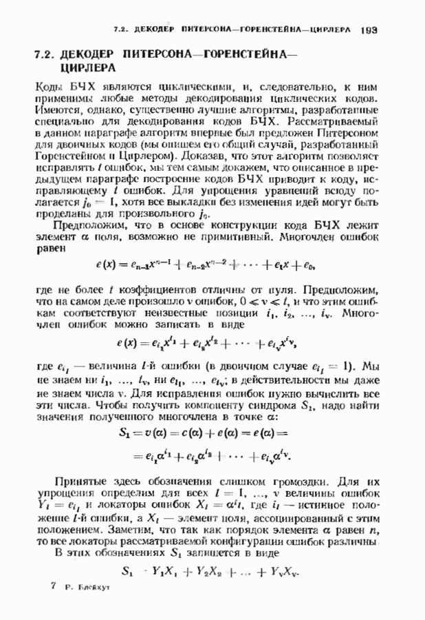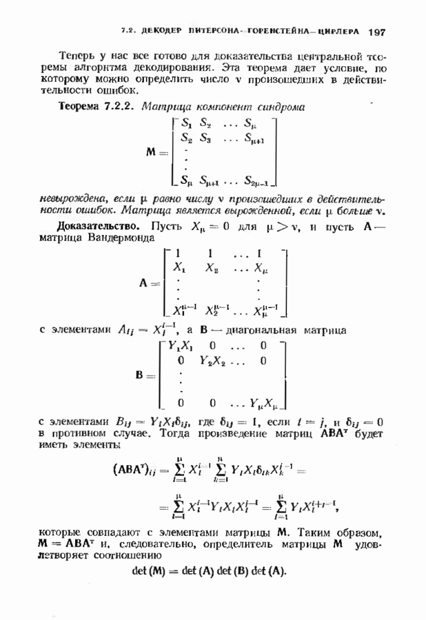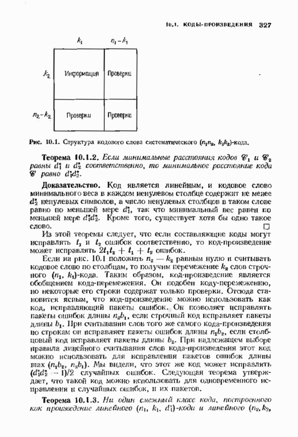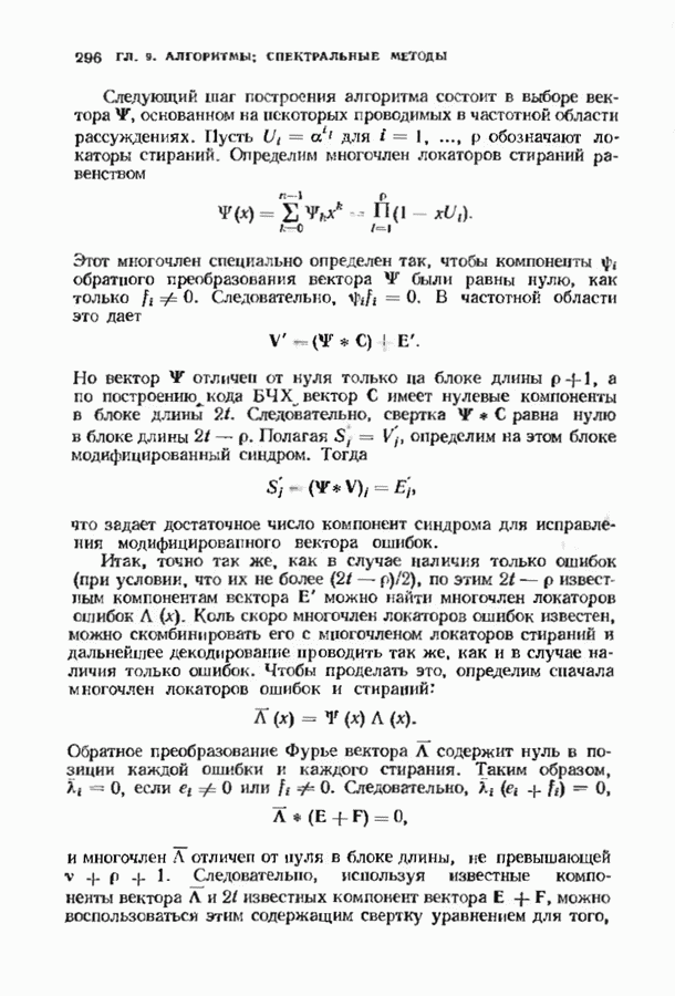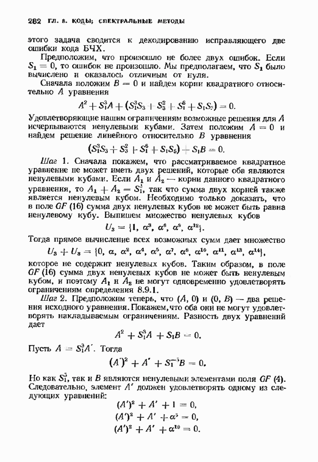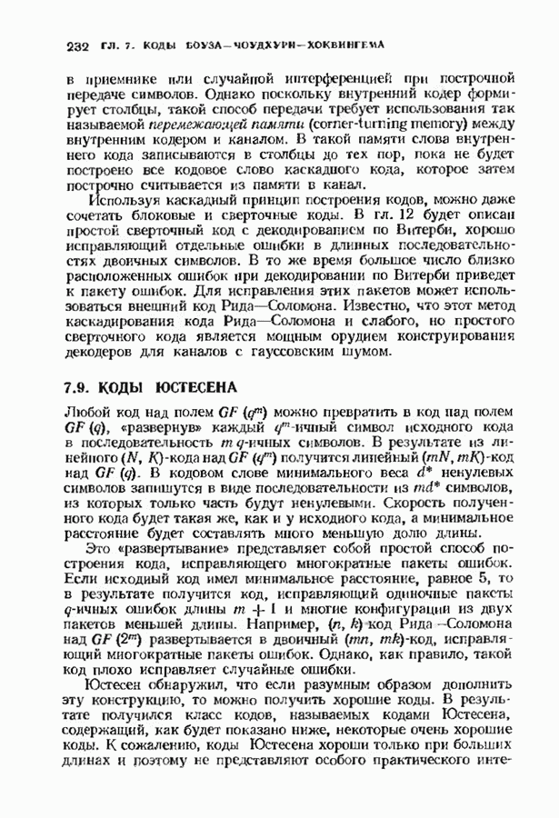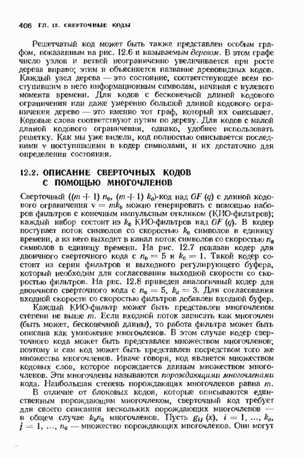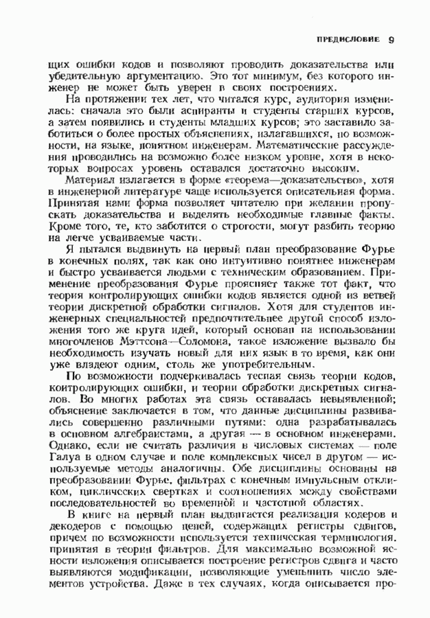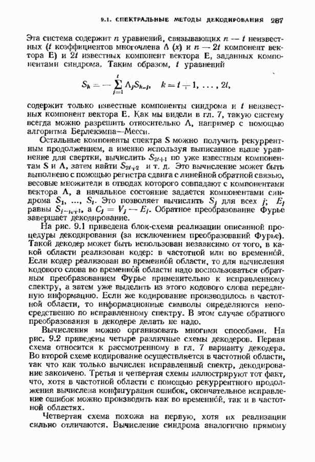 Если произошла только одна ошибка, то одна из оценок, даваемых проверочными суммами, будет неверна; мажоритарное решение дает значение Аналогично может быть продекодирован любой информационный символ, который умножается на одну из строк матрицы После того как эти информационные символы найдены, их вклад в кодовое слово вычитается из принятого слова. Это эквивалентно тому, что мы получаем слово кода Рида — Маллера Этот процесс повторяется до тех пор, пока не будут найдены все информационные биты. ЗАДАЧИ(см. скан) (см. скан) (см. скан) ЗАМЕЧАНИЯИзучение линейных кодов восходит к ранним работам Хэмминга [1950] и Голея 119491. Большинство положений, используемых в настоящее время при изучении линейных колов, заложено Слепяном [1956, 1960]: первые три параграфа тесно связаны с этими работами. Еще до этого Киксу 119537 обратил внимание на связь между линейными кодами и подпространствами векторных пространств. Коды с максимальным расстоянием впервые изучал Синглтон Двоичные коды Хэмминга как коды, исправляющие ошибки, впервые рассматривал Хэмминг, хотя подобные комбнпаторные структуры, рацее встречались в задачах статистики. Недвоичные коды Хэмминга были получены Голсем [1958] и Коком [1959]. Понятие совершенного кода впервые истречается у Голея, хотя он не пользовался таким термином. Делалось много попыток найти новые совершенные коды, но лишь отдельные из них увенчались успехом. В ряде работ Тиотявяйнен и Ван Лиит (работы завершились в 1974 и 1975 гг. соответственно) доказали, что не существует линейных (нетривиальных) совершенных кодов, отличных от кодов Хэмминга или Голея, и не существует нелинейных (нетривиальных) кодов, за исключением кодоп Васильева [1962] и Шёнхейма [1968]. Коды Рида-Маллера были получены Маллером [1954], и в этом же году Рид разработал алгоритм их декодирования. Этот алгоритм необычем тем, что принимает решение, основанное «а мажоритарной логике. Коды Рида-Маллера являются предшественниками обширных семейств мажоритарно декодируемых кодов, с которыми мы встретимся в следующих главах.