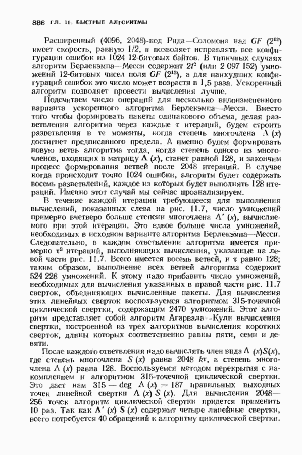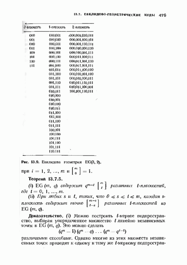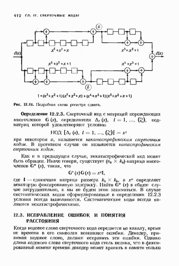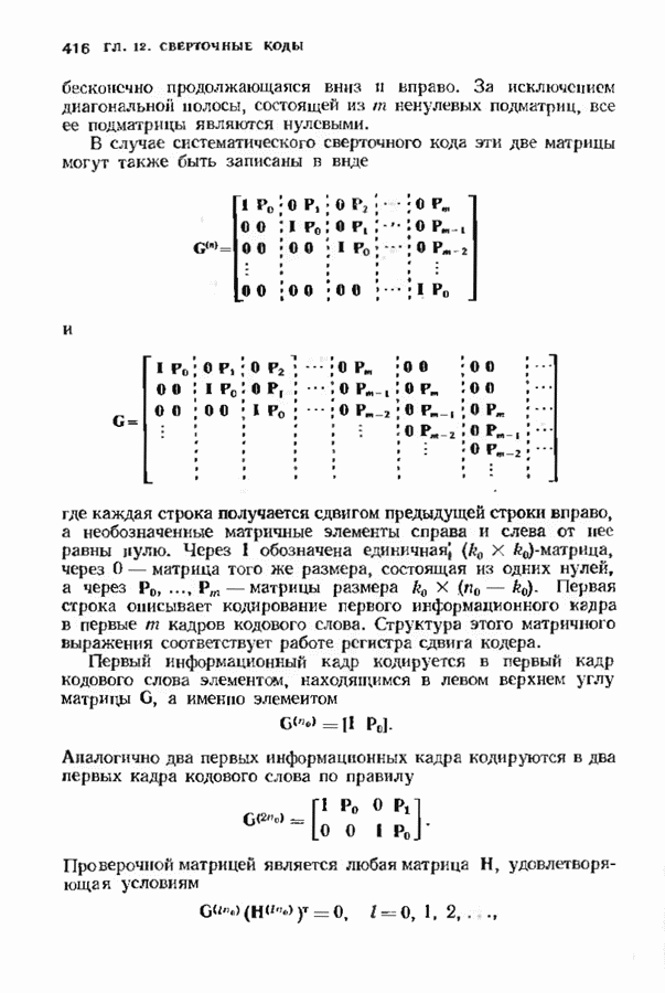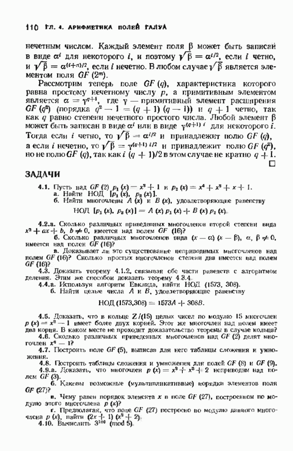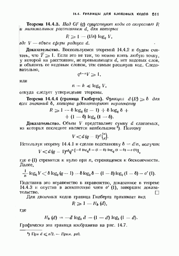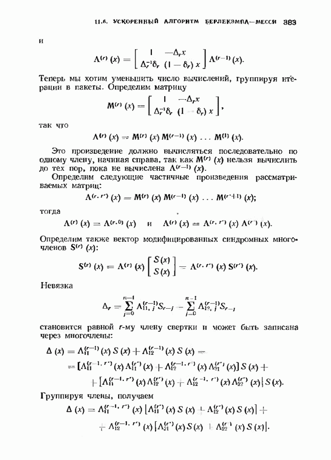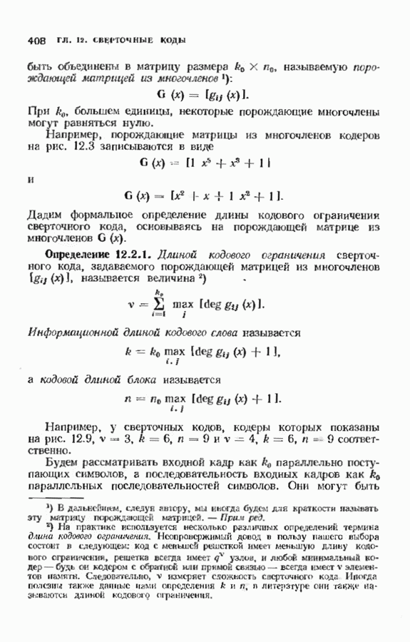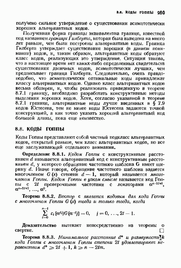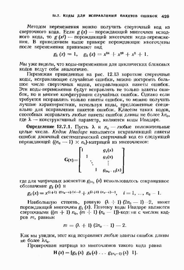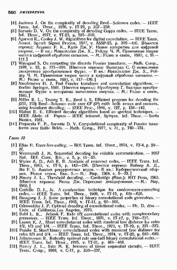 Если произошла только одна ошибка, то одна из оценок, даваемых проверочными суммами, будет неверна; мажоритарное решение дает значение Аналогично может быть продекодирован любой информационный символ, который умножается на одну из строк матрицы После того как эти информационные символы найдены, их вклад в кодовое слово вычитается из принятого слова. Это эквивалентно тому, что мы получаем слово кода Рида — Маллера Этот процесс повторяется до тех пор, пока не будут найдены все информационные биты. ЗАДАЧИ(см. скан) (см. скан) (см. скан) ЗАМЕЧАНИЯИзучение линейных кодов восходит к ранним работам Хэмминга [1950] и Голея 119491. Большинство положений, используемых в настоящее время при изучении линейных колов, заложено Слепяном [1956, 1960]: первые три параграфа тесно связаны с этими работами. Еще до этого Киксу 119537 обратил внимание на связь между линейными кодами и подпространствами векторных пространств. Коды с максимальным расстоянием впервые изучал Синглтон Двоичные коды Хэмминга как коды, исправляющие ошибки, впервые рассматривал Хэмминг, хотя подобные комбнпаторные структуры, рацее встречались в задачах статистики. Недвоичные коды Хэмминга были получены Голсем [1958] и Коком [1959]. Понятие совершенного кода впервые истречается у Голея, хотя он не пользовался таким термином. Делалось много попыток найти новые совершенные коды, но лишь отдельные из них увенчались успехом. В ряде работ Тиотявяйнен и Ван Лиит (работы завершились в 1974 и 1975 гг. соответственно) доказали, что не существует линейных (нетривиальных) совершенных кодов, отличных от кодов Хэмминга или Голея, и не существует нелинейных (нетривиальных) кодов, за исключением кодоп Васильева [1962] и Шёнхейма [1968]. Коды Рида-Маллера были получены Маллером [1954], и в этом же году Рид разработал алгоритм их декодирования. Этот алгоритм необычем тем, что принимает решение, основанное «а мажоритарной логике. Коды Рида-Маллера являются предшественниками обширных семейств мажоритарно декодируемых кодов, с которыми мы встретимся в следующих главах.