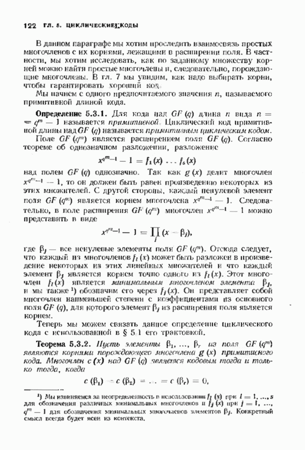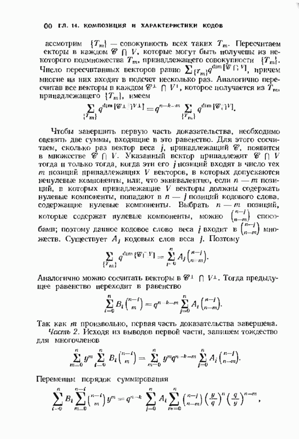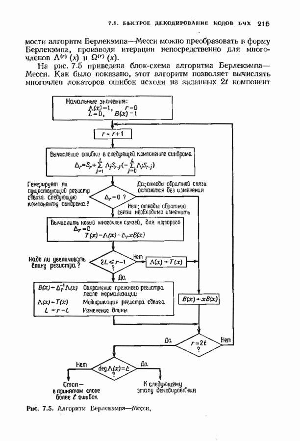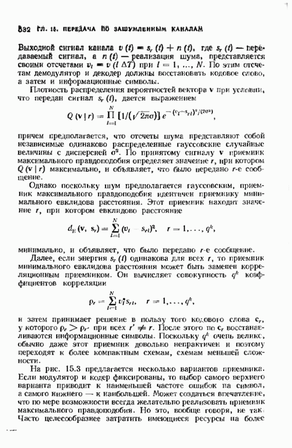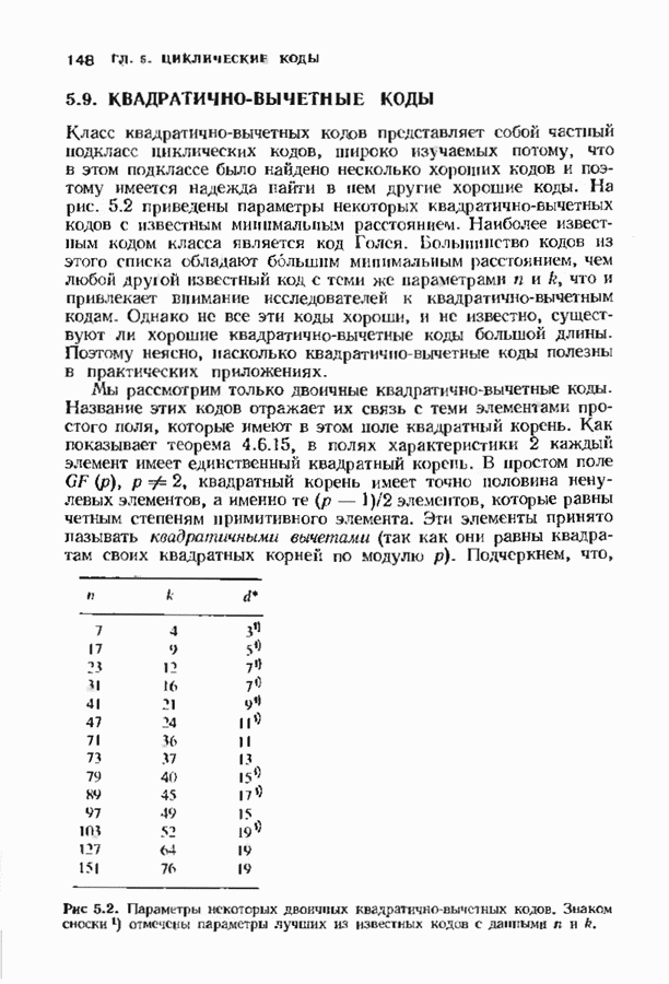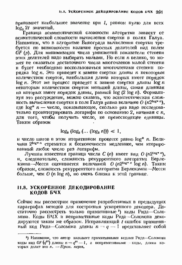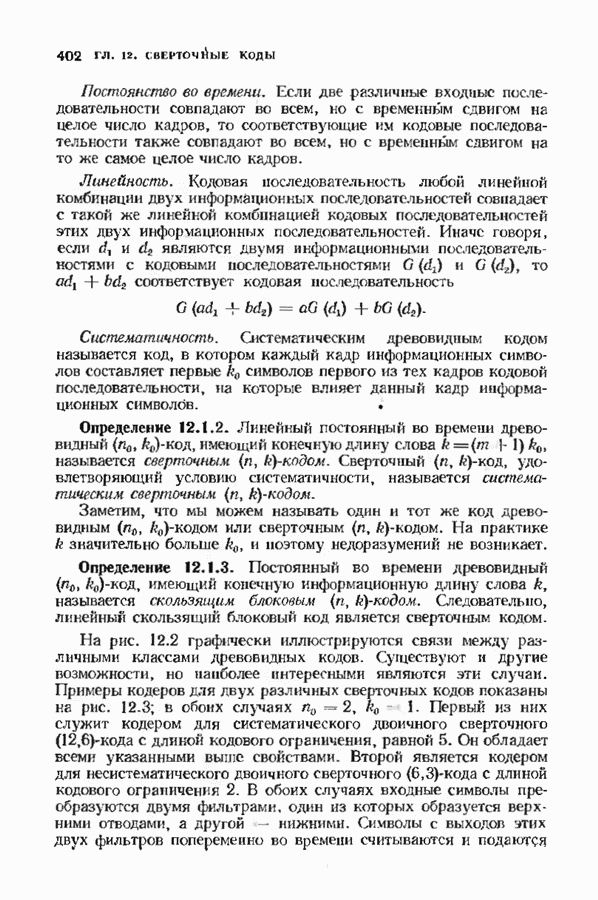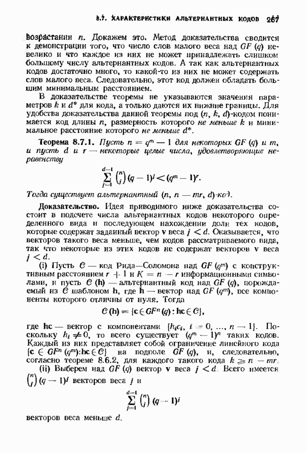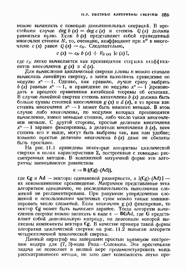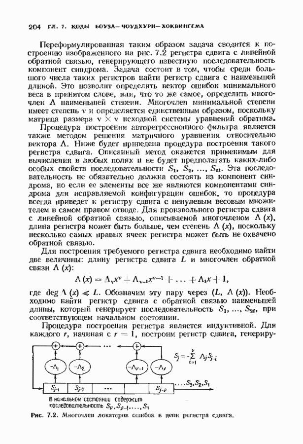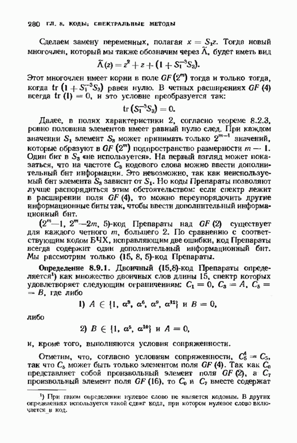 Если произошла только одна ошибка, то одна из оценок, даваемых проверочными суммами, будет неверна; мажоритарное решение дает значение Аналогично может быть продекодирован любой информационный символ, который умножается на одну из строк матрицы После того как эти информационные символы найдены, их вклад в кодовое слово вычитается из принятого слова. Это эквивалентно тому, что мы получаем слово кода Рида — Маллера Этот процесс повторяется до тех пор, пока не будут найдены все информационные биты. ЗАДАЧИ(см. скан) (см. скан) (см. скан) ЗАМЕЧАНИЯИзучение линейных кодов восходит к ранним работам Хэмминга [1950] и Голея 119491. Большинство положений, используемых в настоящее время при изучении линейных колов, заложено Слепяном [1956, 1960]: первые три параграфа тесно связаны с этими работами. Еще до этого Киксу 119537 обратил внимание на связь между линейными кодами и подпространствами векторных пространств. Коды с максимальным расстоянием впервые изучал Синглтон Двоичные коды Хэмминга как коды, исправляющие ошибки, впервые рассматривал Хэмминг, хотя подобные комбнпаторные структуры, рацее встречались в задачах статистики. Недвоичные коды Хэмминга были получены Голсем [1958] и Коком [1959]. Понятие совершенного кода впервые истречается у Голея, хотя он не пользовался таким термином. Делалось много попыток найти новые совершенные коды, но лишь отдельные из них увенчались успехом. В ряде работ Тиотявяйнен и Ван Лиит (работы завершились в 1974 и 1975 гг. соответственно) доказали, что не существует линейных (нетривиальных) совершенных кодов, отличных от кодов Хэмминга или Голея, и не существует нелинейных (нетривиальных) кодов, за исключением кодоп Васильева [1962] и Шёнхейма [1968]. Коды Рида-Маллера были получены Маллером [1954], и в этом же году Рид разработал алгоритм их декодирования. Этот алгоритм необычем тем, что принимает решение, основанное «а мажоритарной логике. Коды Рида-Маллера являются предшественниками обширных семейств мажоритарно декодируемых кодов, с которыми мы встретимся в следующих главах.