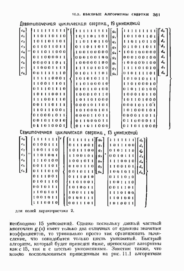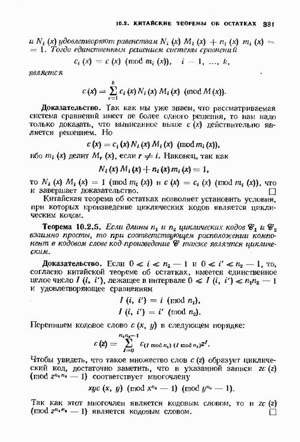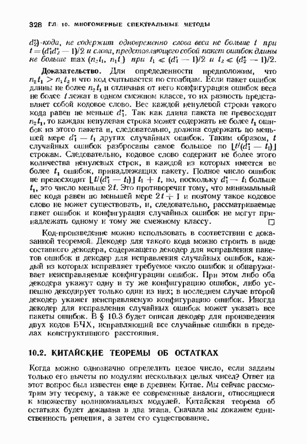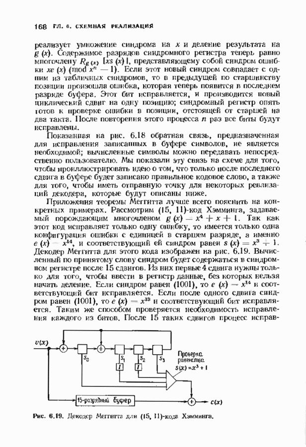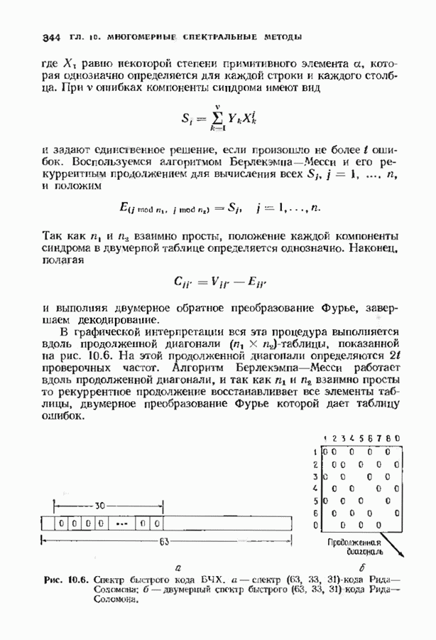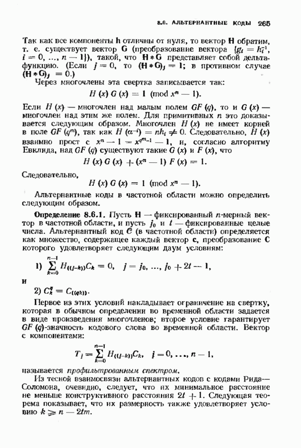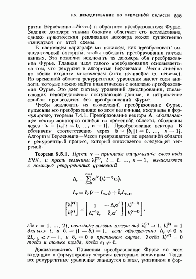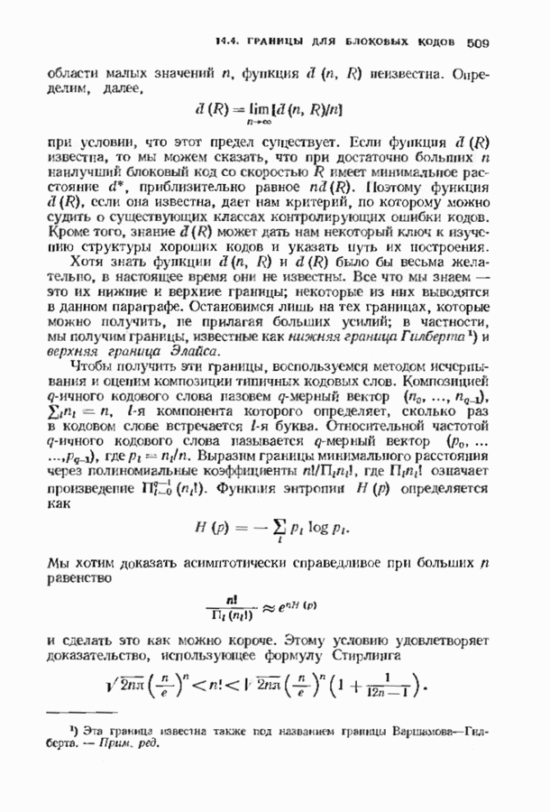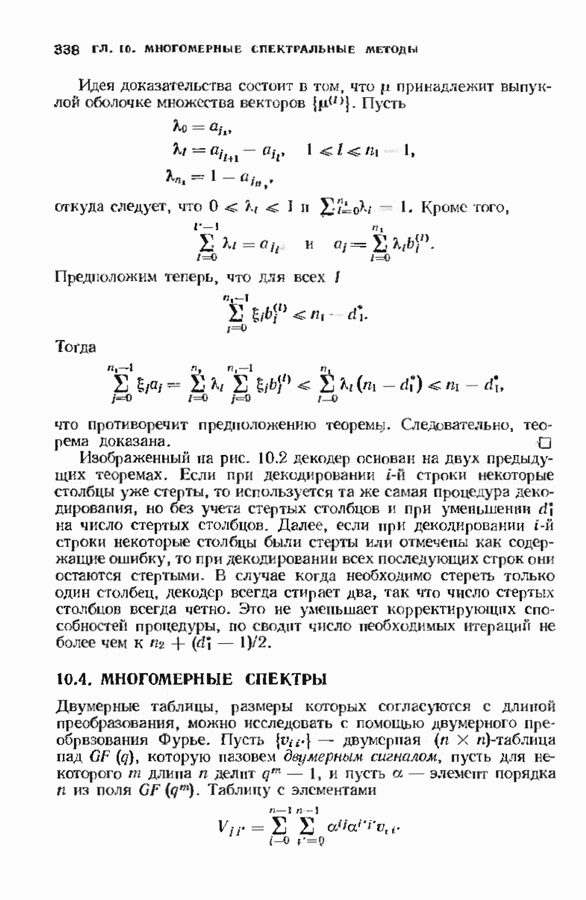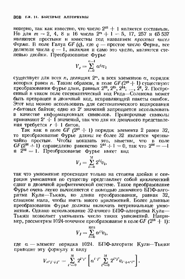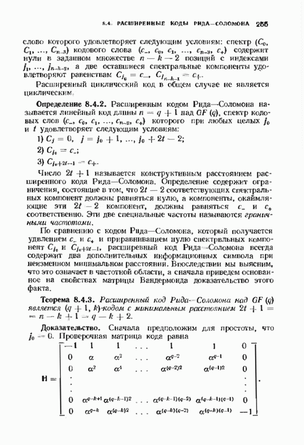Если произошла только одна ошибка, то одна из оценок, даваемых проверочными суммами, будет неверна; мажоритарное решение дает значение Аналогично может быть продекодирован любой информационный символ, который умножается на одну из строк матрицы После того как эти информационные символы найдены, их вклад в кодовое слово вычитается из принятого слова. Это эквивалентно тому, что мы получаем слово кода Рида — Маллера Этот процесс повторяется до тех пор, пока не будут найдены все информационные биты. ЗАДАЧИ(см. скан) (см. скан) (см. скан) ЗАМЕЧАНИЯИзучение линейных кодов восходит к ранним работам Хэмминга [1950] и Голея 119491. Большинство положений, используемых в настоящее время при изучении линейных колов, заложено Слепяном [1956, 1960]: первые три параграфа тесно связаны с этими работами. Еще до этого Киксу 119537 обратил внимание на связь между линейными кодами и подпространствами векторных пространств. Коды с максимальным расстоянием впервые изучал Синглтон Двоичные коды Хэмминга как коды, исправляющие ошибки, впервые рассматривал Хэмминг, хотя подобные комбнпаторные структуры, рацее встречались в задачах статистики. Недвоичные коды Хэмминга были получены Голсем [1958] и Коком [1959]. Понятие совершенного кода впервые истречается у Голея, хотя он не пользовался таким термином. Делалось много попыток найти новые совершенные коды, но лишь отдельные из них увенчались успехом. В ряде работ Тиотявяйнен и Ван Лиит (работы завершились в 1974 и 1975 гг. соответственно) доказали, что не существует линейных (нетривиальных) совершенных кодов, отличных от кодов Хэмминга или Голея, и не существует нелинейных (нетривиальных) кодов, за исключением кодоп Васильева [1962] и Шёнхейма [1968]. Коды Рида-Маллера были получены Маллером [1954], и в этом же году Рид разработал алгоритм их декодирования. Этот алгоритм необычем тем, что принимает решение, основанное «а мажоритарной логике. Коды Рида-Маллера являются предшественниками обширных семейств мажоритарно декодируемых кодов, с которыми мы встретимся в следующих главах.