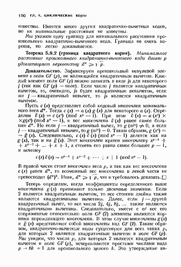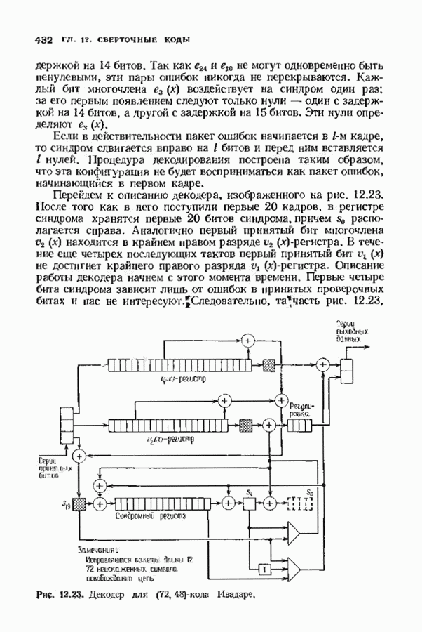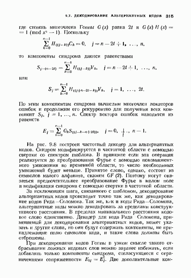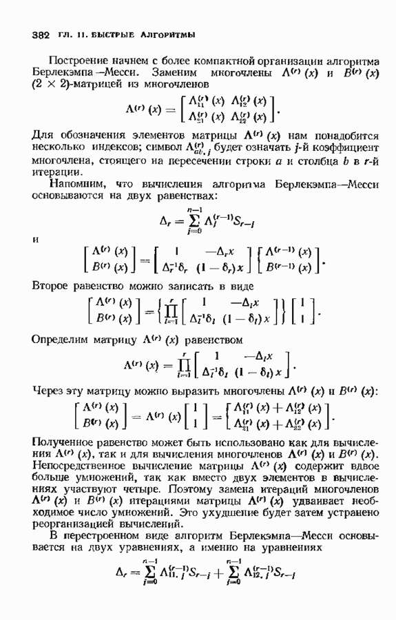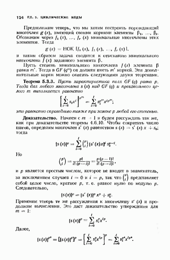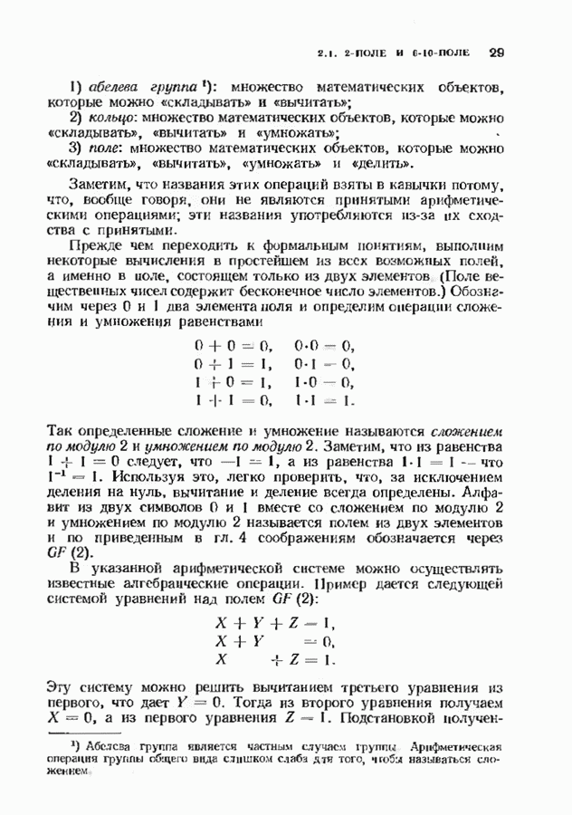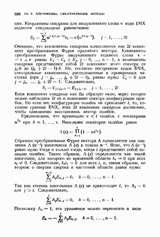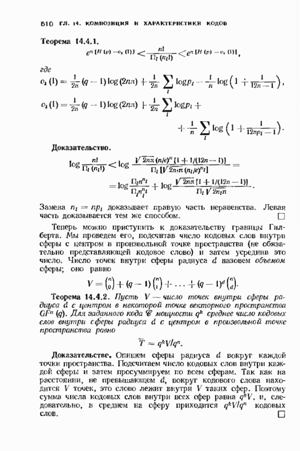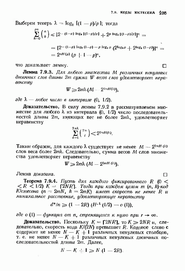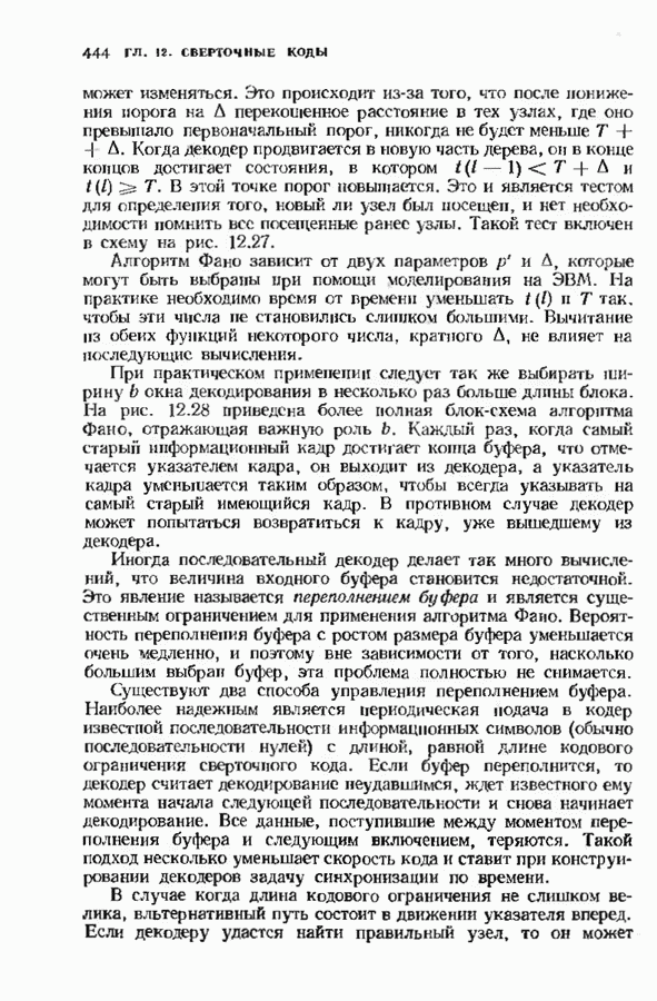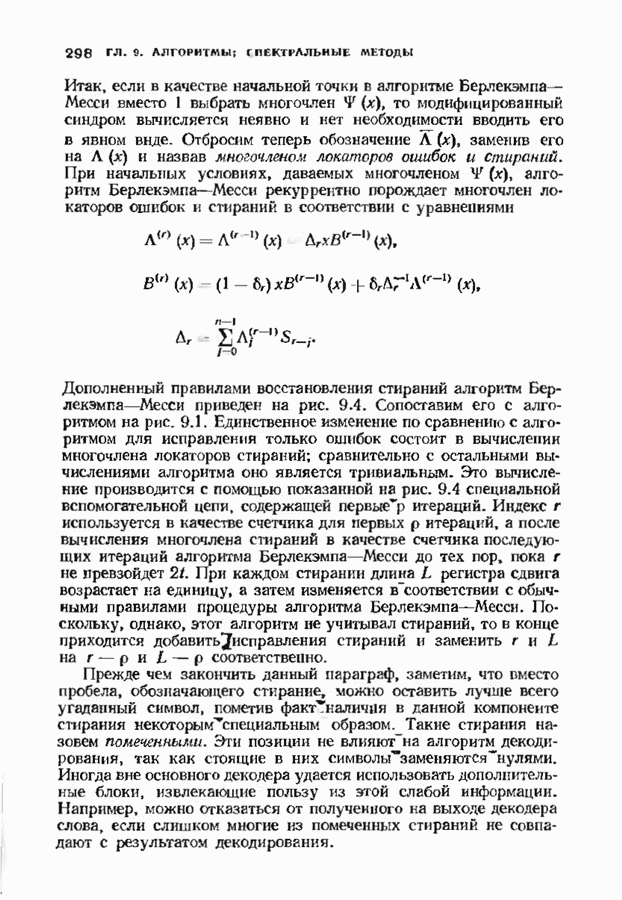 Если произошла только одна ошибка, то одна из оценок, даваемых проверочными суммами, будет неверна; мажоритарное решение дает значение Аналогично может быть продекодирован любой информационный символ, который умножается на одну из строк матрицы После того как эти информационные символы найдены, их вклад в кодовое слово вычитается из принятого слова. Это эквивалентно тому, что мы получаем слово кода Рида — Маллера Этот процесс повторяется до тех пор, пока не будут найдены все информационные биты. ЗАДАЧИ(см. скан) (см. скан) (см. скан) ЗАМЕЧАНИЯИзучение линейных кодов восходит к ранним работам Хэмминга [1950] и Голея 119491. Большинство положений, используемых в настоящее время при изучении линейных колов, заложено Слепяном [1956, 1960]: первые три параграфа тесно связаны с этими работами. Еще до этого Киксу 119537 обратил внимание на связь между линейными кодами и подпространствами векторных пространств. Коды с максимальным расстоянием впервые изучал Синглтон Двоичные коды Хэмминга как коды, исправляющие ошибки, впервые рассматривал Хэмминг, хотя подобные комбнпаторные структуры, рацее встречались в задачах статистики. Недвоичные коды Хэмминга были получены Голсем [1958] и Коком [1959]. Понятие совершенного кода впервые истречается у Голея, хотя он не пользовался таким термином. Делалось много попыток найти новые совершенные коды, но лишь отдельные из них увенчались успехом. В ряде работ Тиотявяйнен и Ван Лиит (работы завершились в 1974 и 1975 гг. соответственно) доказали, что не существует линейных (нетривиальных) совершенных кодов, отличных от кодов Хэмминга или Голея, и не существует нелинейных (нетривиальных) кодов, за исключением кодоп Васильева [1962] и Шёнхейма [1968]. Коды Рида-Маллера были получены Маллером [1954], и в этом же году Рид разработал алгоритм их декодирования. Этот алгоритм необычем тем, что принимает решение, основанное «а мажоритарной логике. Коды Рида-Маллера являются предшественниками обширных семейств мажоритарно декодируемых кодов, с которыми мы встретимся в следующих главах.
