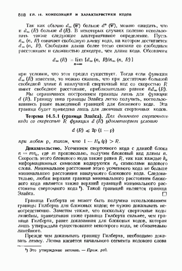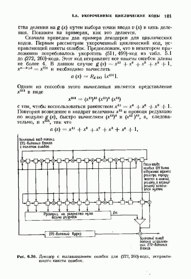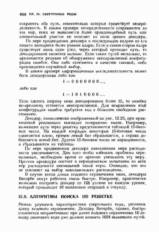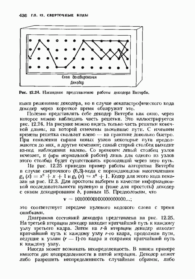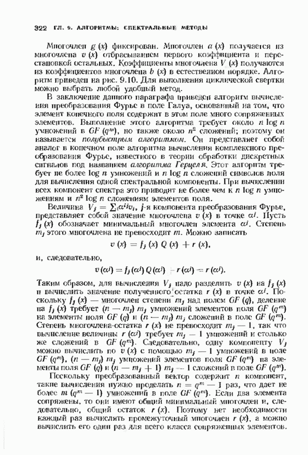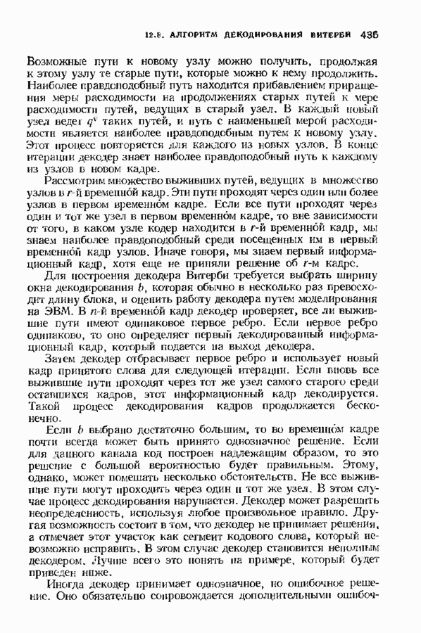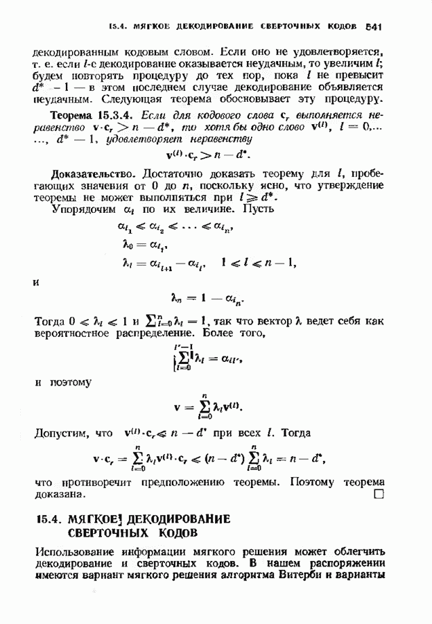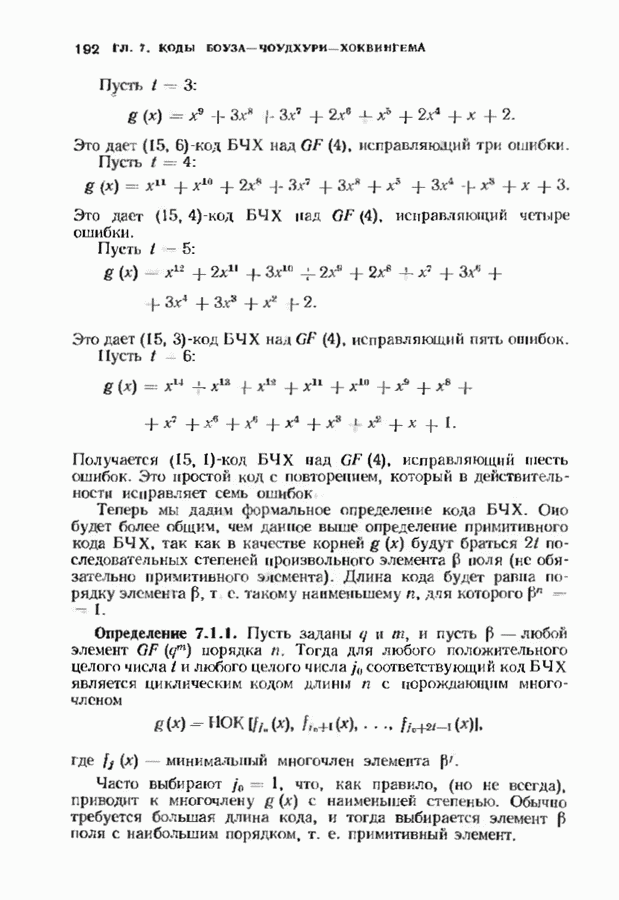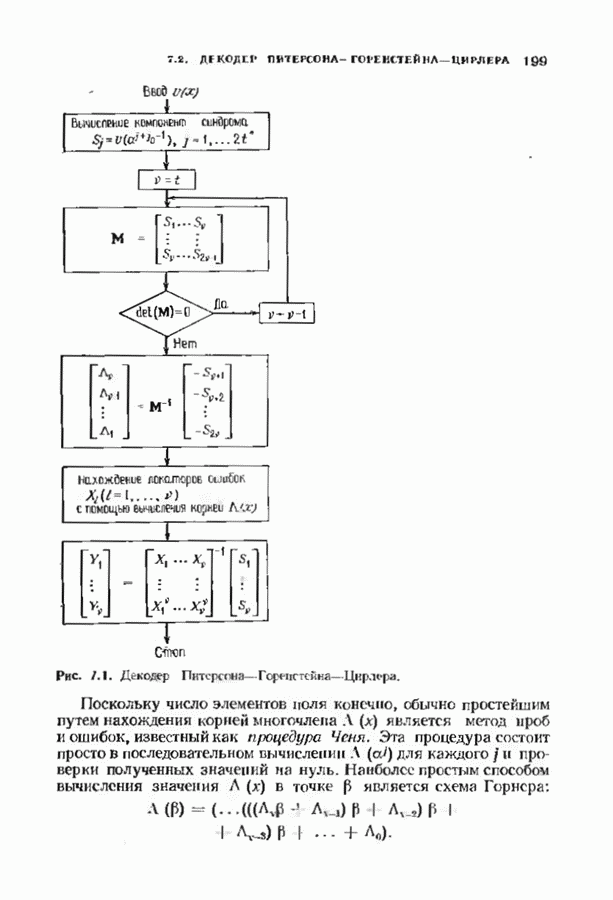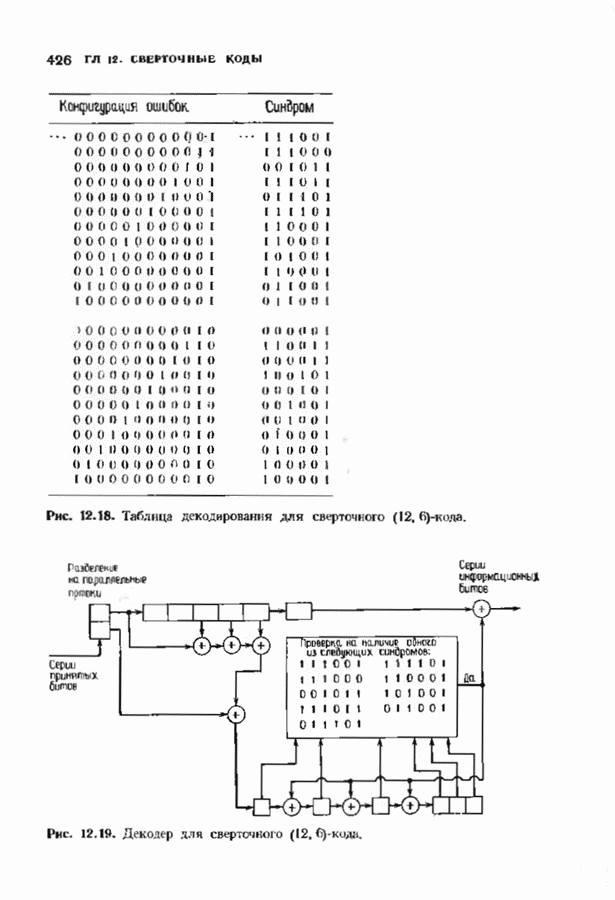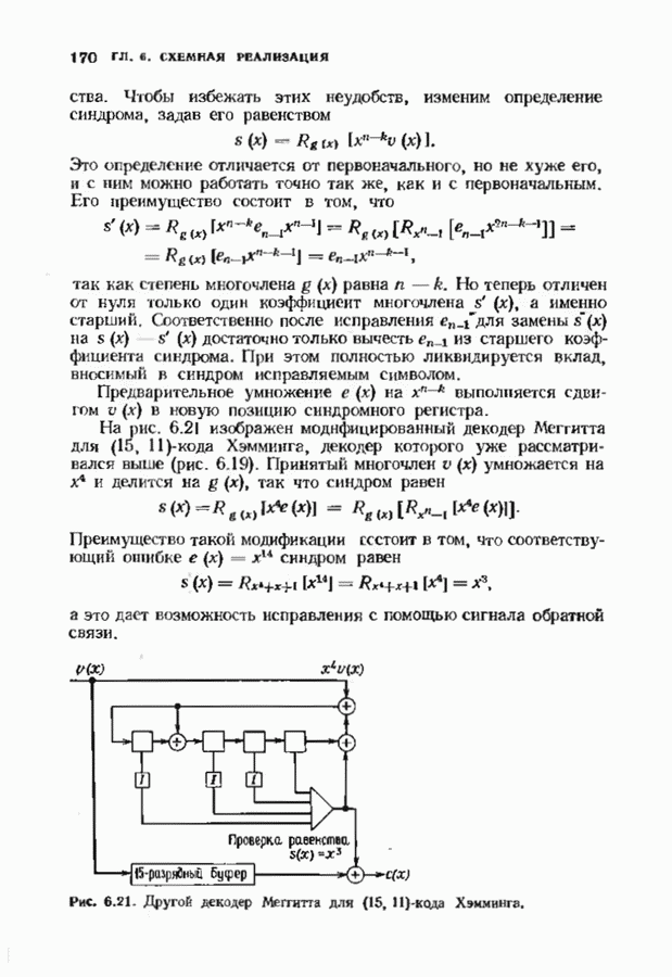 Если произошла только одна ошибка, то одна из оценок, даваемых проверочными суммами, будет неверна; мажоритарное решение дает значение Аналогично может быть продекодирован любой информационный символ, который умножается на одну из строк матрицы После того как эти информационные символы найдены, их вклад в кодовое слово вычитается из принятого слова. Это эквивалентно тому, что мы получаем слово кода Рида — Маллера Этот процесс повторяется до тех пор, пока не будут найдены все информационные биты. ЗАДАЧИ(см. скан) (см. скан) (см. скан) ЗАМЕЧАНИЯИзучение линейных кодов восходит к ранним работам Хэмминга [1950] и Голея 119491. Большинство положений, используемых в настоящее время при изучении линейных колов, заложено Слепяном [1956, 1960]: первые три параграфа тесно связаны с этими работами. Еще до этого Киксу 119537 обратил внимание на связь между линейными кодами и подпространствами векторных пространств. Коды с максимальным расстоянием впервые изучал Синглтон Двоичные коды Хэмминга как коды, исправляющие ошибки, впервые рассматривал Хэмминг, хотя подобные комбнпаторные структуры, рацее встречались в задачах статистики. Недвоичные коды Хэмминга были получены Голсем [1958] и Коком [1959]. Понятие совершенного кода впервые истречается у Голея, хотя он не пользовался таким термином. Делалось много попыток найти новые совершенные коды, но лишь отдельные из них увенчались успехом. В ряде работ Тиотявяйнен и Ван Лиит (работы завершились в 1974 и 1975 гг. соответственно) доказали, что не существует линейных (нетривиальных) совершенных кодов, отличных от кодов Хэмминга или Голея, и не существует нелинейных (нетривиальных) кодов, за исключением кодоп Васильева [1962] и Шёнхейма [1968]. Коды Рида-Маллера были получены Маллером [1954], и в этом же году Рид разработал алгоритм их декодирования. Этот алгоритм необычем тем, что принимает решение, основанное «а мажоритарной логике. Коды Рида-Маллера являются предшественниками обширных семейств мажоритарно декодируемых кодов, с которыми мы встретимся в следующих главах.
