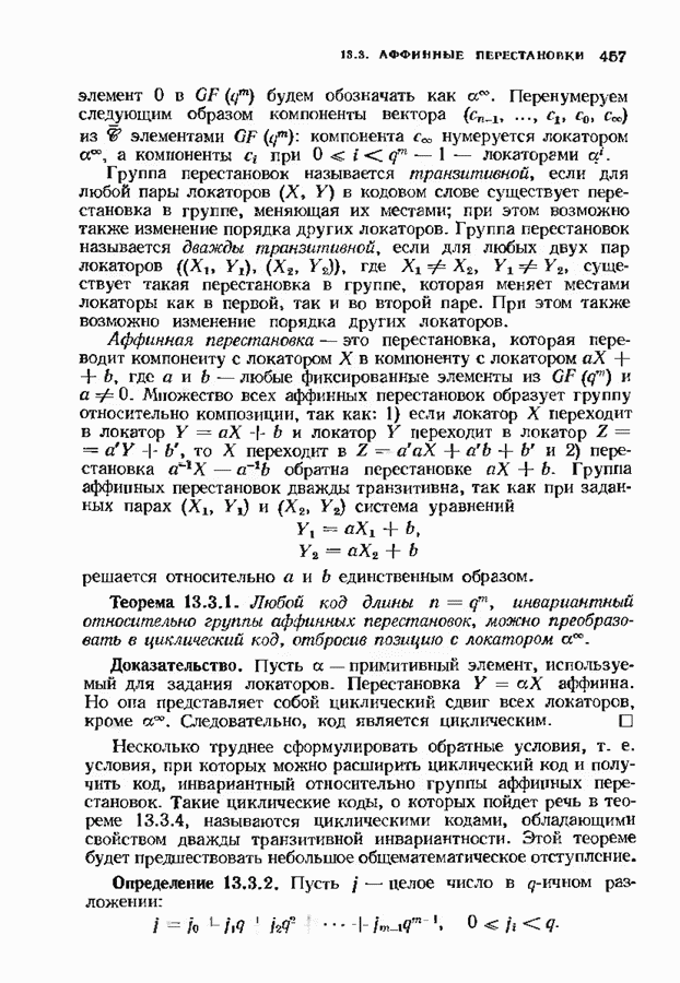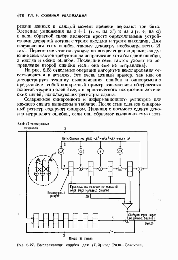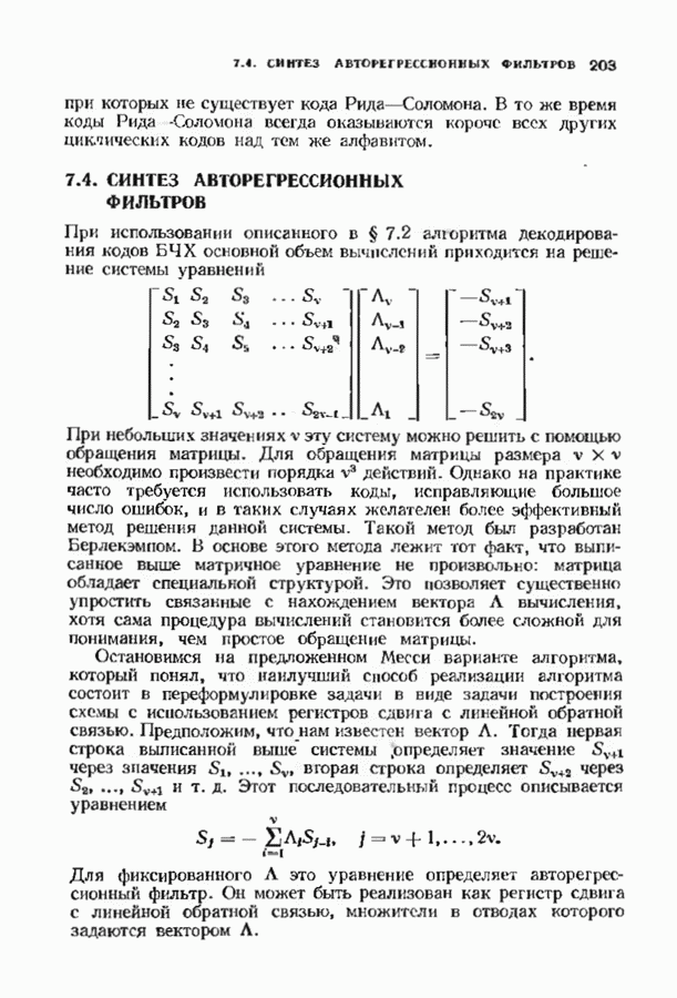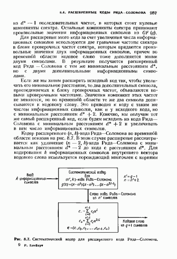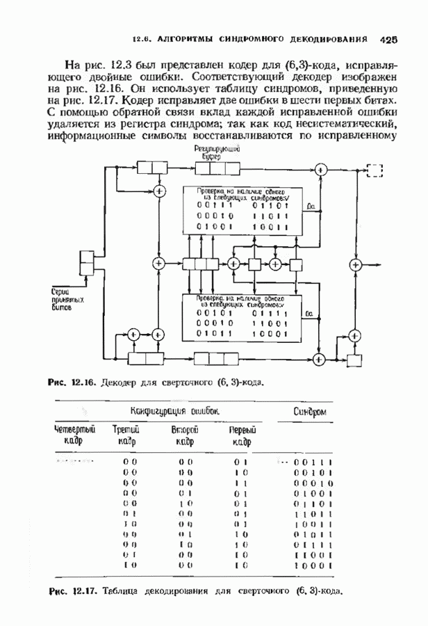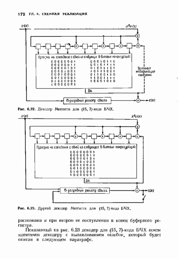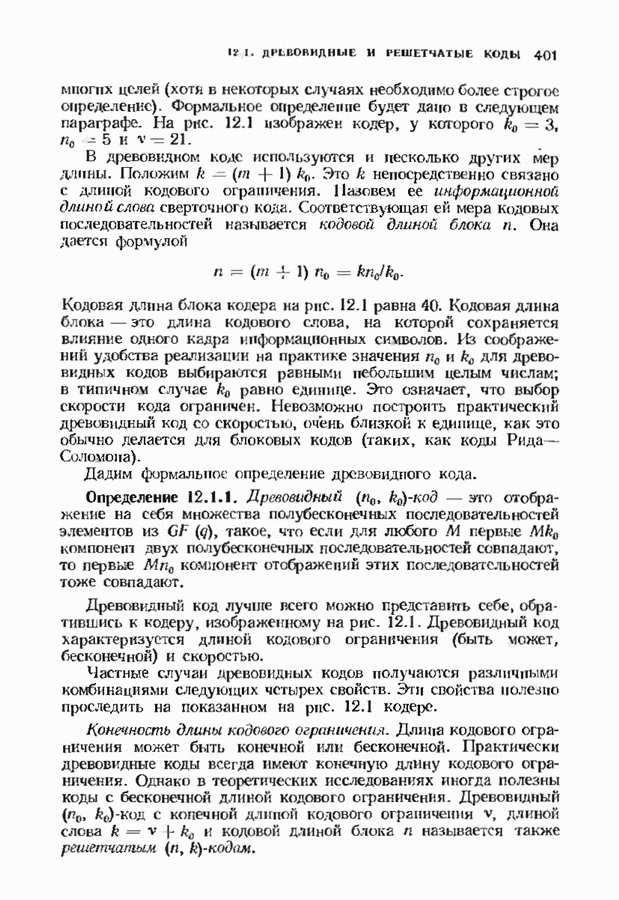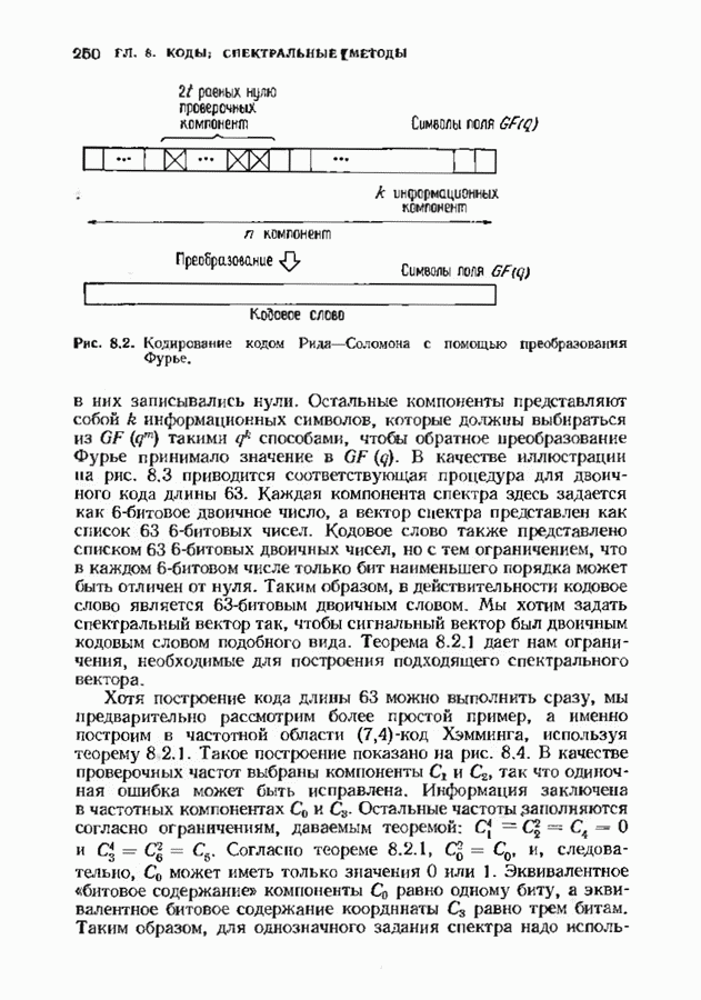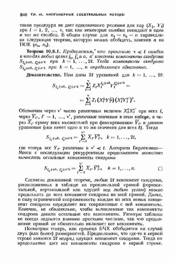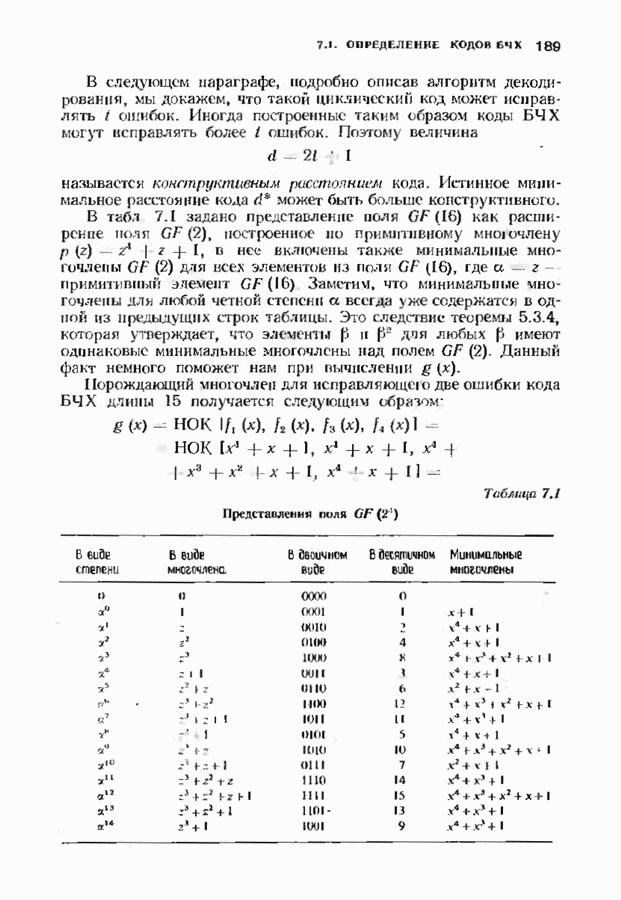 Если произошла только одна ошибка, то одна из оценок, даваемых проверочными суммами, будет неверна; мажоритарное решение дает значение Аналогично может быть продекодирован любой информационный символ, который умножается на одну из строк матрицы После того как эти информационные символы найдены, их вклад в кодовое слово вычитается из принятого слова. Это эквивалентно тому, что мы получаем слово кода Рида — Маллера Этот процесс повторяется до тех пор, пока не будут найдены все информационные биты. ЗАДАЧИ(см. скан) (см. скан) (см. скан) ЗАМЕЧАНИЯИзучение линейных кодов восходит к ранним работам Хэмминга [1950] и Голея 119491. Большинство положений, используемых в настоящее время при изучении линейных колов, заложено Слепяном [1956, 1960]: первые три параграфа тесно связаны с этими работами. Еще до этого Киксу 119537 обратил внимание на связь между линейными кодами и подпространствами векторных пространств. Коды с максимальным расстоянием впервые изучал Синглтон Двоичные коды Хэмминга как коды, исправляющие ошибки, впервые рассматривал Хэмминг, хотя подобные комбнпаторные структуры, рацее встречались в задачах статистики. Недвоичные коды Хэмминга были получены Голсем [1958] и Коком [1959]. Понятие совершенного кода впервые истречается у Голея, хотя он не пользовался таким термином. Делалось много попыток найти новые совершенные коды, но лишь отдельные из них увенчались успехом. В ряде работ Тиотявяйнен и Ван Лиит (работы завершились в 1974 и 1975 гг. соответственно) доказали, что не существует линейных (нетривиальных) совершенных кодов, отличных от кодов Хэмминга или Голея, и не существует нелинейных (нетривиальных) кодов, за исключением кодоп Васильева [1962] и Шёнхейма [1968]. Коды Рида-Маллера были получены Маллером [1954], и в этом же году Рид разработал алгоритм их декодирования. Этот алгоритм необычем тем, что принимает решение, основанное «а мажоритарной логике. Коды Рида-Маллера являются предшественниками обширных семейств мажоритарно декодируемых кодов, с которыми мы встретимся в следующих главах.