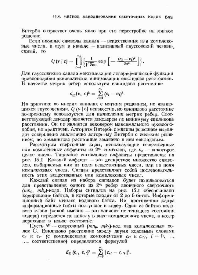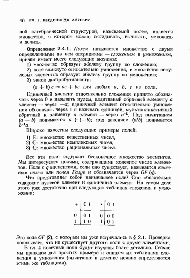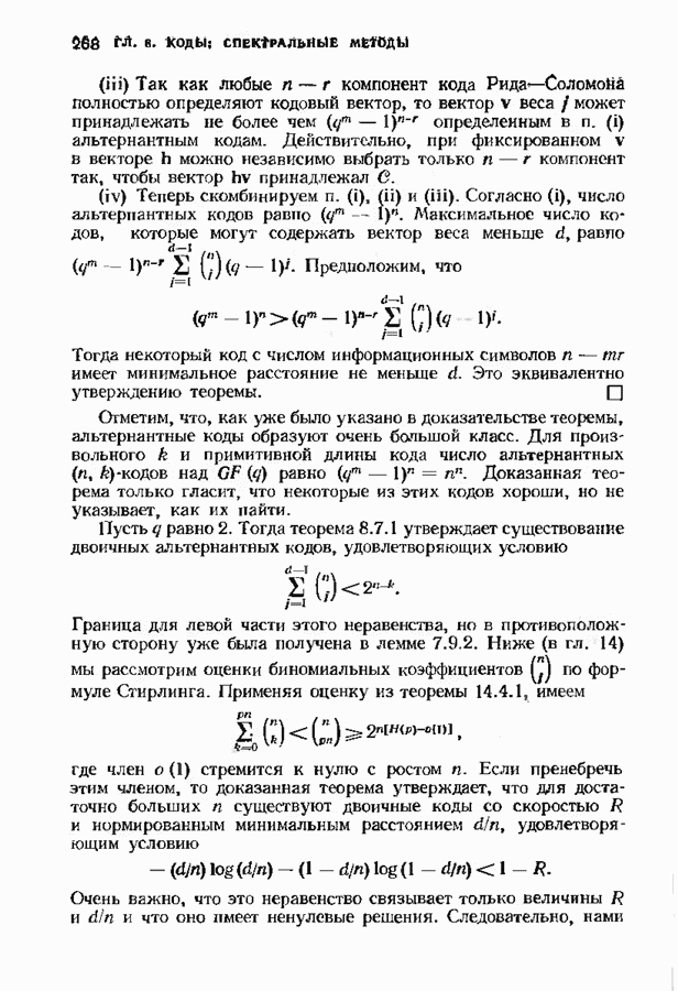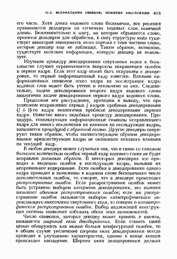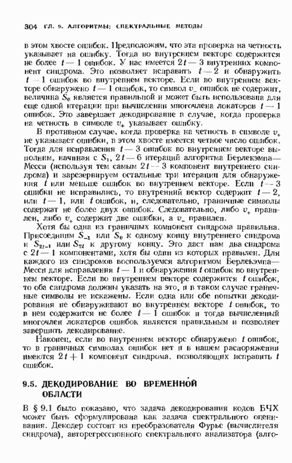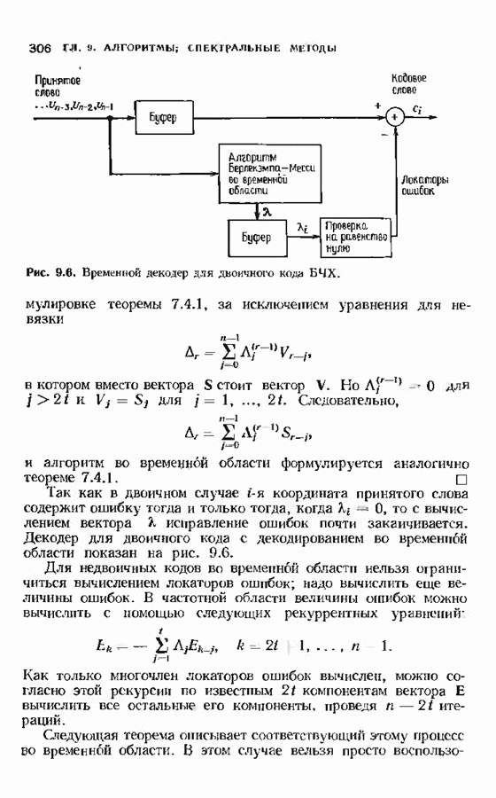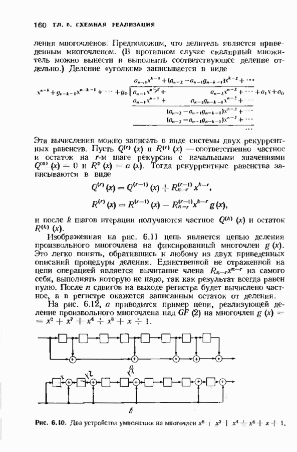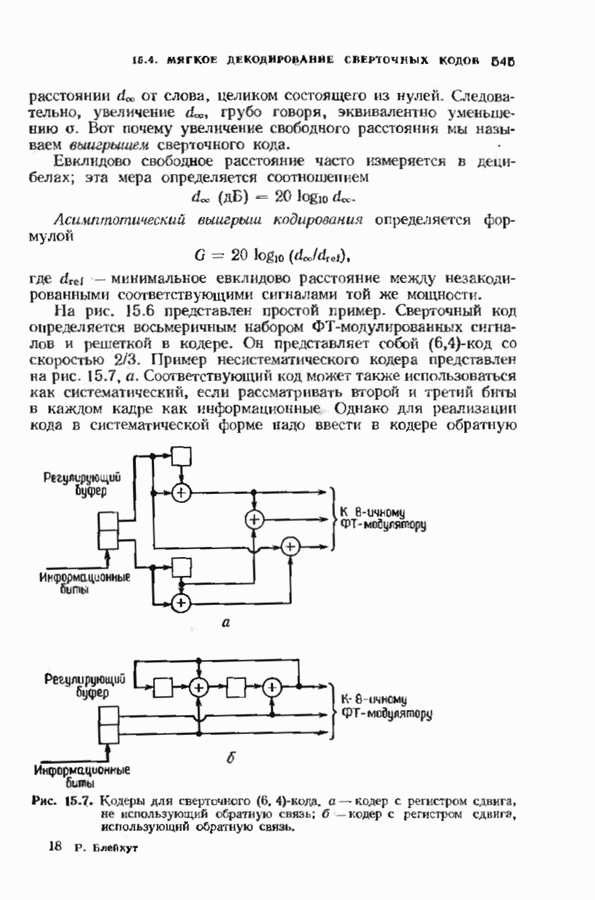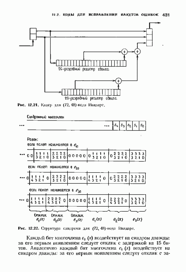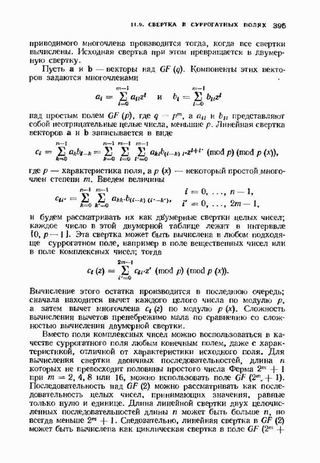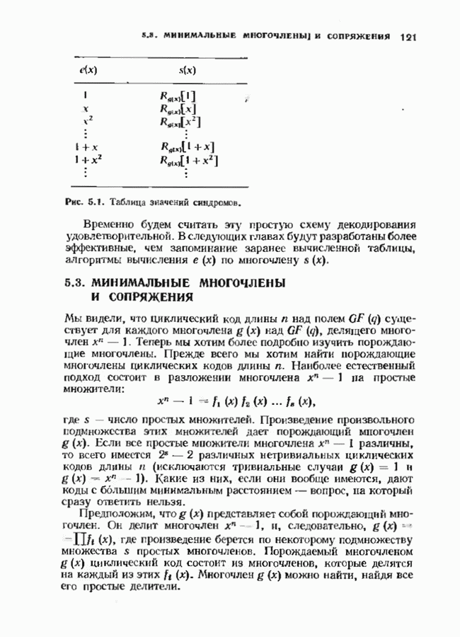 Если произошла только одна ошибка, то одна из оценок, даваемых проверочными суммами, будет неверна; мажоритарное решение дает значение Аналогично может быть продекодирован любой информационный символ, который умножается на одну из строк матрицы После того как эти информационные символы найдены, их вклад в кодовое слово вычитается из принятого слова. Это эквивалентно тому, что мы получаем слово кода Рида — Маллера Этот процесс повторяется до тех пор, пока не будут найдены все информационные биты. ЗАДАЧИ(см. скан) (см. скан) (см. скан) ЗАМЕЧАНИЯИзучение линейных кодов восходит к ранним работам Хэмминга [1950] и Голея 119491. Большинство положений, используемых в настоящее время при изучении линейных колов, заложено Слепяном [1956, 1960]: первые три параграфа тесно связаны с этими работами. Еще до этого Киксу 119537 обратил внимание на связь между линейными кодами и подпространствами векторных пространств. Коды с максимальным расстоянием впервые изучал Синглтон Двоичные коды Хэмминга как коды, исправляющие ошибки, впервые рассматривал Хэмминг, хотя подобные комбнпаторные структуры, рацее встречались в задачах статистики. Недвоичные коды Хэмминга были получены Голсем [1958] и Коком [1959]. Понятие совершенного кода впервые истречается у Голея, хотя он не пользовался таким термином. Делалось много попыток найти новые совершенные коды, но лишь отдельные из них увенчались успехом. В ряде работ Тиотявяйнен и Ван Лиит (работы завершились в 1974 и 1975 гг. соответственно) доказали, что не существует линейных (нетривиальных) совершенных кодов, отличных от кодов Хэмминга или Голея, и не существует нелинейных (нетривиальных) кодов, за исключением кодоп Васильева [1962] и Шёнхейма [1968]. Коды Рида-Маллера были получены Маллером [1954], и в этом же году Рид разработал алгоритм их декодирования. Этот алгоритм необычем тем, что принимает решение, основанное «а мажоритарной логике. Коды Рида-Маллера являются предшественниками обширных семейств мажоритарно декодируемых кодов, с которыми мы встретимся в следующих главах.