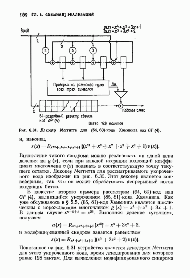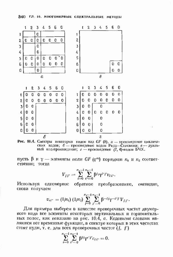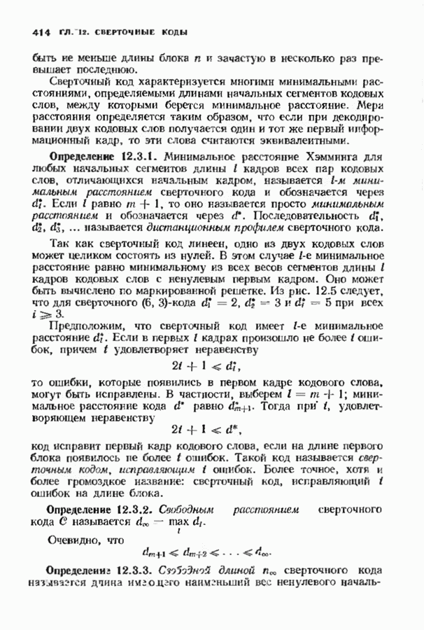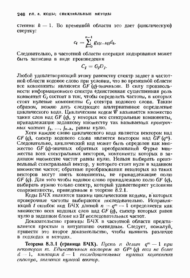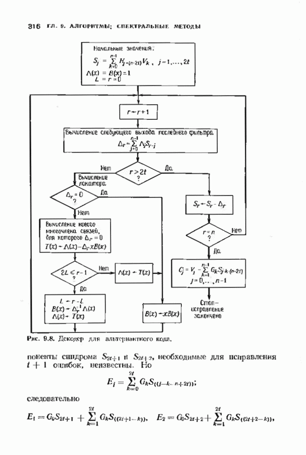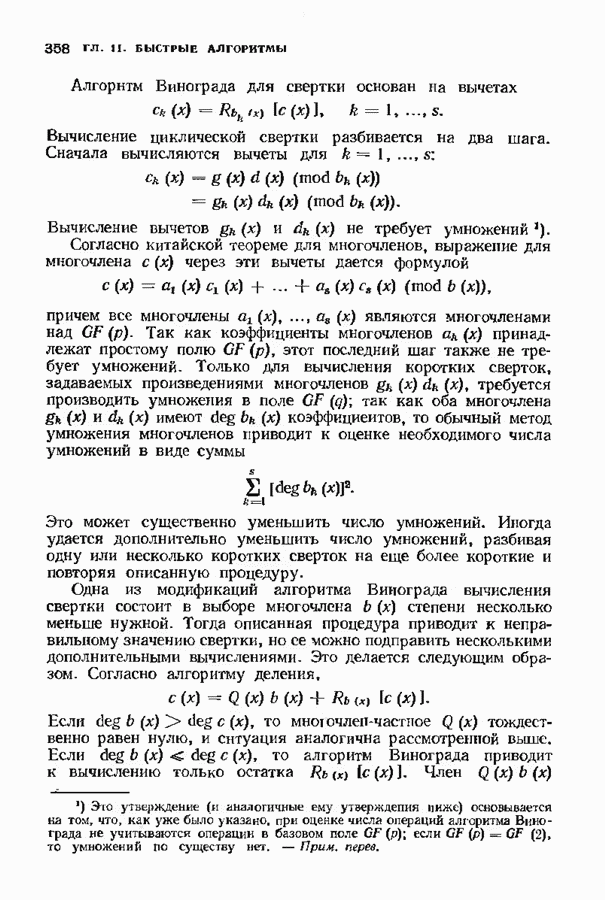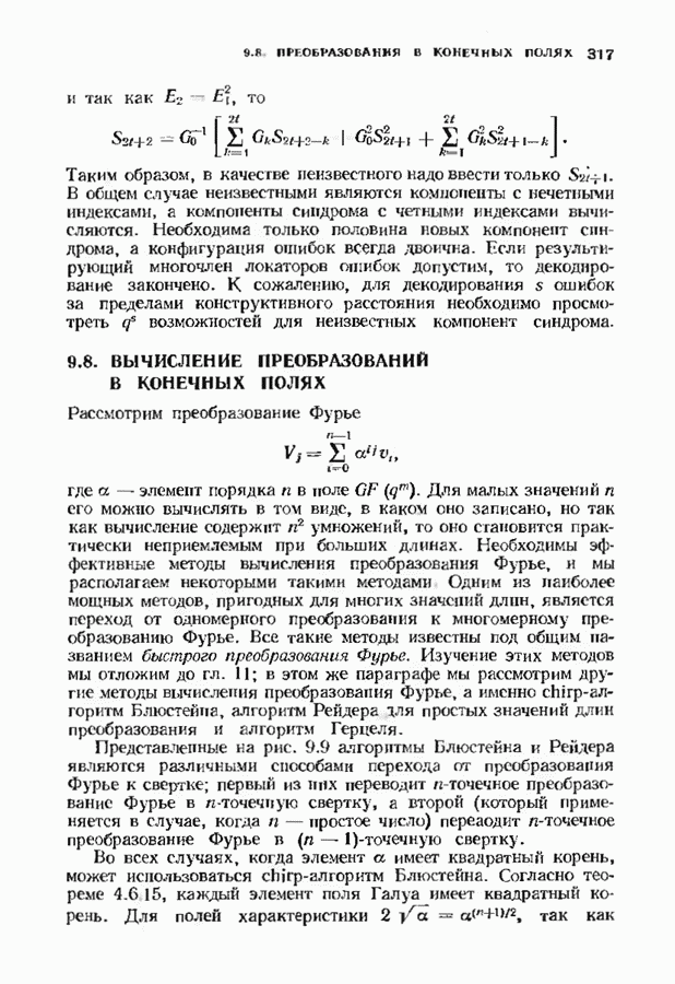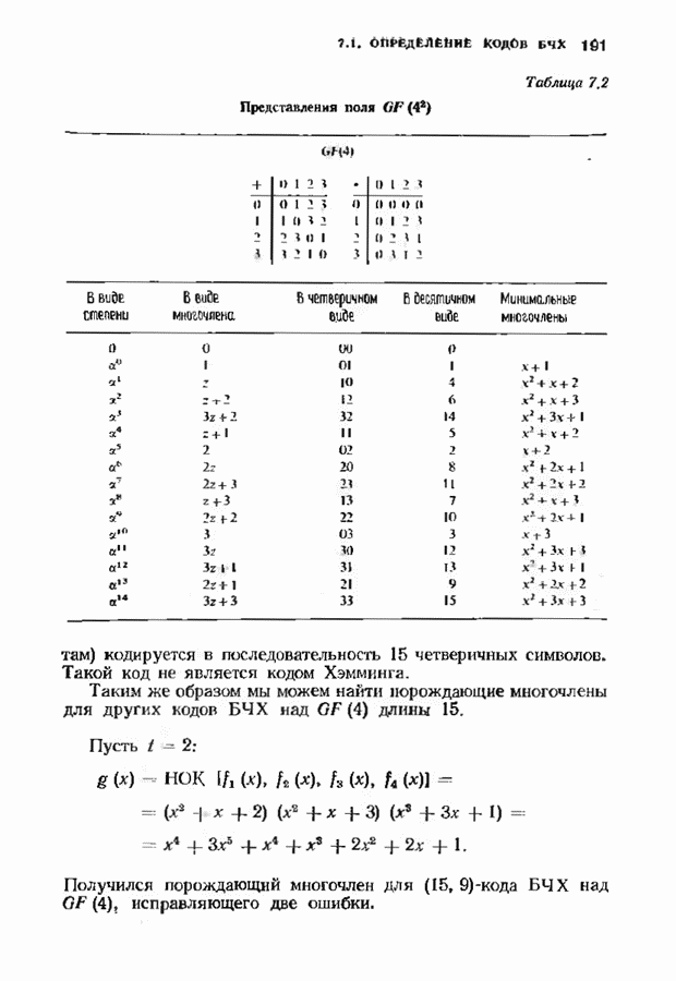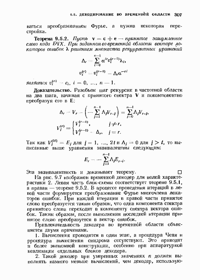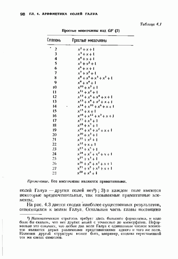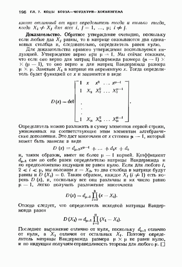 Если произошла только одна ошибка, то одна из оценок, даваемых проверочными суммами, будет неверна; мажоритарное решение дает значение Аналогично может быть продекодирован любой информационный символ, который умножается на одну из строк матрицы После того как эти информационные символы найдены, их вклад в кодовое слово вычитается из принятого слова. Это эквивалентно тому, что мы получаем слово кода Рида — Маллера Этот процесс повторяется до тех пор, пока не будут найдены все информационные биты. ЗАДАЧИ(см. скан) (см. скан) (см. скан) ЗАМЕЧАНИЯИзучение линейных кодов восходит к ранним работам Хэмминга [1950] и Голея 119491. Большинство положений, используемых в настоящее время при изучении линейных колов, заложено Слепяном [1956, 1960]: первые три параграфа тесно связаны с этими работами. Еще до этого Киксу 119537 обратил внимание на связь между линейными кодами и подпространствами векторных пространств. Коды с максимальным расстоянием впервые изучал Синглтон Двоичные коды Хэмминга как коды, исправляющие ошибки, впервые рассматривал Хэмминг, хотя подобные комбнпаторные структуры, рацее встречались в задачах статистики. Недвоичные коды Хэмминга были получены Голсем [1958] и Коком [1959]. Понятие совершенного кода впервые истречается у Голея, хотя он не пользовался таким термином. Делалось много попыток найти новые совершенные коды, но лишь отдельные из них увенчались успехом. В ряде работ Тиотявяйнен и Ван Лиит (работы завершились в 1974 и 1975 гг. соответственно) доказали, что не существует линейных (нетривиальных) совершенных кодов, отличных от кодов Хэмминга или Голея, и не существует нелинейных (нетривиальных) кодов, за исключением кодоп Васильева [1962] и Шёнхейма [1968]. Коды Рида-Маллера были получены Маллером [1954], и в этом же году Рид разработал алгоритм их декодирования. Этот алгоритм необычем тем, что принимает решение, основанное «а мажоритарной логике. Коды Рида-Маллера являются предшественниками обширных семейств мажоритарно декодируемых кодов, с которыми мы встретимся в следующих главах.