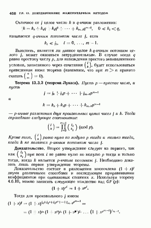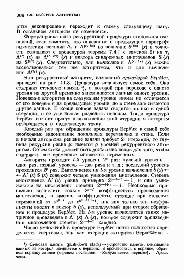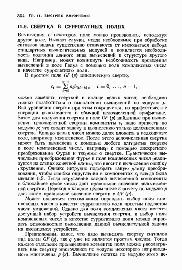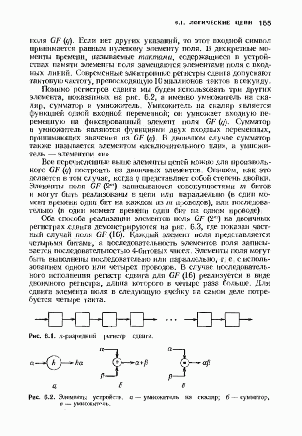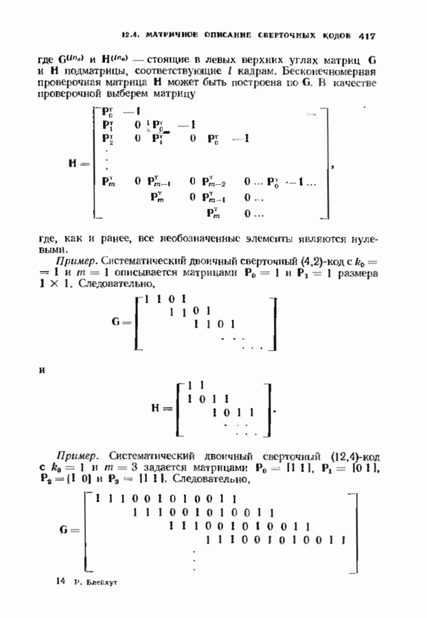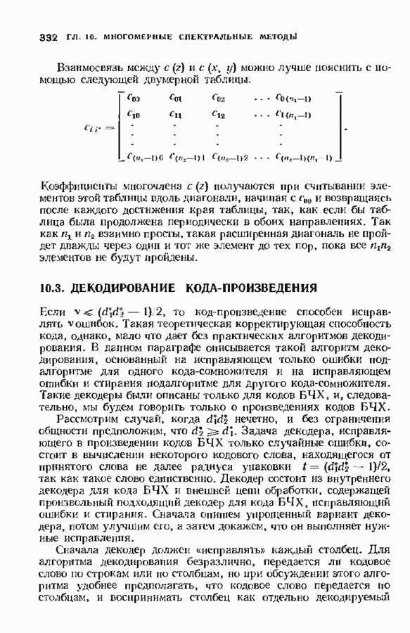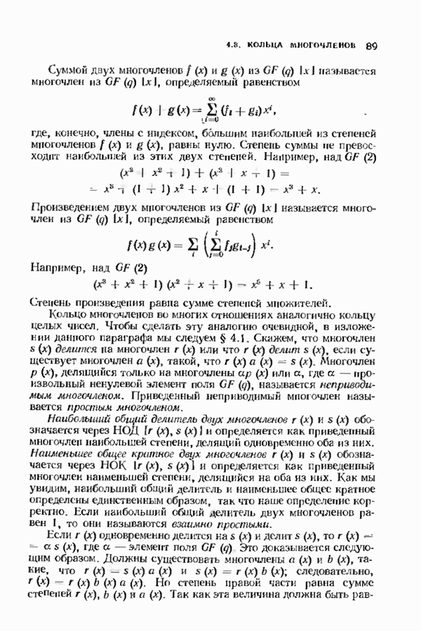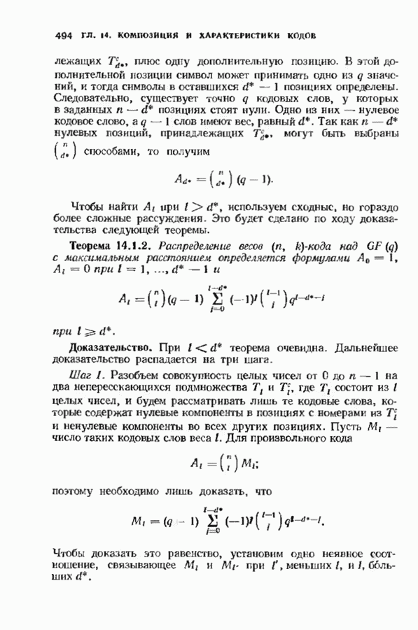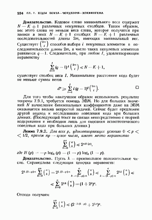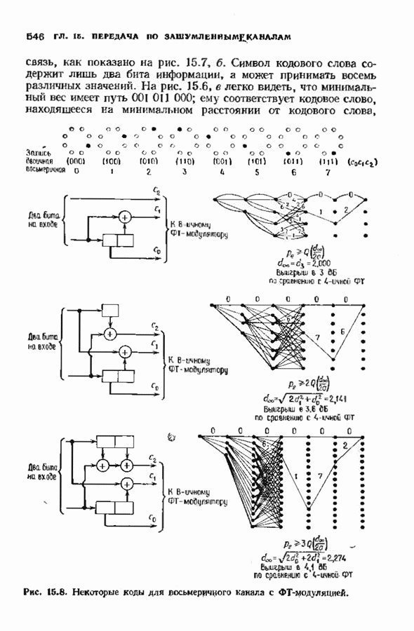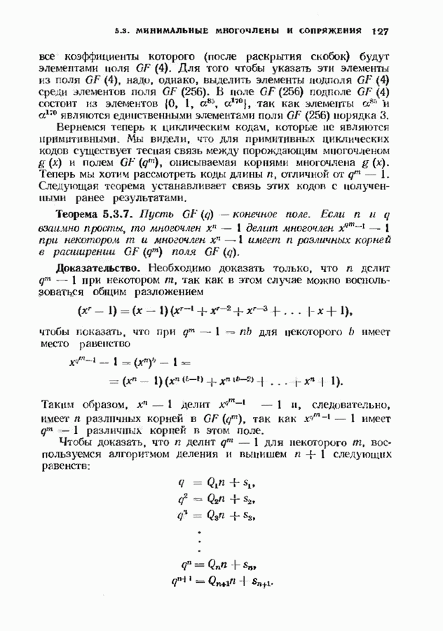 Если произошла только одна ошибка, то одна из оценок, даваемых проверочными суммами, будет неверна; мажоритарное решение дает значение Аналогично может быть продекодирован любой информационный символ, который умножается на одну из строк матрицы После того как эти информационные символы найдены, их вклад в кодовое слово вычитается из принятого слова. Это эквивалентно тому, что мы получаем слово кода Рида — Маллера Этот процесс повторяется до тех пор, пока не будут найдены все информационные биты. ЗАДАЧИ(см. скан) (см. скан) (см. скан) ЗАМЕЧАНИЯИзучение линейных кодов восходит к ранним работам Хэмминга [1950] и Голея 119491. Большинство положений, используемых в настоящее время при изучении линейных колов, заложено Слепяном [1956, 1960]: первые три параграфа тесно связаны с этими работами. Еще до этого Киксу 119537 обратил внимание на связь между линейными кодами и подпространствами векторных пространств. Коды с максимальным расстоянием впервые изучал Синглтон Двоичные коды Хэмминга как коды, исправляющие ошибки, впервые рассматривал Хэмминг, хотя подобные комбнпаторные структуры, рацее встречались в задачах статистики. Недвоичные коды Хэмминга были получены Голсем [1958] и Коком [1959]. Понятие совершенного кода впервые истречается у Голея, хотя он не пользовался таким термином. Делалось много попыток найти новые совершенные коды, но лишь отдельные из них увенчались успехом. В ряде работ Тиотявяйнен и Ван Лиит (работы завершились в 1974 и 1975 гг. соответственно) доказали, что не существует линейных (нетривиальных) совершенных кодов, отличных от кодов Хэмминга или Голея, и не существует нелинейных (нетривиальных) кодов, за исключением кодоп Васильева [1962] и Шёнхейма [1968]. Коды Рида-Маллера были получены Маллером [1954], и в этом же году Рид разработал алгоритм их декодирования. Этот алгоритм необычем тем, что принимает решение, основанное «а мажоритарной логике. Коды Рида-Маллера являются предшественниками обширных семейств мажоритарно декодируемых кодов, с которыми мы встретимся в следующих главах.