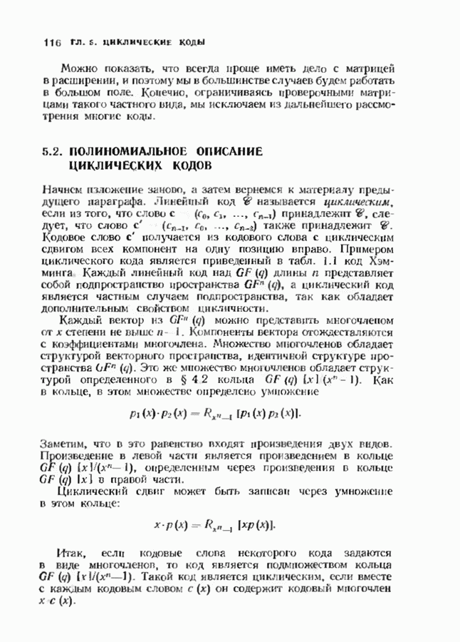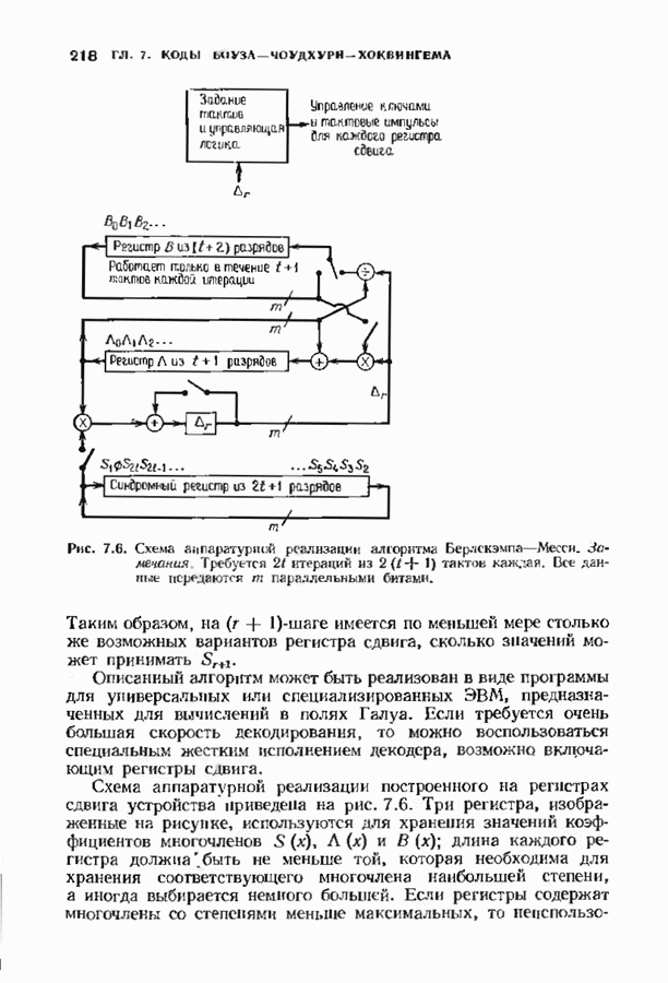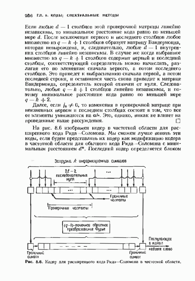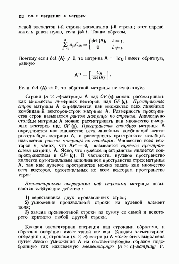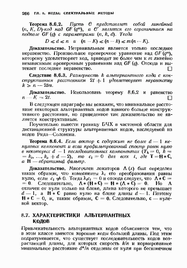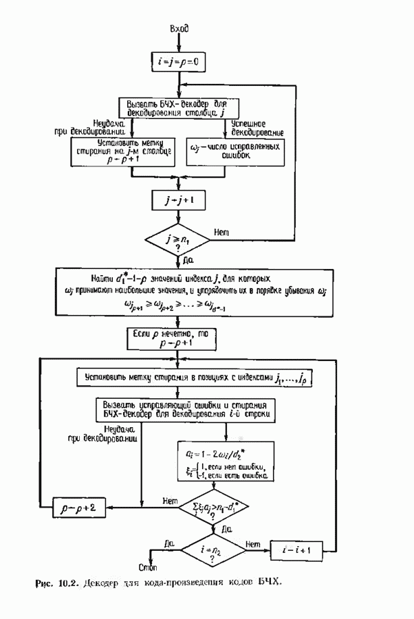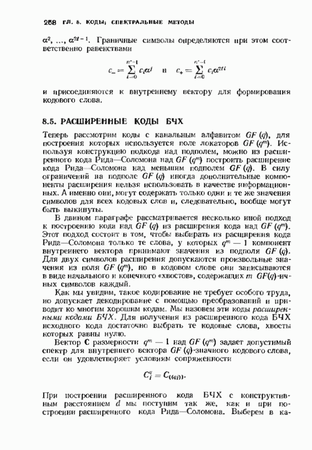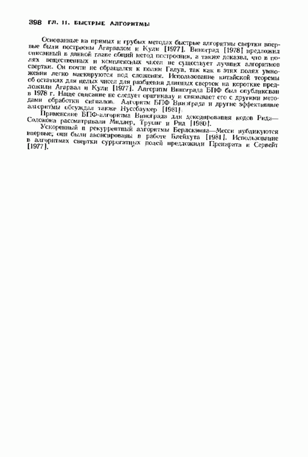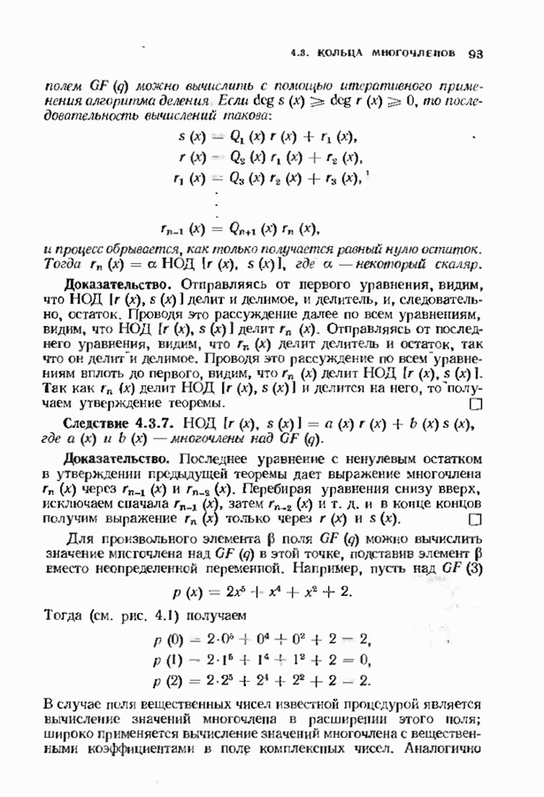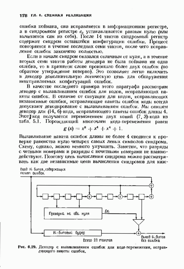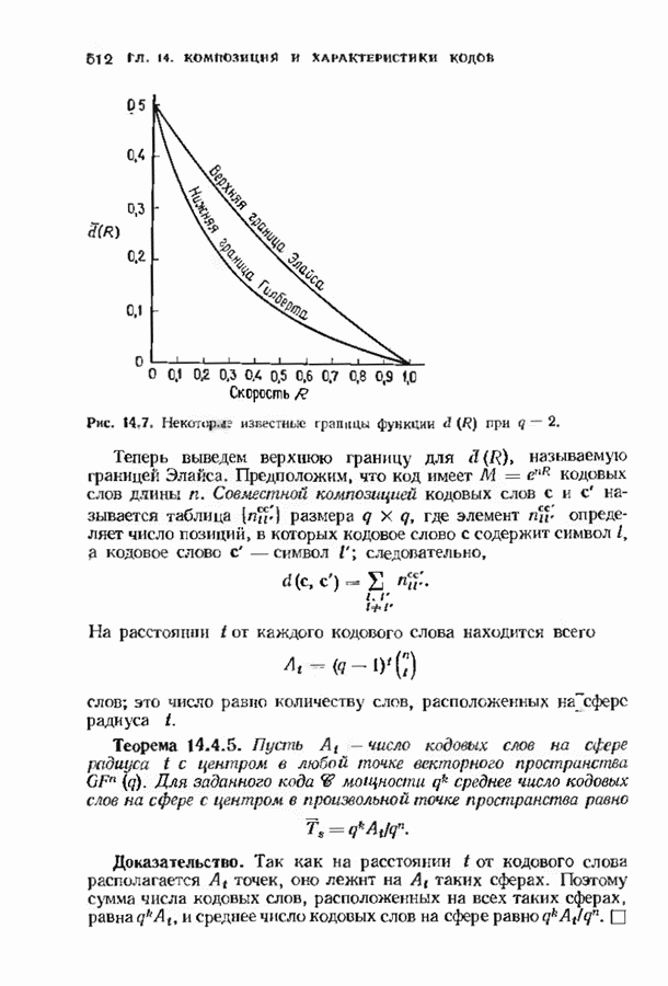 Если произошла только одна ошибка, то одна из оценок, даваемых проверочными суммами, будет неверна; мажоритарное решение дает значение Аналогично может быть продекодирован любой информационный символ, который умножается на одну из строк матрицы После того как эти информационные символы найдены, их вклад в кодовое слово вычитается из принятого слова. Это эквивалентно тому, что мы получаем слово кода Рида — Маллера Этот процесс повторяется до тех пор, пока не будут найдены все информационные биты. ЗАДАЧИ(см. скан) (см. скан) (см. скан) ЗАМЕЧАНИЯИзучение линейных кодов восходит к ранним работам Хэмминга [1950] и Голея 119491. Большинство положений, используемых в настоящее время при изучении линейных колов, заложено Слепяном [1956, 1960]: первые три параграфа тесно связаны с этими работами. Еще до этого Киксу 119537 обратил внимание на связь между линейными кодами и подпространствами векторных пространств. Коды с максимальным расстоянием впервые изучал Синглтон Двоичные коды Хэмминга как коды, исправляющие ошибки, впервые рассматривал Хэмминг, хотя подобные комбнпаторные структуры, рацее встречались в задачах статистики. Недвоичные коды Хэмминга были получены Голсем [1958] и Коком [1959]. Понятие совершенного кода впервые истречается у Голея, хотя он не пользовался таким термином. Делалось много попыток найти новые совершенные коды, но лишь отдельные из них увенчались успехом. В ряде работ Тиотявяйнен и Ван Лиит (работы завершились в 1974 и 1975 гг. соответственно) доказали, что не существует линейных (нетривиальных) совершенных кодов, отличных от кодов Хэмминга или Голея, и не существует нелинейных (нетривиальных) кодов, за исключением кодоп Васильева [1962] и Шёнхейма [1968]. Коды Рида-Маллера были получены Маллером [1954], и в этом же году Рид разработал алгоритм их декодирования. Этот алгоритм необычем тем, что принимает решение, основанное «а мажоритарной логике. Коды Рида-Маллера являются предшественниками обширных семейств мажоритарно декодируемых кодов, с которыми мы встретимся в следующих главах.