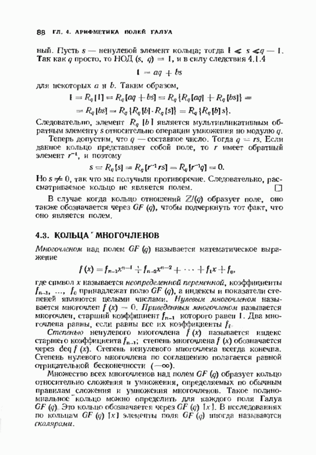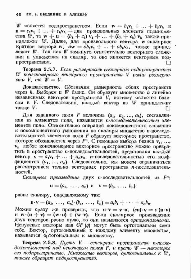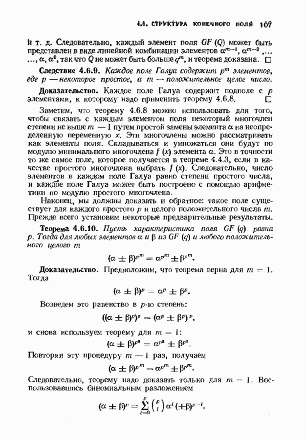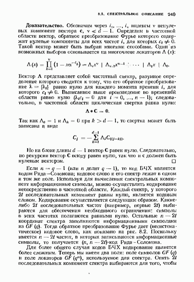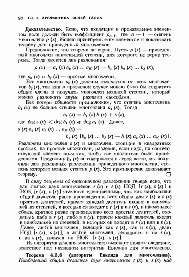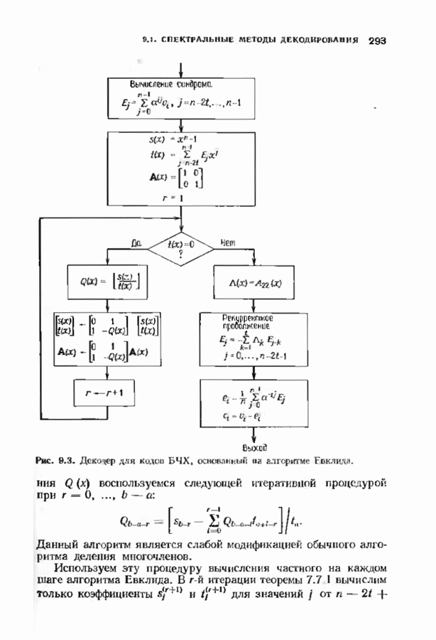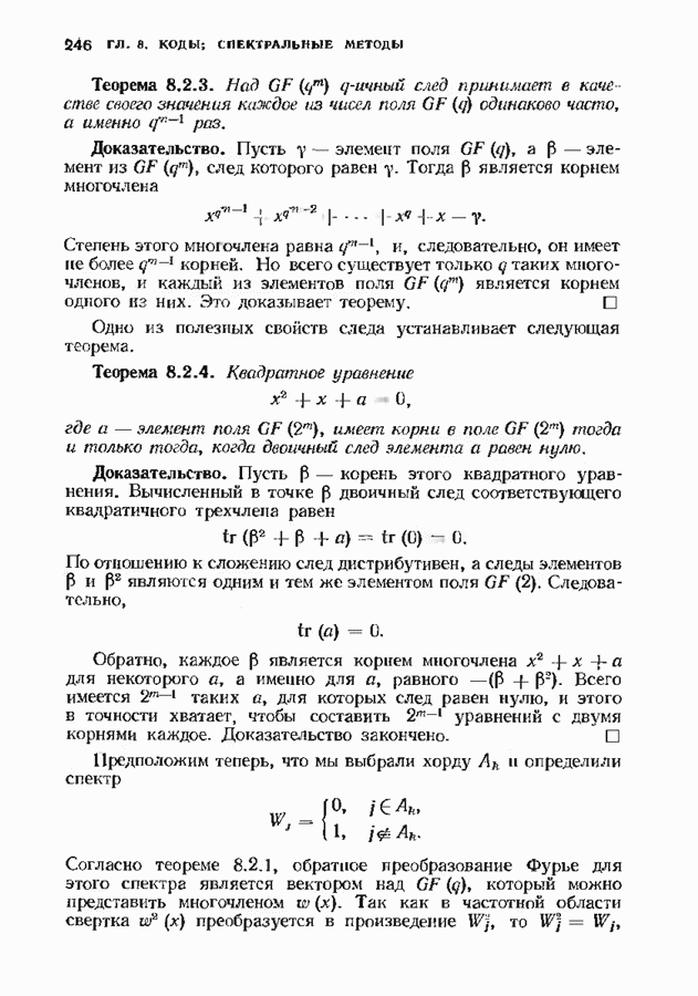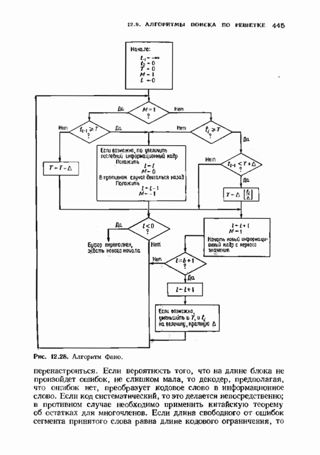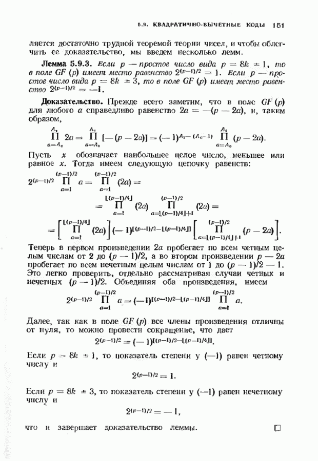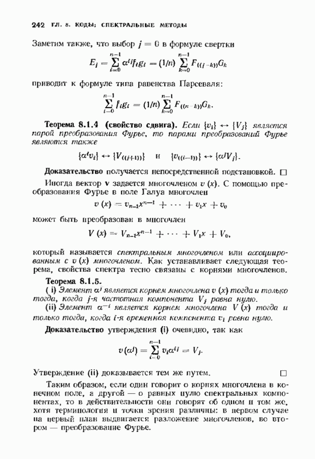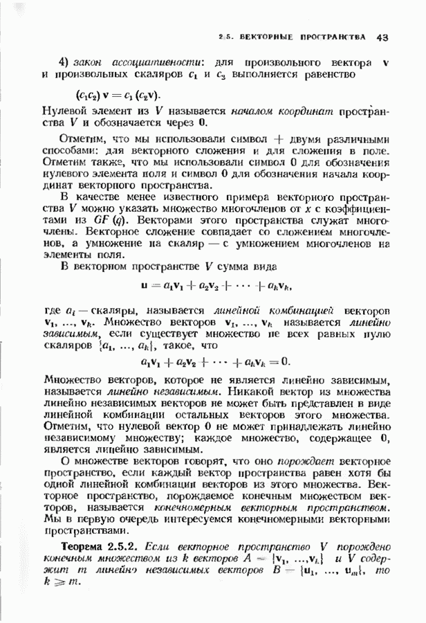 Если произошла только одна ошибка, то одна из оценок, даваемых проверочными суммами, будет неверна; мажоритарное решение дает значение Аналогично может быть продекодирован любой информационный символ, который умножается на одну из строк матрицы После того как эти информационные символы найдены, их вклад в кодовое слово вычитается из принятого слова. Это эквивалентно тому, что мы получаем слово кода Рида — Маллера Этот процесс повторяется до тех пор, пока не будут найдены все информационные биты. ЗАДАЧИ(см. скан) (см. скан) (см. скан) ЗАМЕЧАНИЯИзучение линейных кодов восходит к ранним работам Хэмминга [1950] и Голея 119491. Большинство положений, используемых в настоящее время при изучении линейных колов, заложено Слепяном [1956, 1960]: первые три параграфа тесно связаны с этими работами. Еще до этого Киксу 119537 обратил внимание на связь между линейными кодами и подпространствами векторных пространств. Коды с максимальным расстоянием впервые изучал Синглтон Двоичные коды Хэмминга как коды, исправляющие ошибки, впервые рассматривал Хэмминг, хотя подобные комбнпаторные структуры, рацее встречались в задачах статистики. Недвоичные коды Хэмминга были получены Голсем [1958] и Коком [1959]. Понятие совершенного кода впервые истречается у Голея, хотя он не пользовался таким термином. Делалось много попыток найти новые совершенные коды, но лишь отдельные из них увенчались успехом. В ряде работ Тиотявяйнен и Ван Лиит (работы завершились в 1974 и 1975 гг. соответственно) доказали, что не существует линейных (нетривиальных) совершенных кодов, отличных от кодов Хэмминга или Голея, и не существует нелинейных (нетривиальных) кодов, за исключением кодоп Васильева [1962] и Шёнхейма [1968]. Коды Рида-Маллера были получены Маллером [1954], и в этом же году Рид разработал алгоритм их декодирования. Этот алгоритм необычем тем, что принимает решение, основанное «а мажоритарной логике. Коды Рида-Маллера являются предшественниками обширных семейств мажоритарно декодируемых кодов, с которыми мы встретимся в следующих главах.