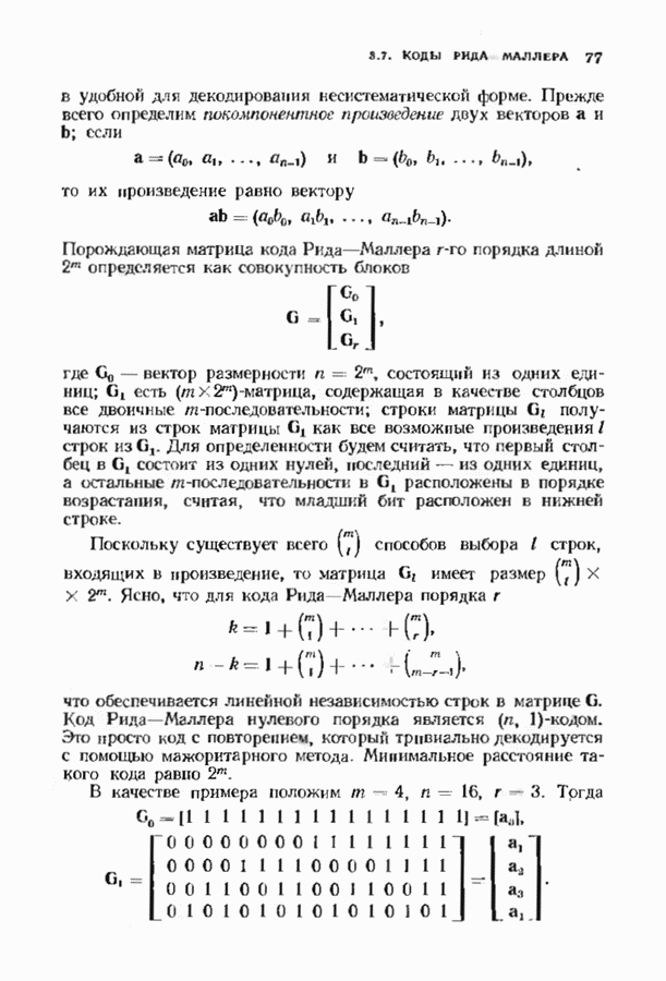 3.7. КОДЫ РИДА—МАЛЛЕРАКоды Рида-Маллера представляют собой класс линейных кодов над Код Рида-Маллера является линейным кодом. Мы определим этот код через порождающую матрицу; эту матрицу будем строить в удобной для декодирования несистематической форме. Прежде всего определим покомпонентное произведение деух векторов