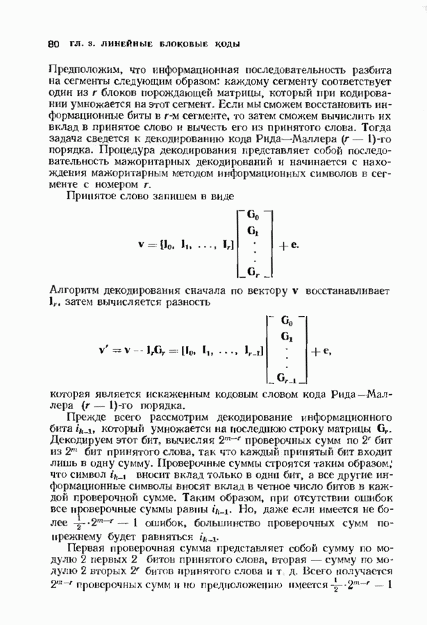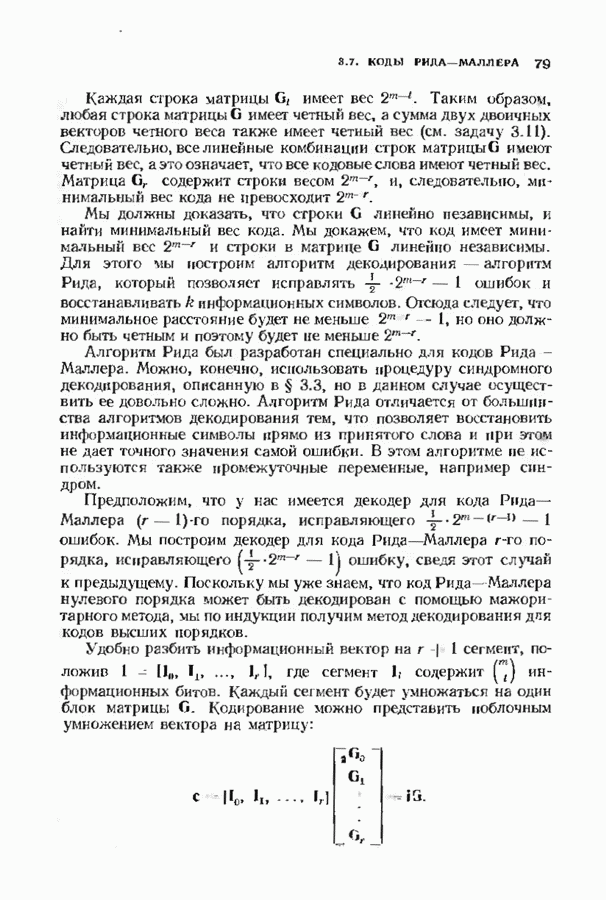 и задает Из определения порождающей матрицы ясно, что код Рида—Маллера Каждая строка матрицы Мы должны доказать, что строки Алгоритм Рида был разработан специально для кодов Рида-Маллера. Можно, конечно, использовать процедуру синдромного декодирования, описанную в § 3.3, но в данном случае осуществить ее довольно сложно. Алгоритм Рида отличается от большинства алгоритмов декодирования тем, что позволяет восстановить информационные символы прямо из принятого слова и при этом не дает точного значения самой ошибки. В этом алгоритме не используются также промежуточные переменные, например синдром. Предположим, что у нас имеется декодер для кода Рида-Маллера Удобно разбить информационный вектор на