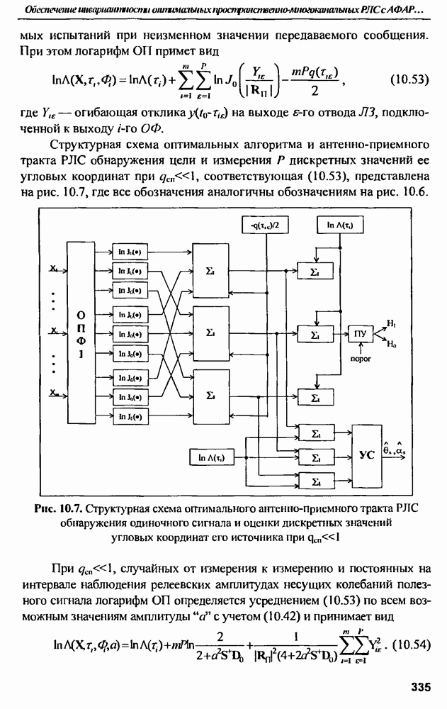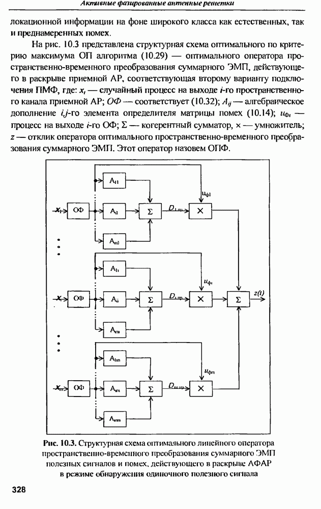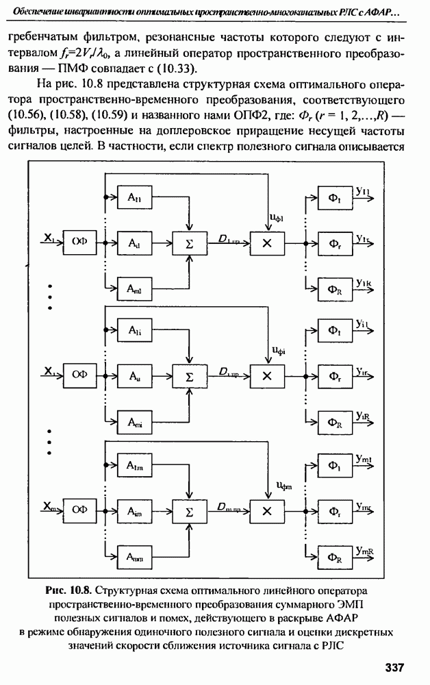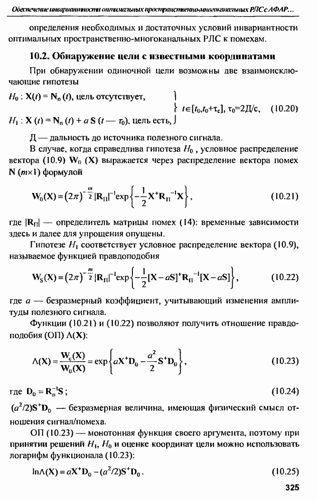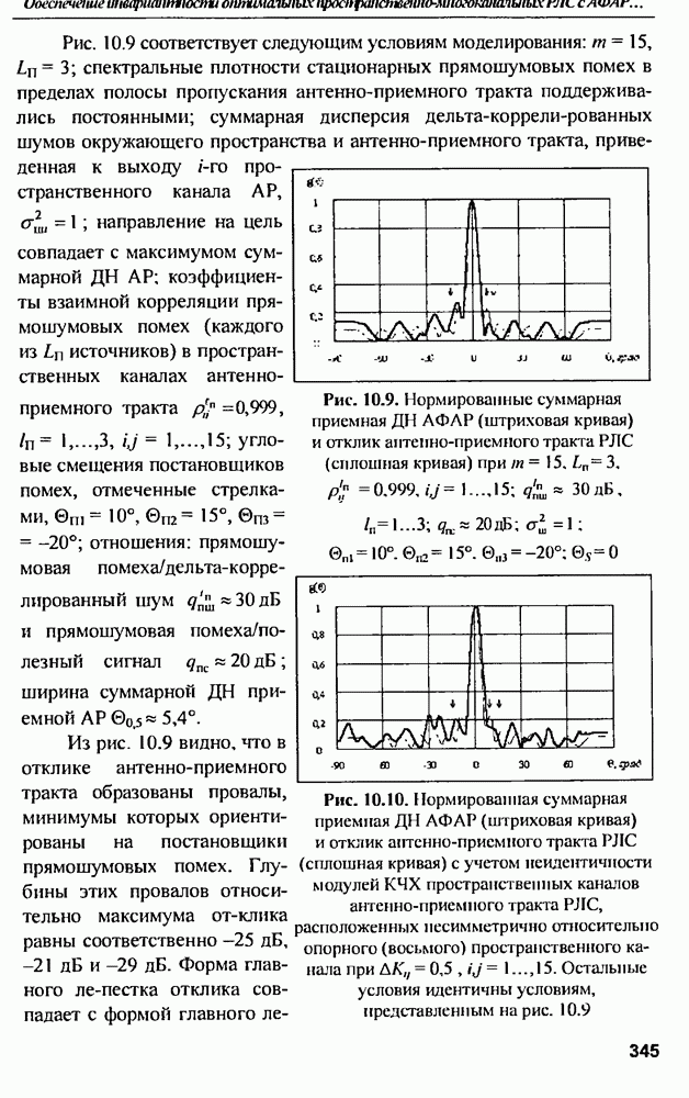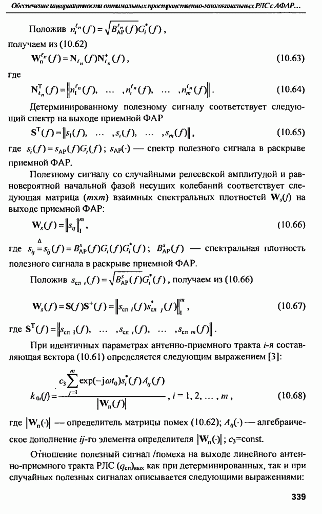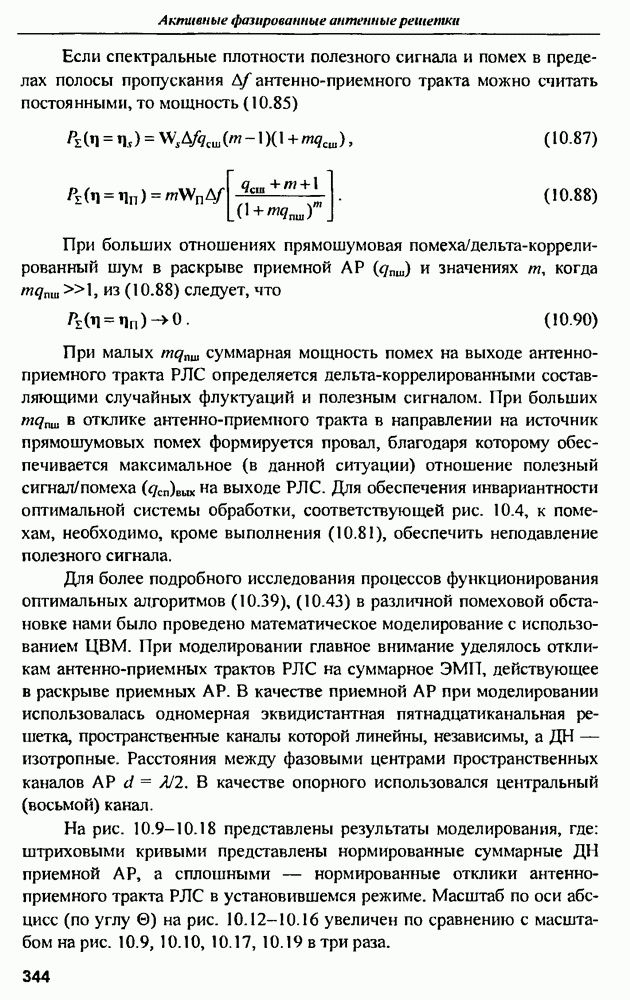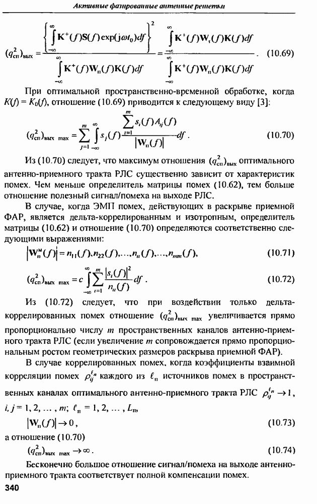 выродиться на любой частоте. Поэтому оптимальные пространственно-m-канальные РЛС обеспечивают при выполнении условия (10.81) и неподавлении полезных сигналов максимально возможное в каждой конкретной фоноцелевой и помеховой ситуации отношение полезный сигнал/помеха на выходе.