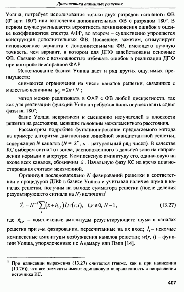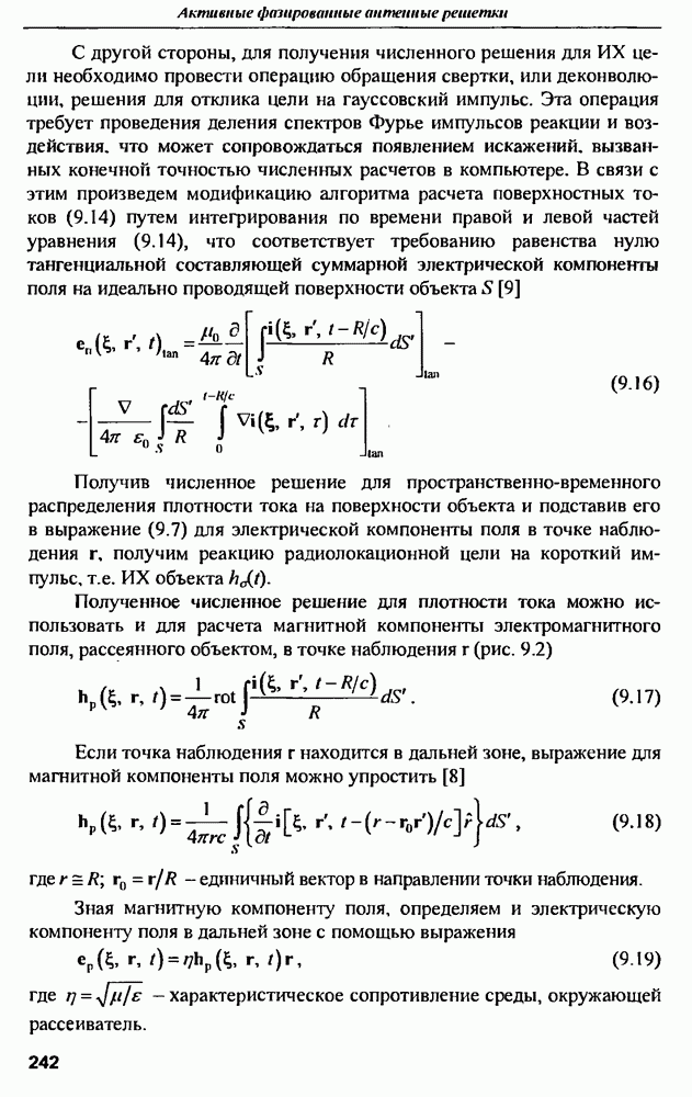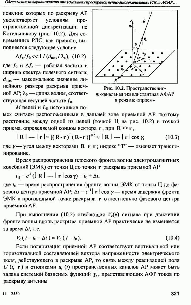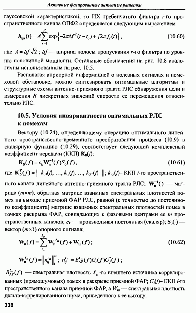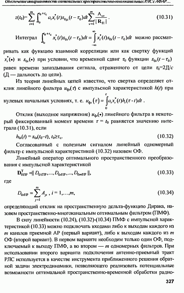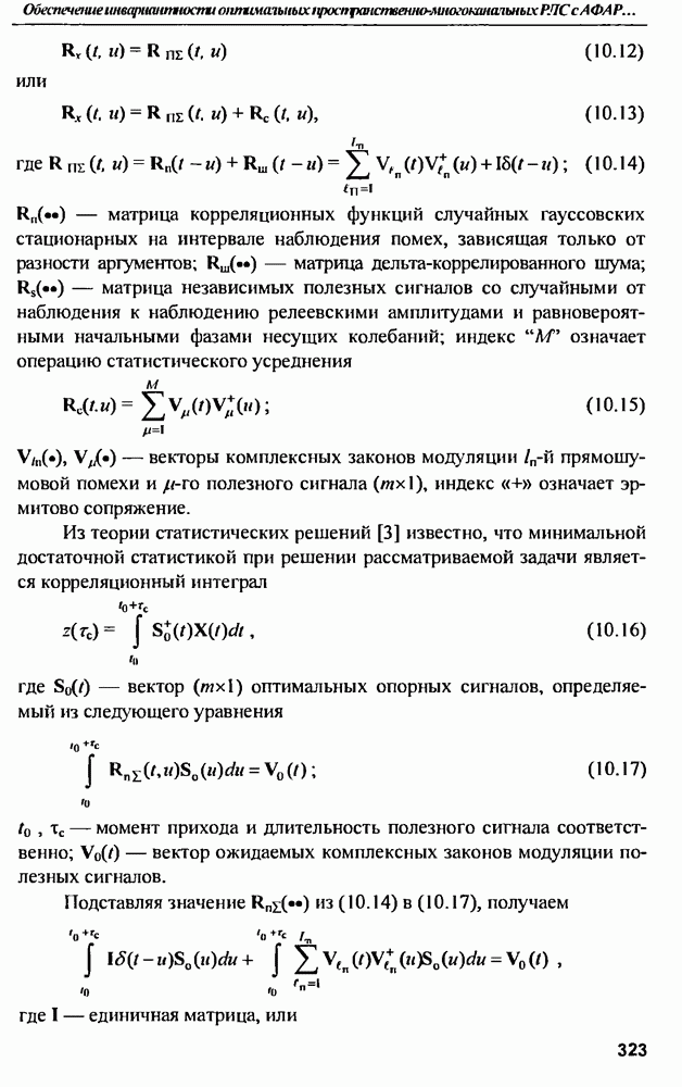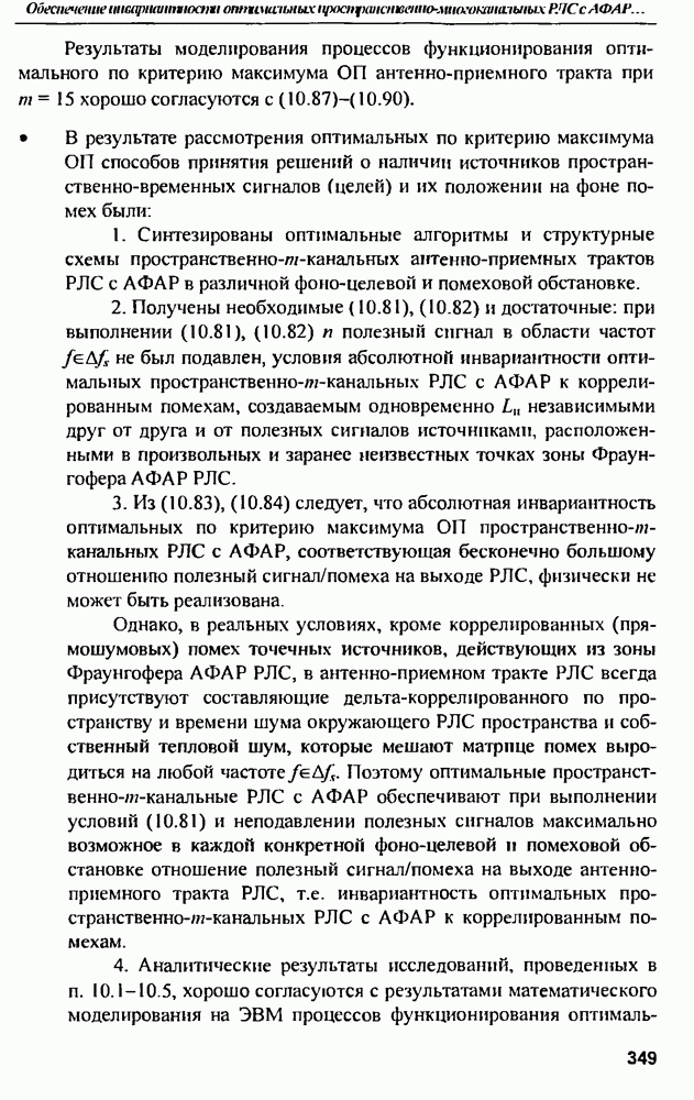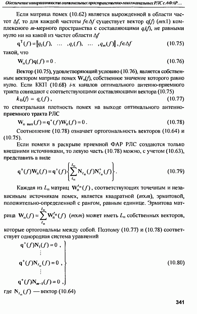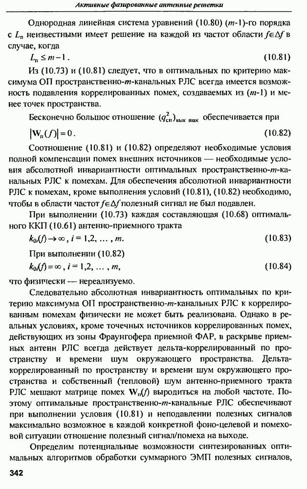 Соотношение (10.81) и (10.82) определяют необходимые условия полной компенсации помех внешних источников — необходимые условия абсолютной инвариантности оптимальных пространственно-m-канальных РЛС к помехам. Для обеспечения абсолютной инвариантности РЛС к помехам, кроме выполнения условий (10.81), (10.82) необходимо, чтобы в области частот