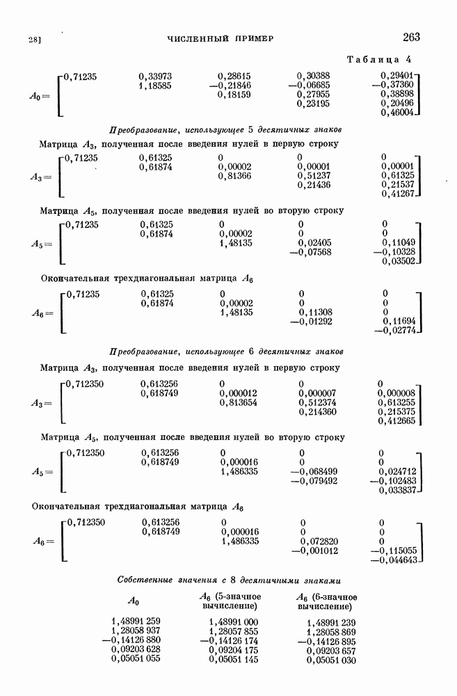 это дало характеристическое уравнение, правильное с точностью до 60 двоичных знаков; собственные значения были правильными с той же точностью.