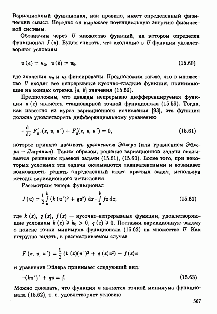 которое принято называть уравнением Эйлера (или уравнением Эйлера — Лагранжа). Таким образом, решение вариационной задачи оказывается решением краевой задачи (15.61), (15.60). Более того, при некоторых условиях эти задачи оказываются эквивалентными и возникает возможность решать определенный класс краевых задач, используя методы вариационного исчисления. Рассмотрим теперь функционал