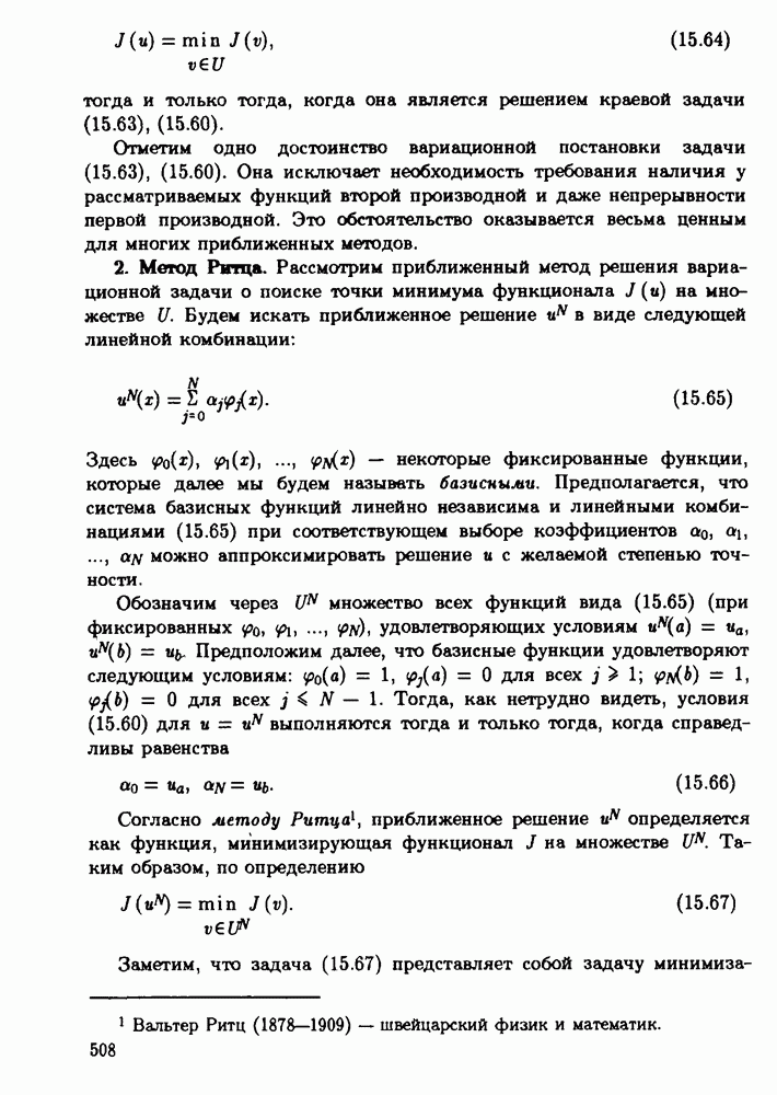 тогда и только тогда, когда она является решением краевой задачи (15.63), (15.60). Отметим одно достоинство вариационной постановки задачи (15.63), (15.60). Она исключает необходимость требования наличия у рассматриваемых функций второй производной и даже непрерывности первой производной. Это обстоятельство оказывается весьма ценным для многих приближенных методов. 2. Метод Ритца.Рассмотрим приближенный метод решения вариационной задачи о поиске точки минимума функционала