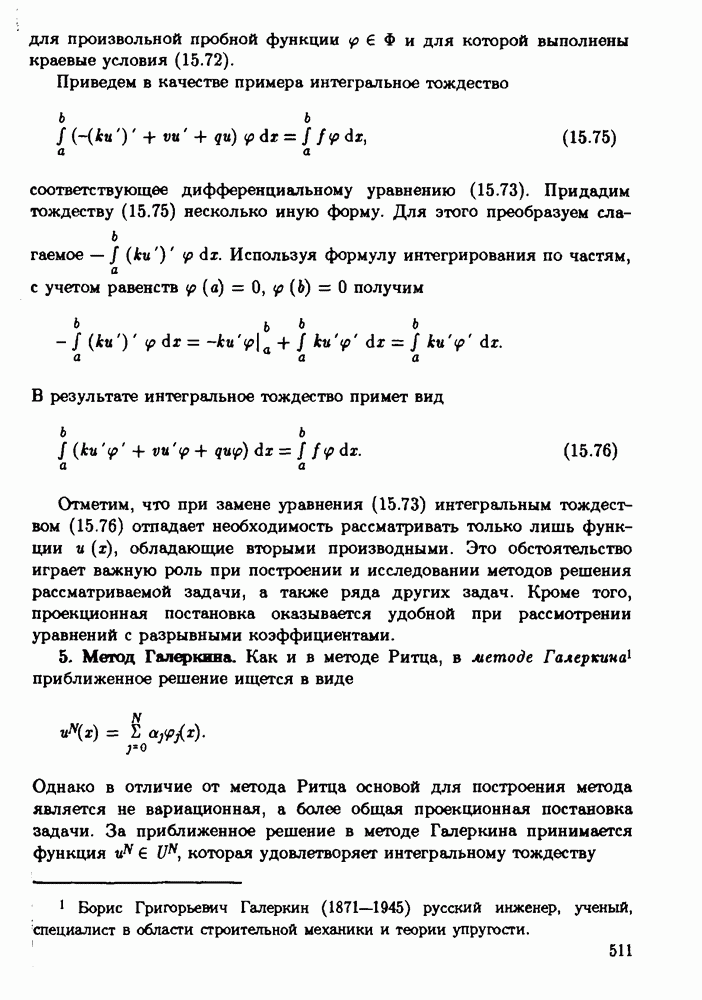 для любой пробной функции Для задачи (15.71), (15.72) метод Галеркина с использованием интегрального тождества (15.76) приводит к следующей системе уравнений:
