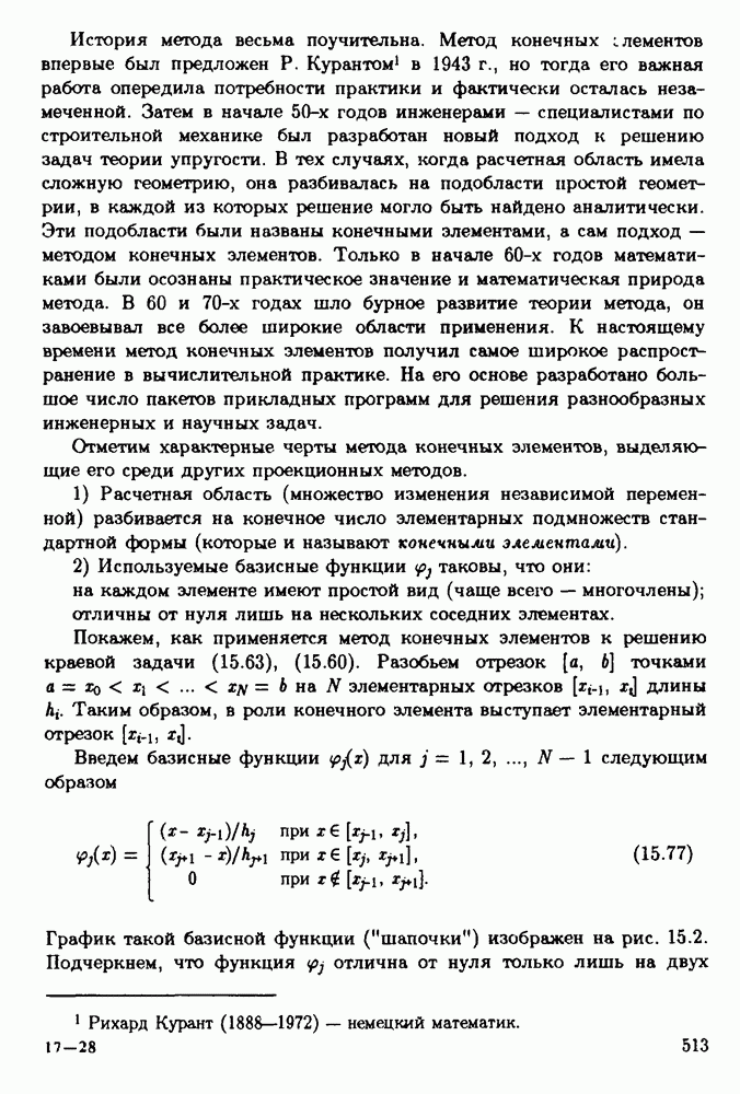 Заметим, что эта система при Замечание. Приближенное решение ил, определяемое методом конечных разностей, задается только в узлах сетки Как мы отмечали в предыдущих параграфах, системы сеточных уравнений, получаемые методом конечных разностей, обладают тем важным свойством, что матрицы коэффициентов, этих систем являются разреженными (более того, в рассмотренных примерах матрицы были трехдиагональными). Для решения таких систем разработаны эффективные методы. В общем случае применение методов Ритца и Галеркина к решению краевых задач приводит к необходимости вычислять решения систем уравнений вида 6. Метод конечных элементов.Метод конечных элементов представляет собой разновидность проекционных методов, основанную на специальном выборе базисных функций. История метода весьма поучительна. Метод конечных элементов впервые был предложен Р. Курантом в 1943 г., но тогда его важная работа опередила потребности практики и фактически осталась незамеченной. Затем в начале 50-х годов инженерами — специалистами по строительной механике был разработан новый подход к решению задач теории упругости. В тех случаях, когда расчетная область имела сложную геометрию, она разбивалась на подобласти простой геометрии, в каждой из которых решение могло быть найдено аналитически. Эти подобласти были названы конечными элементами, а сам подход — методом конечных элементов. Только в начале 60-х годов математиками были осознаны практическое значение и математическая природа метода. В 60 и 70-х годах шло бурное развитие теории метода, он завоевывал все более широкие области применения. К настоящему времени метод конечных элементов получил самое широкое распространение в вычислительной практике. На его основе разработано большое число пакетов прикладных программ для решения разнообразных инженерных и научных задач. Отметим характерные черты метода конечных элементов, выделяющие его среди других проекционных методов. 1) Расчетная область (множество изменения независимой переменной) разбивается на конечное число элементарных подмножеств стандартной формы (которые и называют конечными элементами). 2) Используемые базисные функции отличны от нуля лишь на нескольких соседних элементах. Покажем, как применяется метод конечных элементов к решению краевой задачи (15.63), (15.60). Разобьем отрезок Введем базисные функции