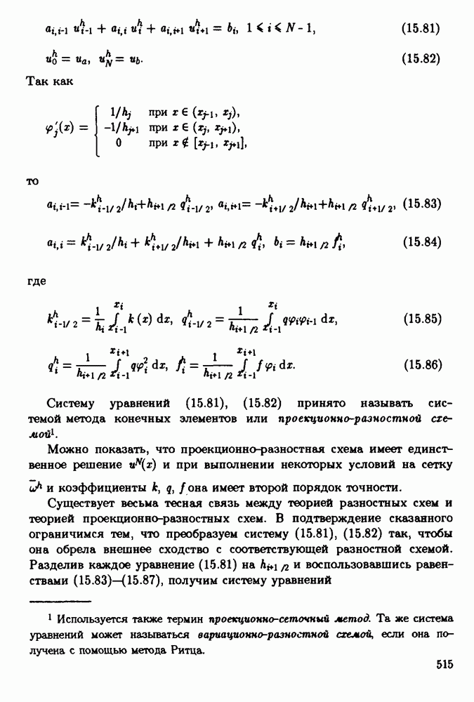 Систему уравнений (15.81), (15.82) принято называть системой метода конечных элементов или проекционно-раэностной схемой. Можно показать, что проекционно-разностная схема имеет единственное решение Существует весьма тесная связь между теорией разностных схем и теорией проекционно-разностных схем. В подтверждение сказанного ограничимся тем, что преобразуем систему (15.81), (15.82) так, чтобы она обрела внешнее сходство с соответствующей разностной схемой. Разделив каждое уравнение (15.81) на