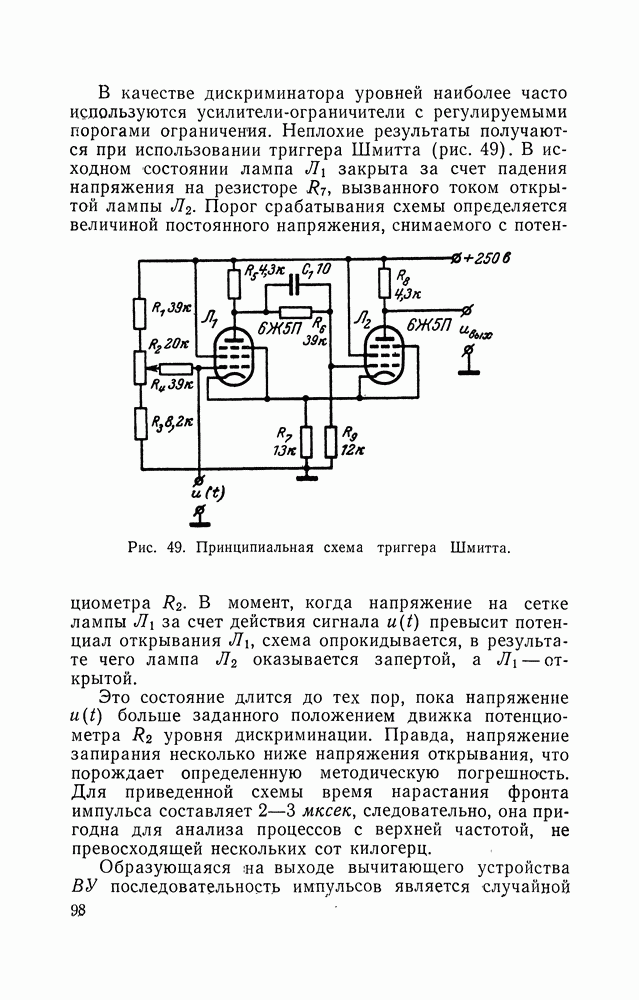 В качестве дискриминатора уровней наиболее часто используются усилители-ограничители с регулируемыми порогами ограничения. Неплохие результаты получаются при использовании триггера Шмитта (рис. 49). В исходном состоянии лампа