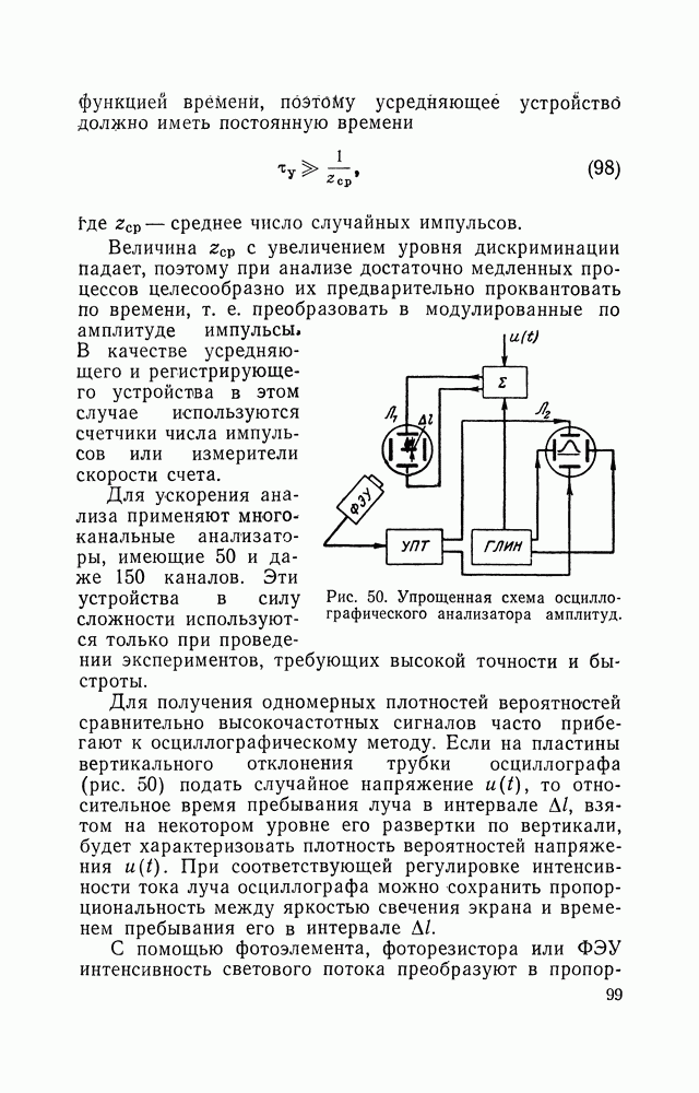 Рис. 50. Упрощенная схема осцилло-графического анализатора амплитуд. Для ускорения анализа применяют многоканальные анализаторы, имеющие 50 и даже 150 каналов. Эти устройства в силу сложности используются только при проведении экспериментов, требующих высокой точности и быстроты. Для получения одномерных плотностей вероятностей сравнительно высокочастотных сигналов часто прибегают к осциллографическому методу. Если на пластины вертикального отклонения трубки осциллографа (рис. 50) подать случайное напряжение и С помощью фотоэлемента, фоторезистора или ФЭУ интенсивность светового потока преобразуют в пропорциональное ей напряжение, которое определяется выражением