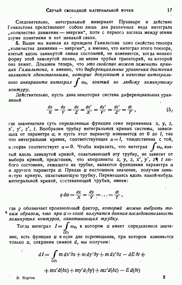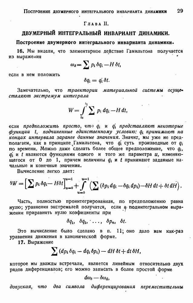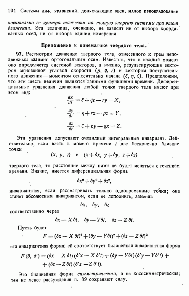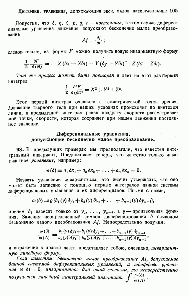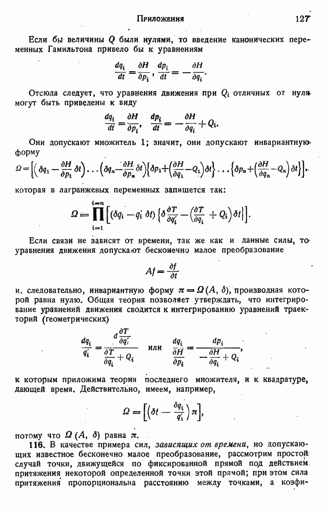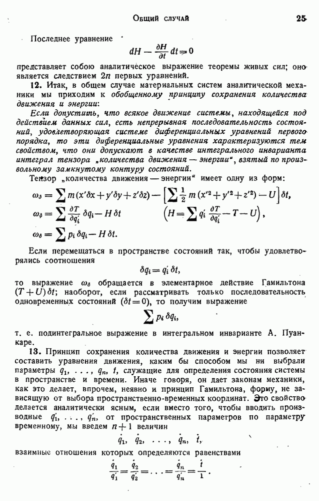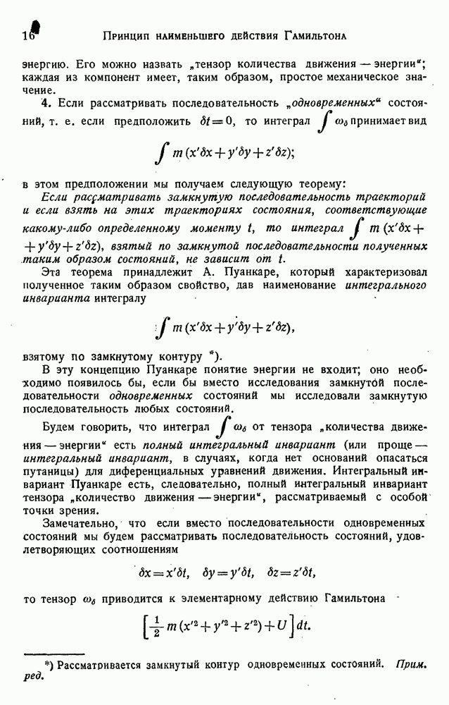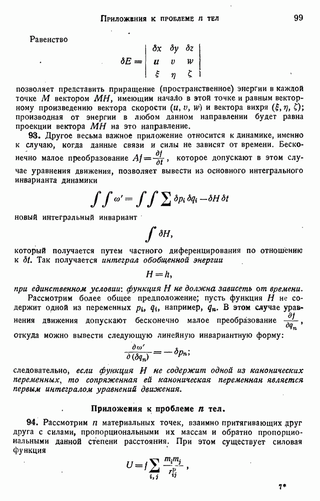 позволяет представить приращение (пространственное) энергии в каждой точке 93. Другое весьма важное приложение относится к динамике, именно к случаю, когда данные связи и силы не зависят от времени. Бесконечно малое преобразование которое допускают в этом случае уравнения движения, позволяет вывести из основного интегрального инварианта динамики