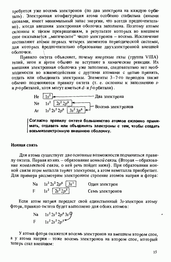 ХИМИЧЕСКАЯ СВЯЗЬПравило октета. Почему образуется связь?Движущей силой, заставляющей атомы соединяться между собой, является стремление принять, отдать или объединить электроны с тем, чтобы получить полностью заполненную внешнюю электронную оболочку. У водорода требуется уже восемь электронов (по два электрона на каждую орбиталь). Электронная конфигурация атома особенно стабильна (иными словами, имеет минимальный запас энергии, что всегда предпочтительно), когда внешняя электронная оболочка заполнена. Поэтому атомы склонны к таким превращениям, в результате которых во внешнем слое оказывается "магическое" число электронов — восемь. Исключение составляют атрмы первых четырех элементов периодической системы, для которых Предпочтительно образование двухэлектронной внешней оболочки. Правило октета объясняет, почему инертные газы (группа VIIIA) гелий, неон и аргон обычно не вступают в химические реакции. Их внешняя электронная оболочка уже заполнена, следовательно нет необходимости во взаимодействии с другими атомами с целью принять, отдать или объединить электроны. Элементы 3-7-го периодов также обычно подчиняются правилу октета (т. е. склонны к заполнению
