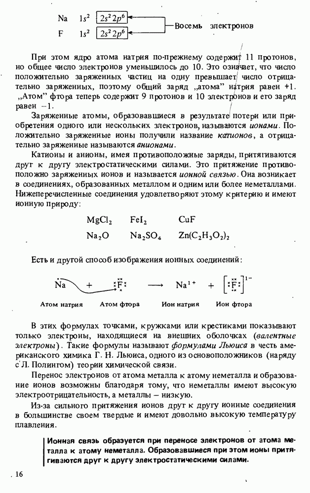 При этом ядро атома натрия по-прежнему содержи 11 протонов, но общее число электронов уменьшилось до 10. Это означает, что число положительно заряженных частиц на одну превышает число отрицательно заряженных, поэтому общий заряд "атома" натрия равен +1. "Атом" фтора теперь содержит 9 протонов и 10 электронов и его заряд равен Заряженные атомы, образовавшиеся в результате! потери или приобретения одногр или нескольких электронов, называется ионами. Положительно заряженные ионы получили название катионов, а отрицательно заряженные называются анионами. Катионы и анионы, имея противоположные заряды, притягиваются друг к другу электростатическими силами. Это притяжение противоположно заряженных ионов и называется ионной связью. Она возникает в соединениях, образованных металлом и одним или более неметаллами. Нижеперечисленные соединения удовлетворяют этому критерию и имеют ионную природу: