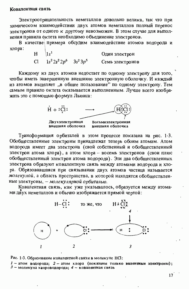 Трансформация орбиталей в этом процессе показана на рис. 1-3. Обобществленные электроны принадлежат теперь обоим атомам. Атом водорода имеет два электрона (свой собственный и обобществленный электрон атома хлора), а атом хлора — восемь электронов (свои плюс обобществленный электрон атома водорода). Эти два обобществленных электрона образуют ковалентную связь между атомами водорода и хлора. Образовавшаяся при связывании двух атомов частица называется молекулой, а область пространства, в которой находятся обобществленные электроны, - молекулярной орбиталью. Ковалентная связь, как уже указывалось, образуется между атомами двух неметаллов и обычно изображается прямой чертой: