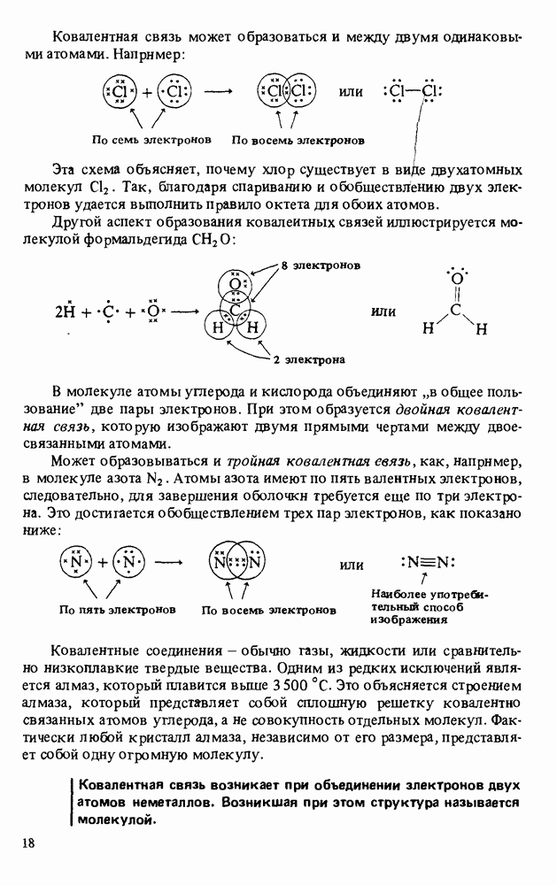 Эта схема объясняет, почему хлор существует в виде двухатомных молекул Другой аспект образования ковалеитных связей иллюстрируется молекулой формальдегида
