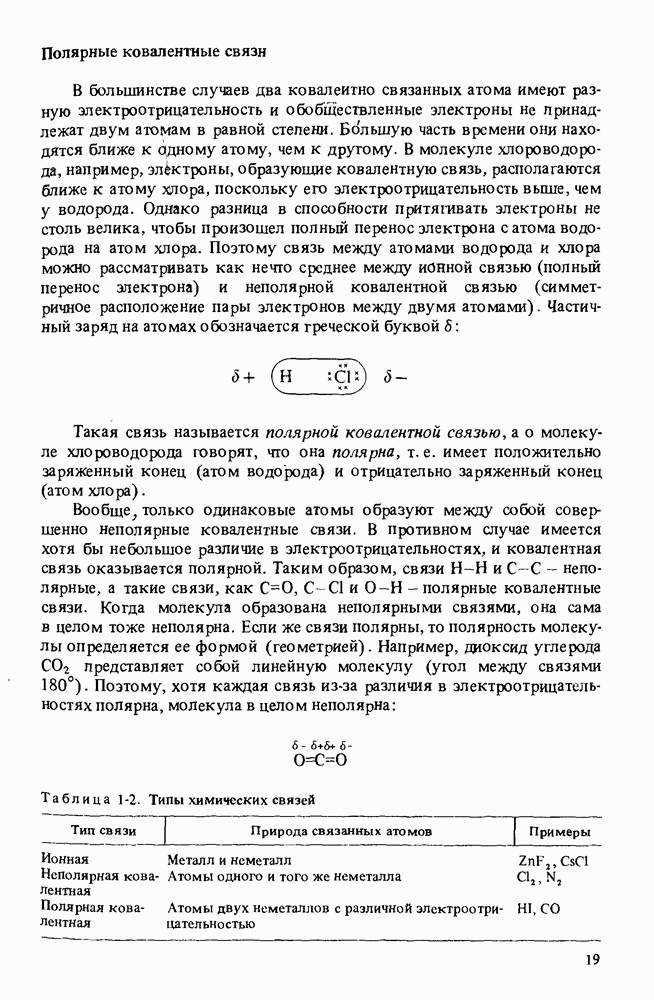 Таблица 1-2. (см. скан) Типы химических связей Таблица 1-3. (см. скан) Природа связи в некоторых соединениях Концы молекулы заряжены отрицательно, а центр положительно. Полярности обеих связей компенсируют друг друга, поэтому молекула неполярнэ. В отличие от молекулы