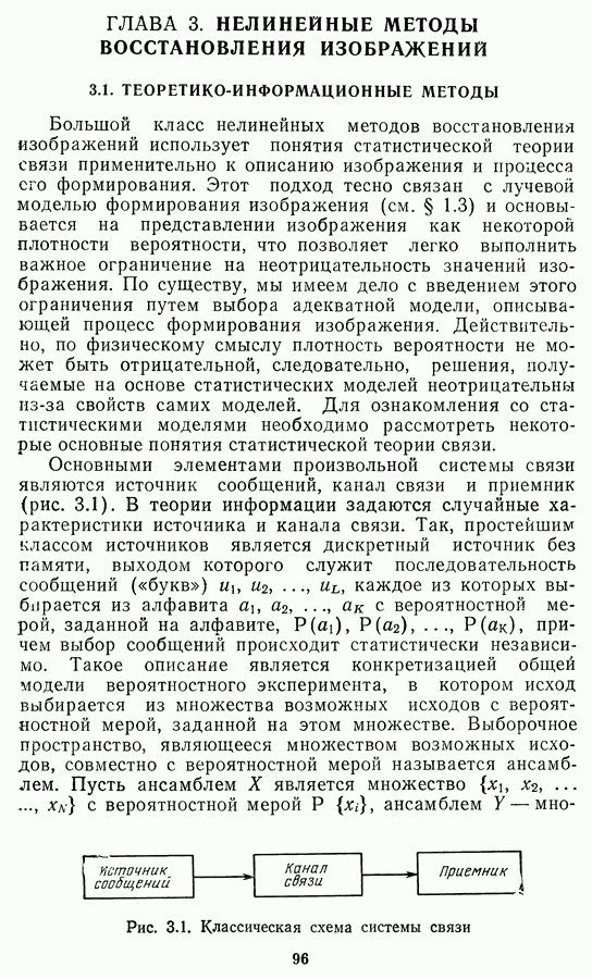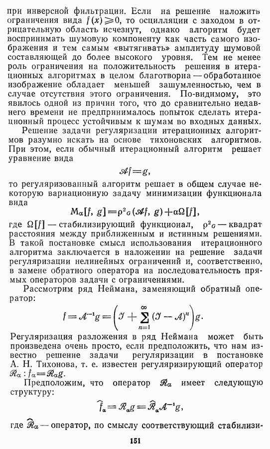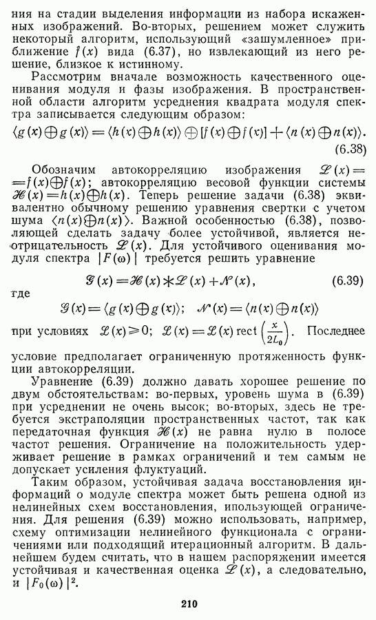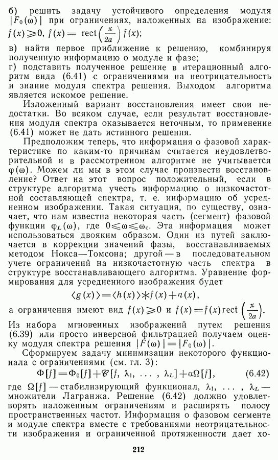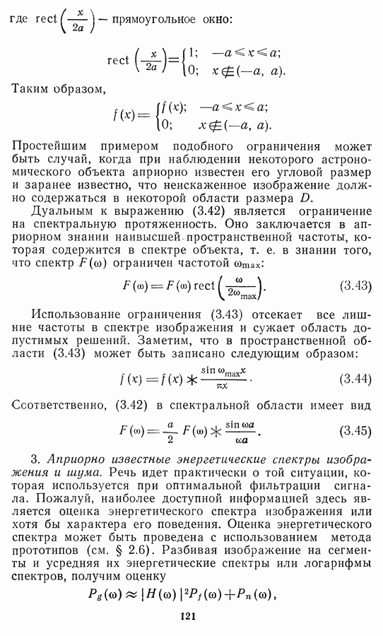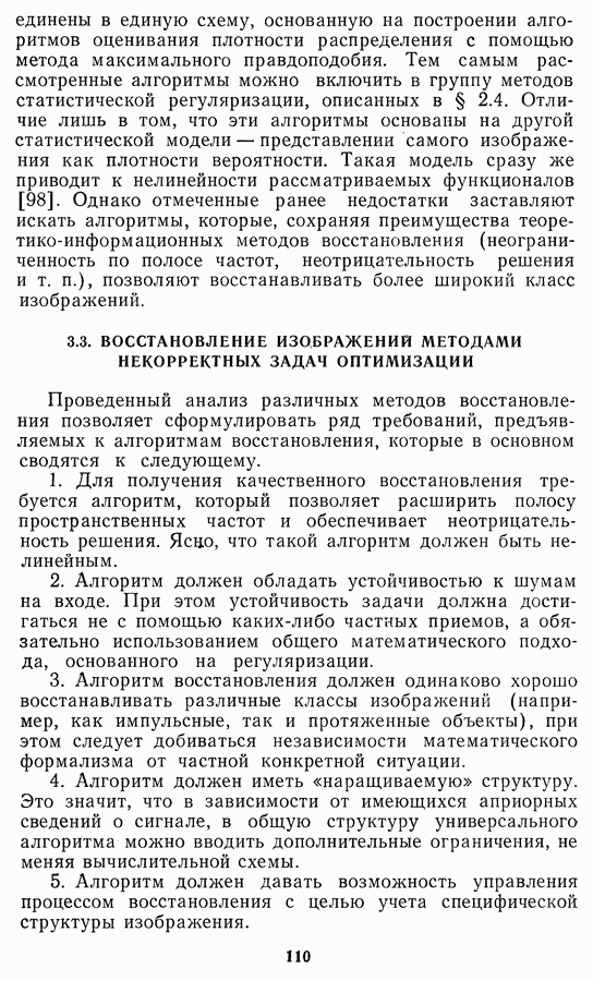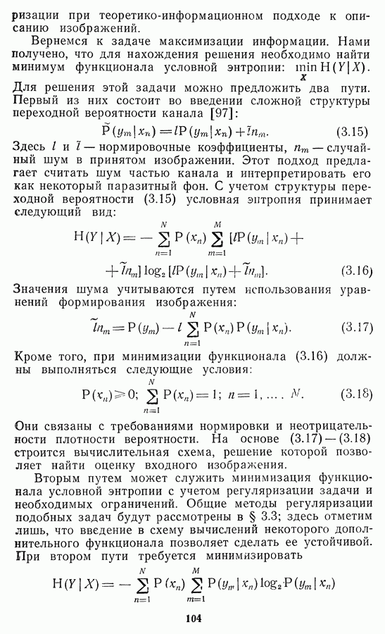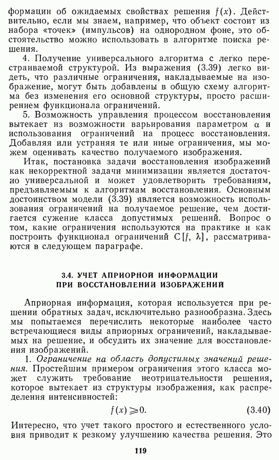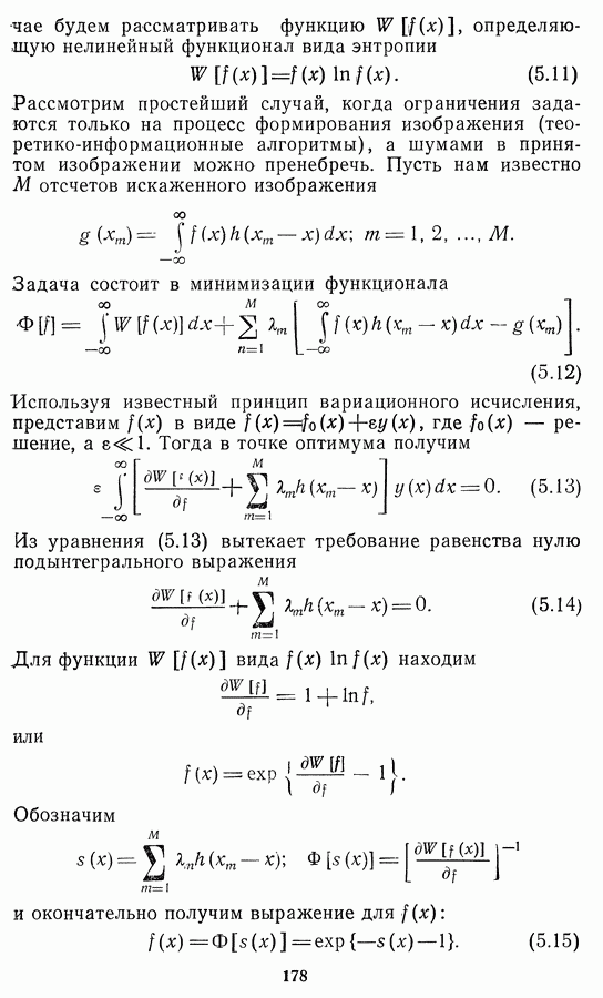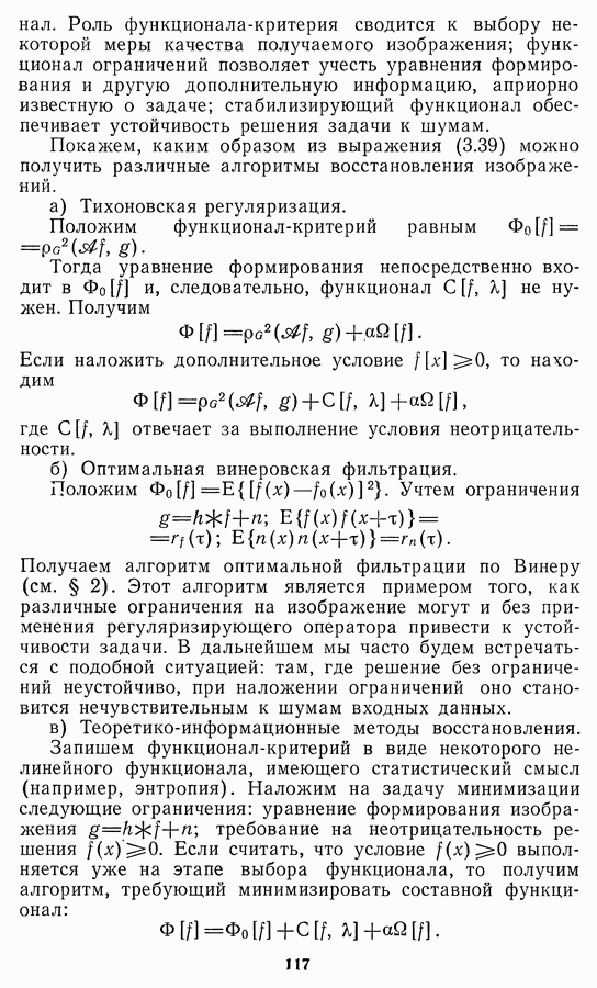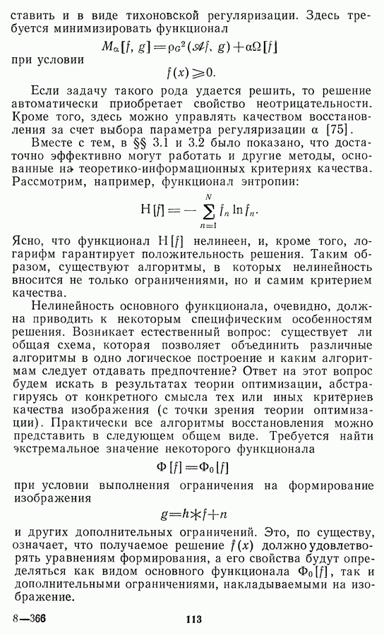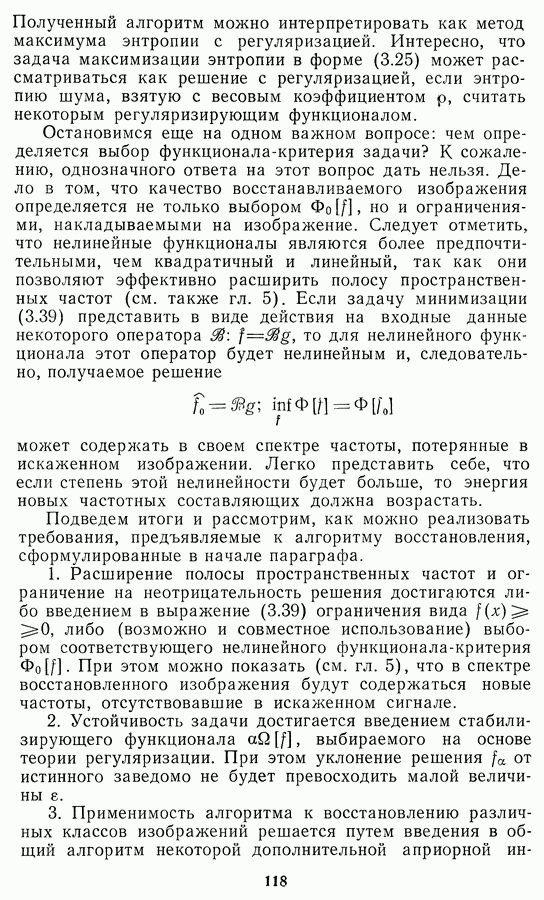 Этот прием, однако, оставляет неясным физический смысл производных преобразований. Еще один недостаток метода максимума энтропии состоит в том, что наилучшие результаты с его помощью получаются при восстановлении объектов, состоящих из отдельных импульсов на однородном фоне, а попытки применения метода к пространственно протяженным объектам вызывают появление флуктуаций [60]. Изложенные результаты, касающиеся методов максимума энтропии и максимума информации, могут быть объединены в единую схему, основанную на построении алгоритмов оценивания плотности распределения с помощью метода максимального правдоподобия. Тем самым рассмотренные алгоритмы можно включить в группу методов статистической регуляризации, описанных в § 2.4. Отличие лишь в том, что эти алгоритмы основаны на другой статистической модели — представлении самого изображения как плотности вероятности. Такая модель сразу же приводит к нелинейности рассматриваемых функционалов [98]. Однако отмеченные ранее недостатки заставляют искать алгоритмы, которые, сохраняя преимущества теоретико-информационных методов восстановления (неограниченность по полосе частот, неотрицательность решения и т. п.), позволяют восстанавливать более широкий класс изображений.