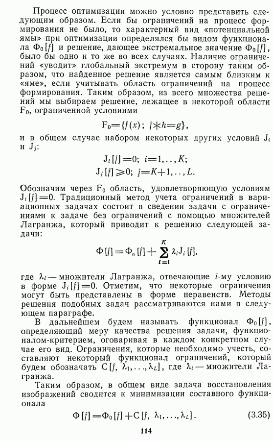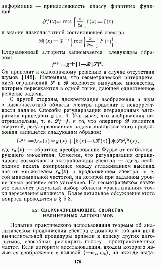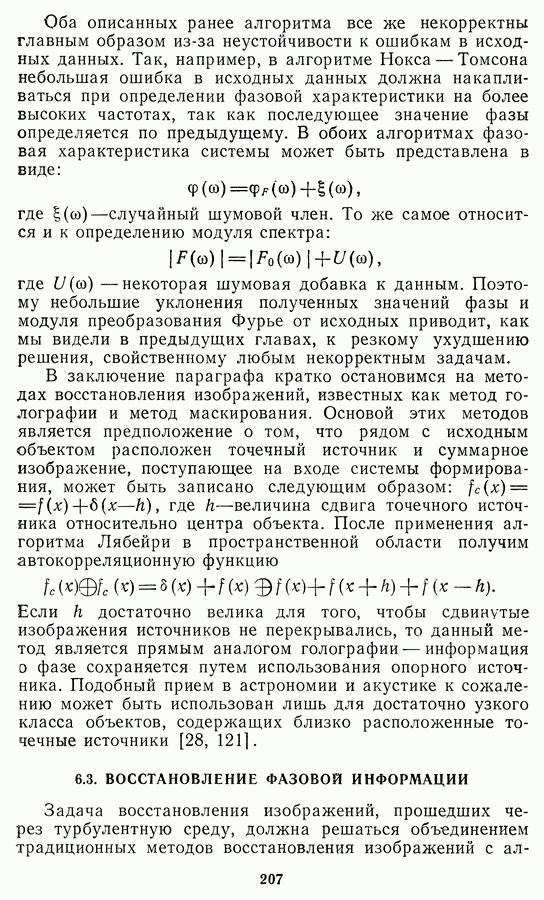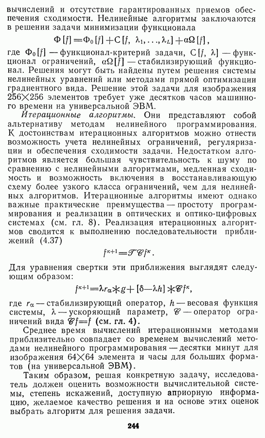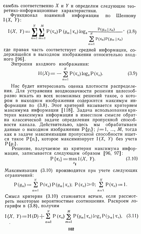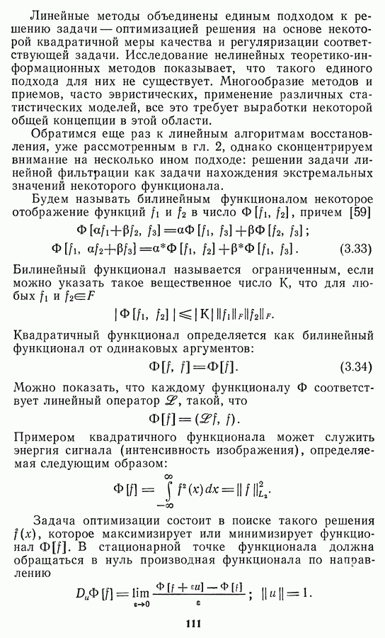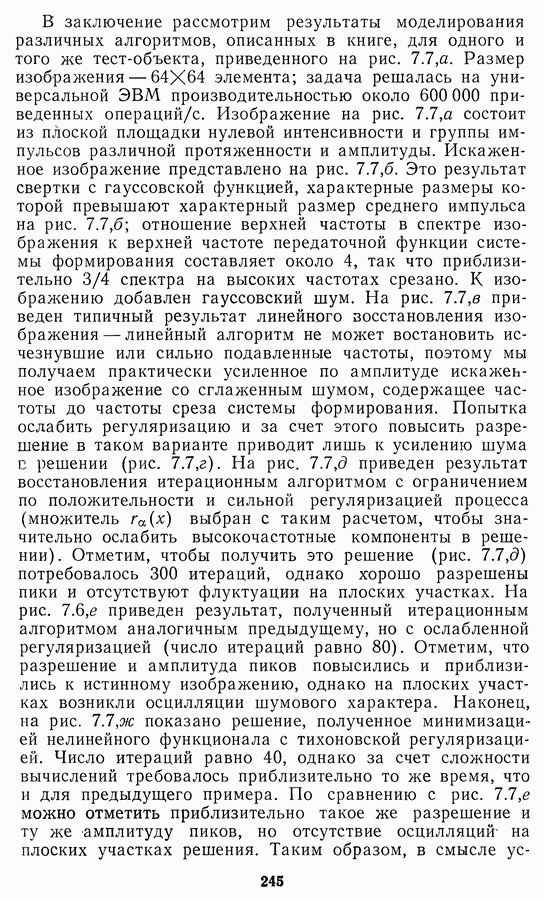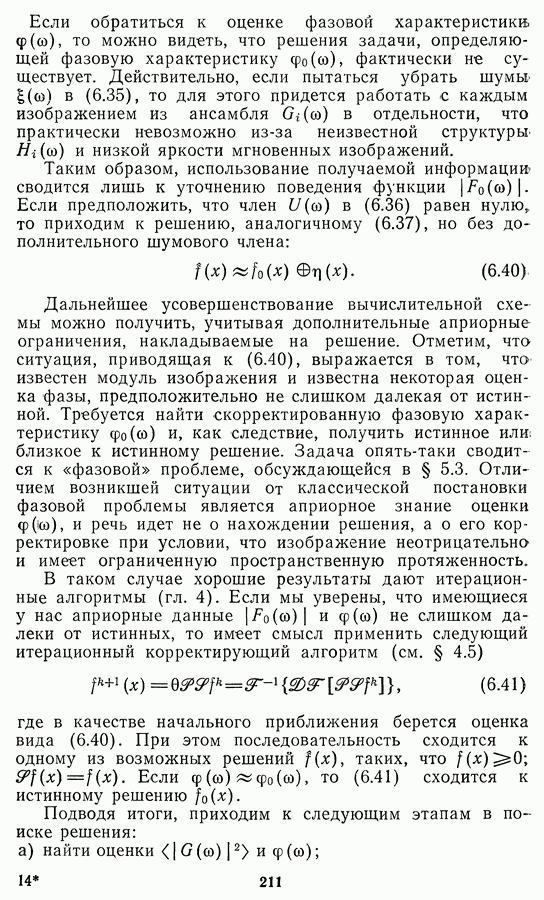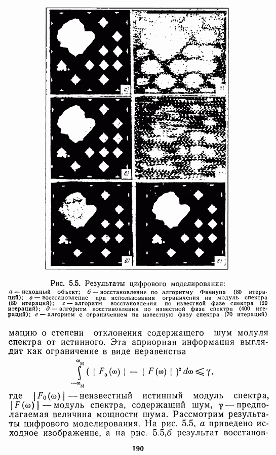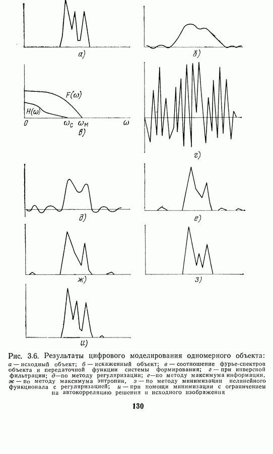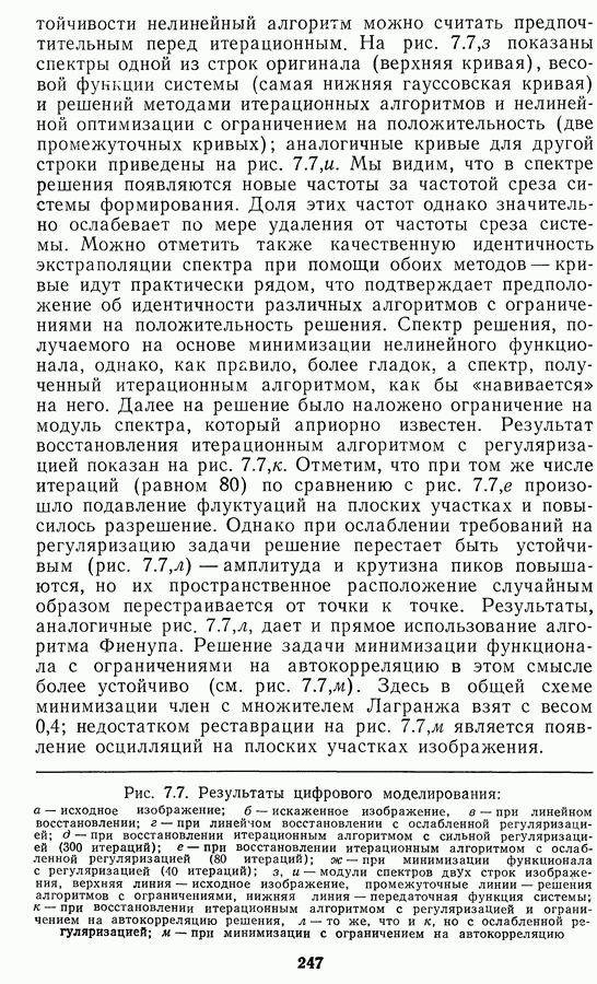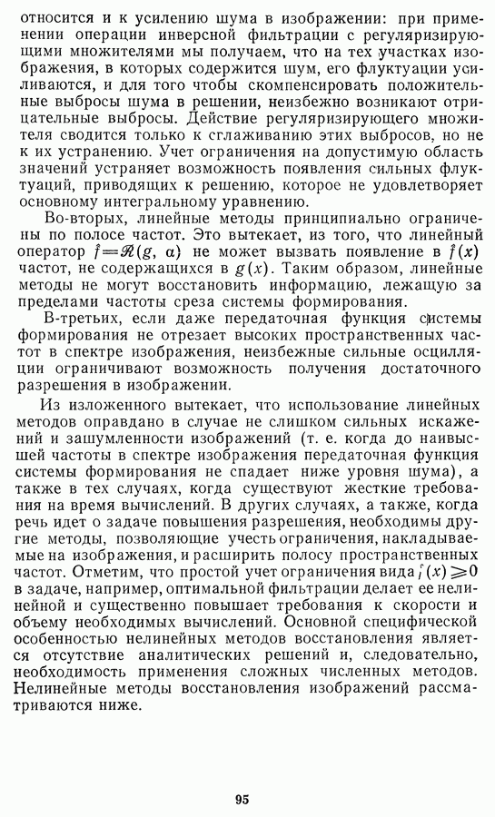 Этот прием, однако, оставляет неясным физический смысл производных преобразований. Еще один недостаток метода максимума энтропии состоит в том, что наилучшие результаты с его помощью получаются при восстановлении объектов, состоящих из отдельных импульсов на однородном фоне, а попытки применения метода к пространственно протяженным объектам вызывают появление флуктуаций [60]. Изложенные результаты, касающиеся методов максимума энтропии и максимума информации, могут быть объединены в единую схему, основанную на построении алгоритмов оценивания плотности распределения с помощью метода максимального правдоподобия. Тем самым рассмотренные алгоритмы можно включить в группу методов статистической регуляризации, описанных в § 2.4. Отличие лишь в том, что эти алгоритмы основаны на другой статистической модели — представлении самого изображения как плотности вероятности. Такая модель сразу же приводит к нелинейности рассматриваемых функционалов [98]. Однако отмеченные ранее недостатки заставляют искать алгоритмы, которые, сохраняя преимущества теоретико-информационных методов восстановления (неограниченность по полосе частот, неотрицательность решения и т. п.), позволяют восстанавливать более широкий класс изображений.
