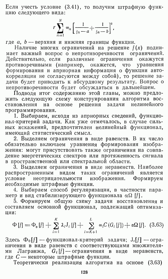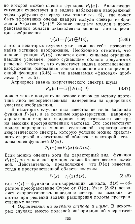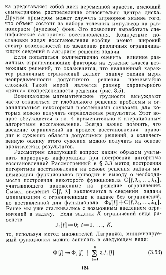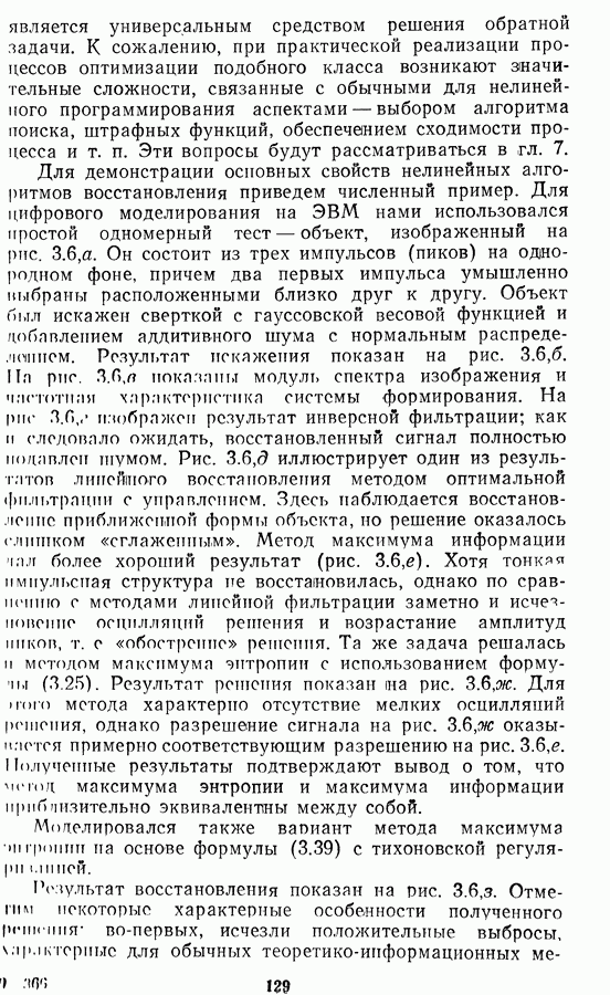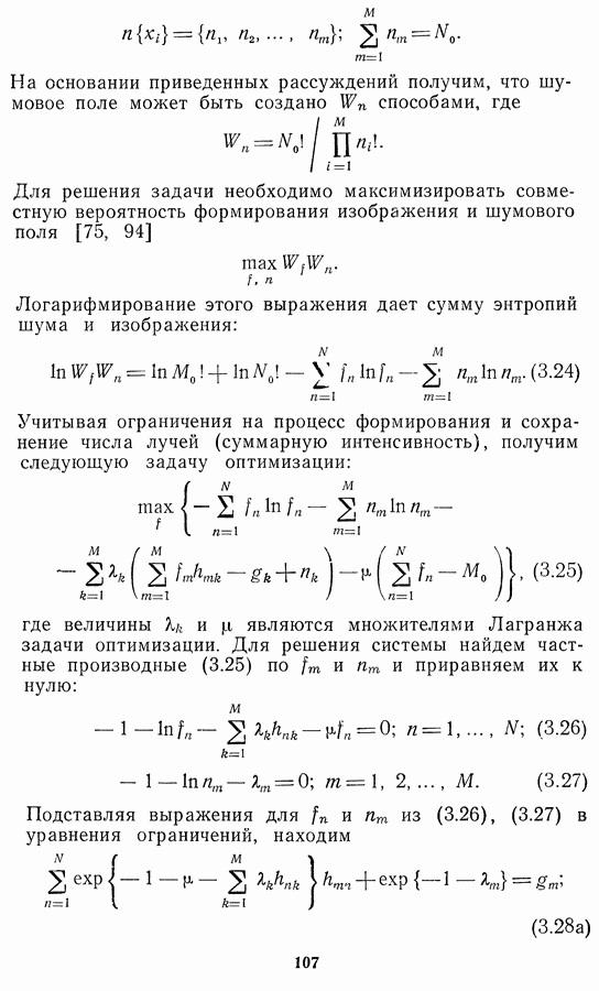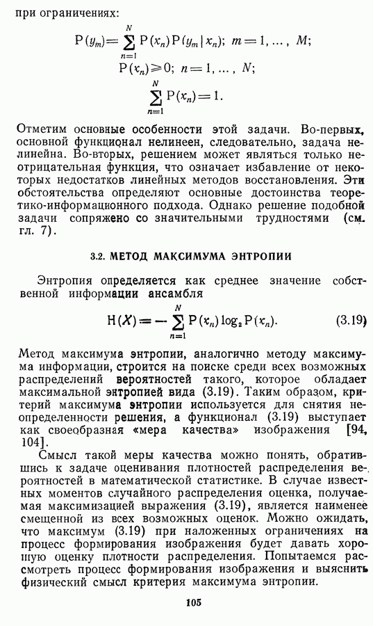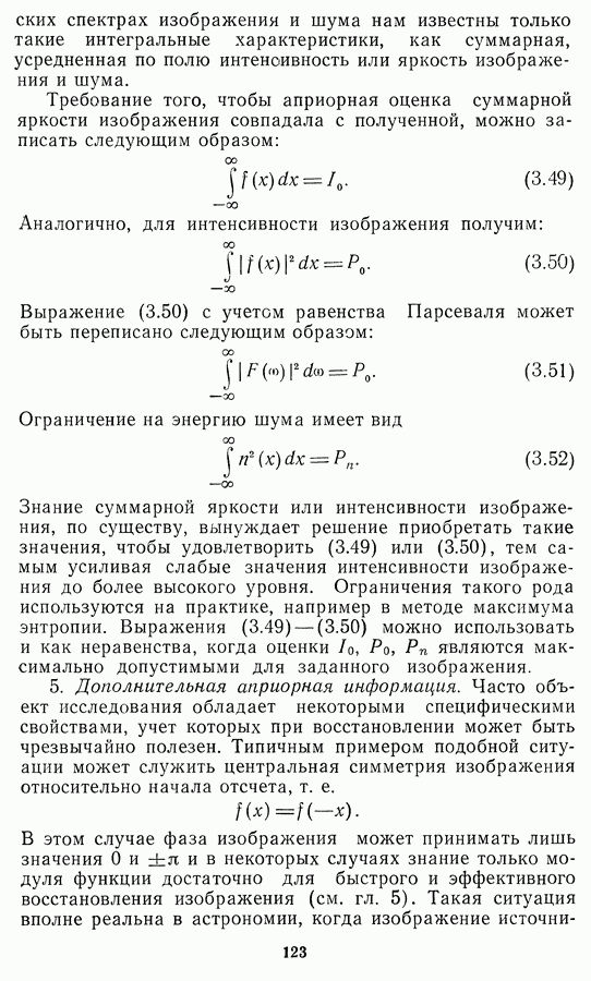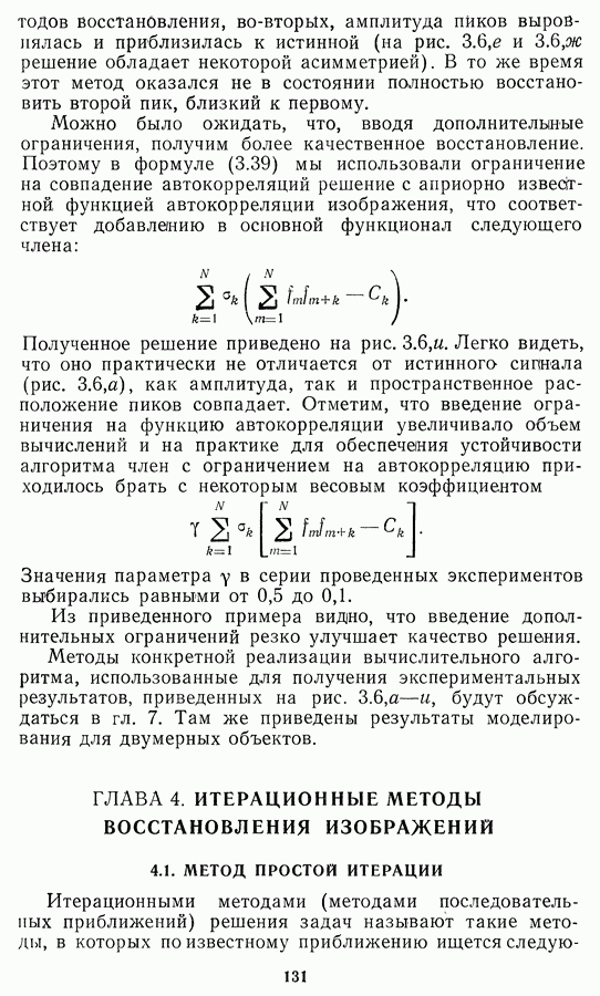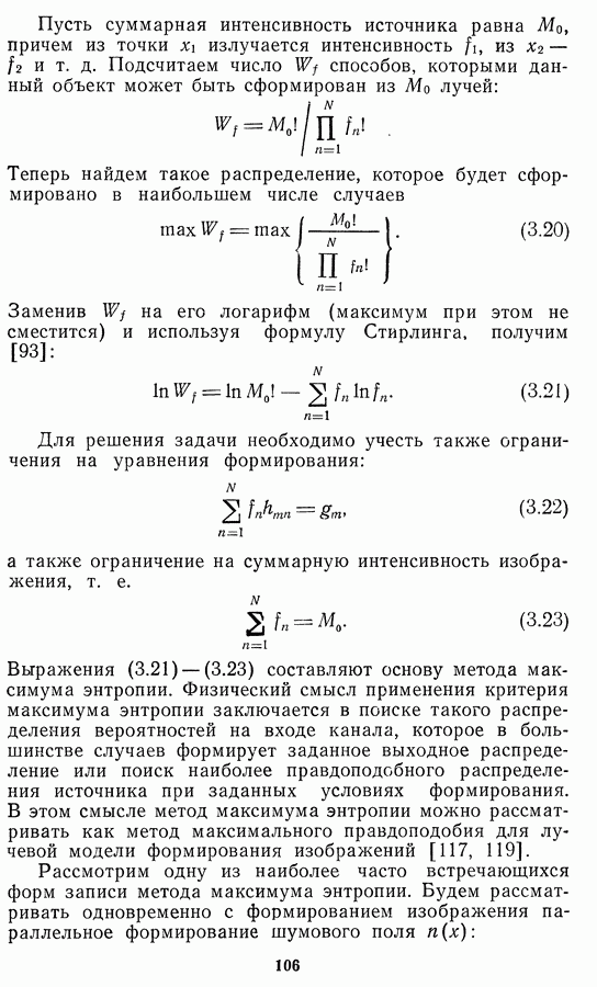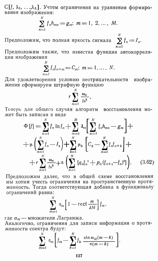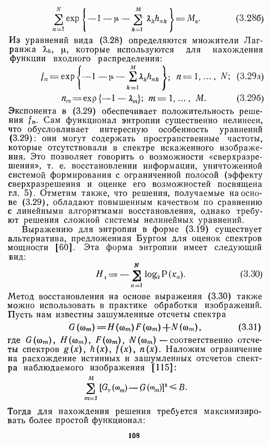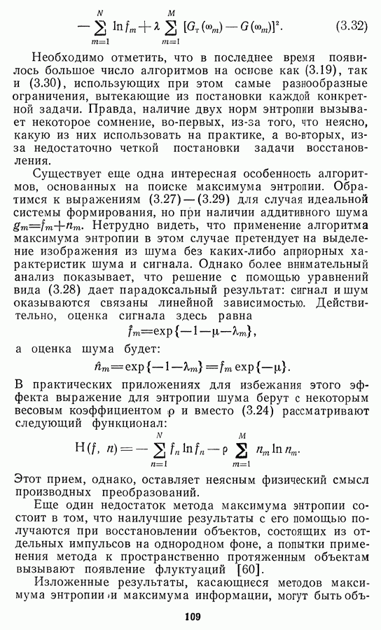 Необходимо отметить, что в последнее время появилось большое число алгоритмов на основе как (3.19), так и (3.30), использующих при этом самые разнообразные ограничения, вытекающие из постановки каждой конкретной задачи. Правда, наличие двух норм энтропии вызывает некоторое сомнение, во-первых, из-за того, что неясно, какую из них использовать на практике, а во-вторых, из-за недостаточно четкой постановки задачи восстановления. Существует еще одна интересная особенность алгоритмов, основанных на поиске максимума энтропии. Обратимся к выражениям (3.27)-(3.29) для случая идеальной системы формирования, но при наличии аддитивного шума
