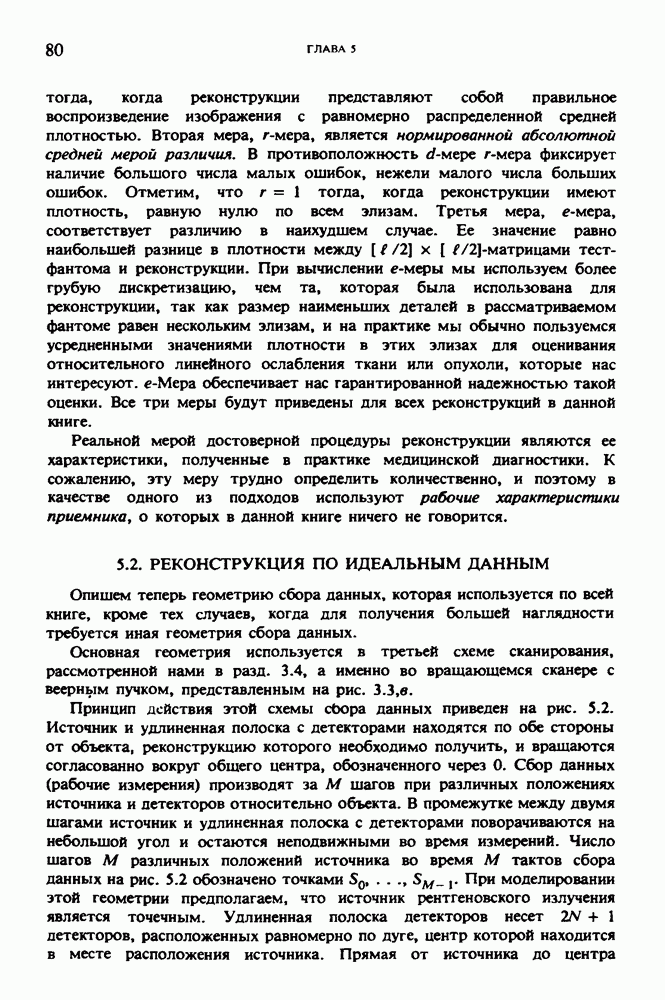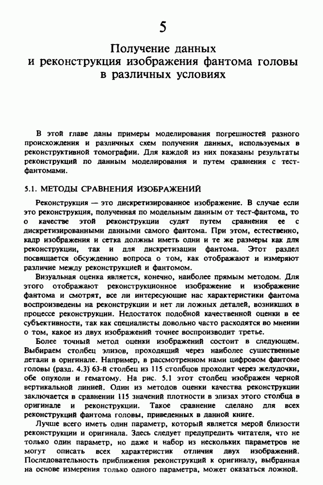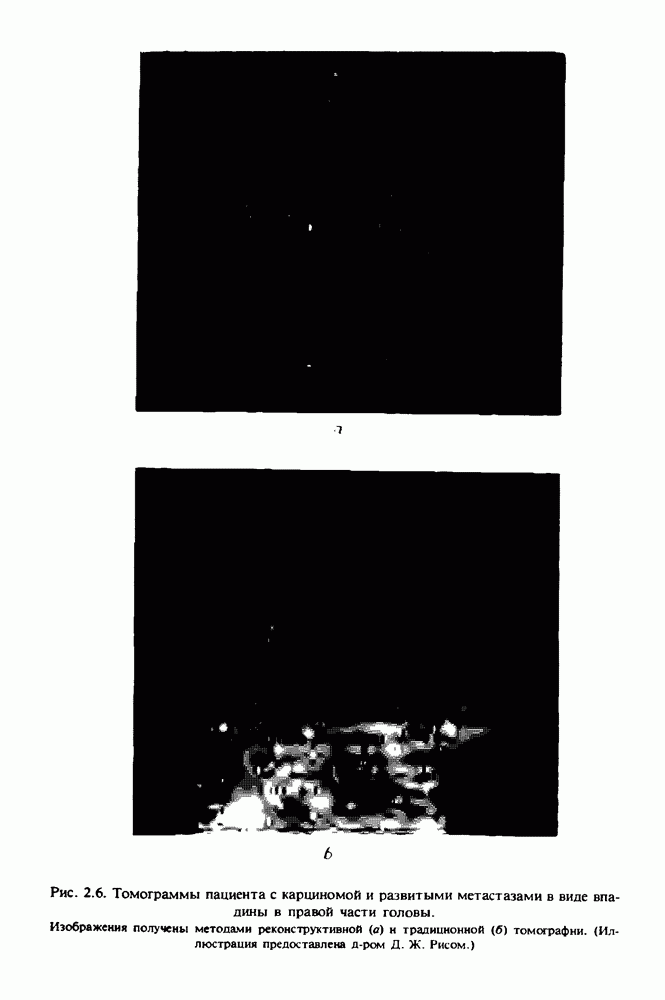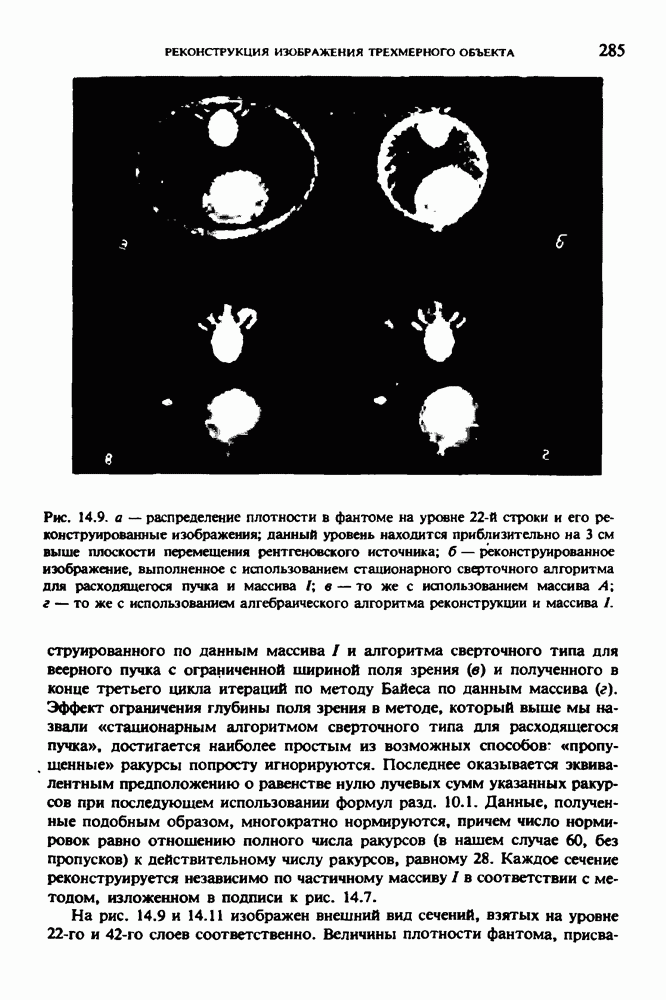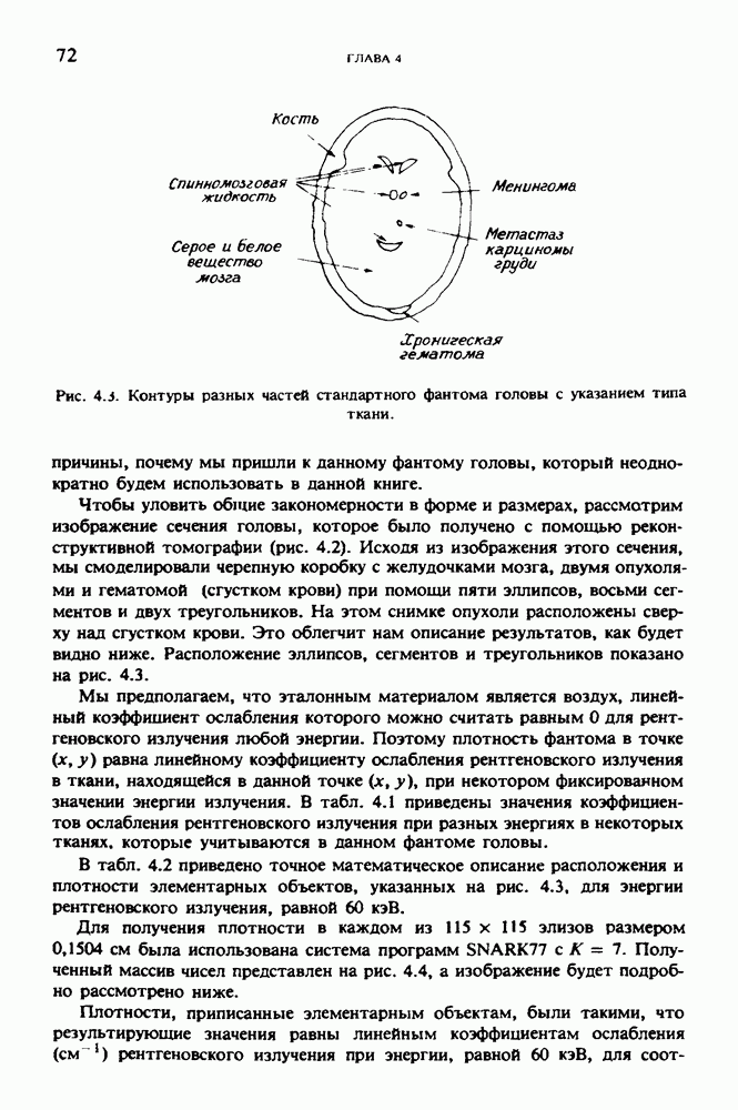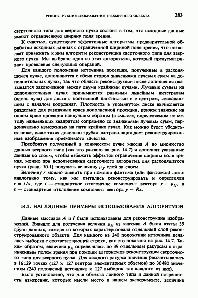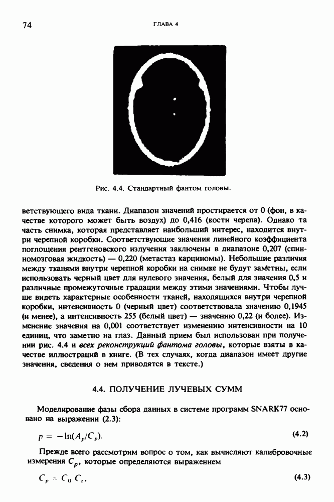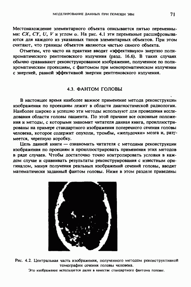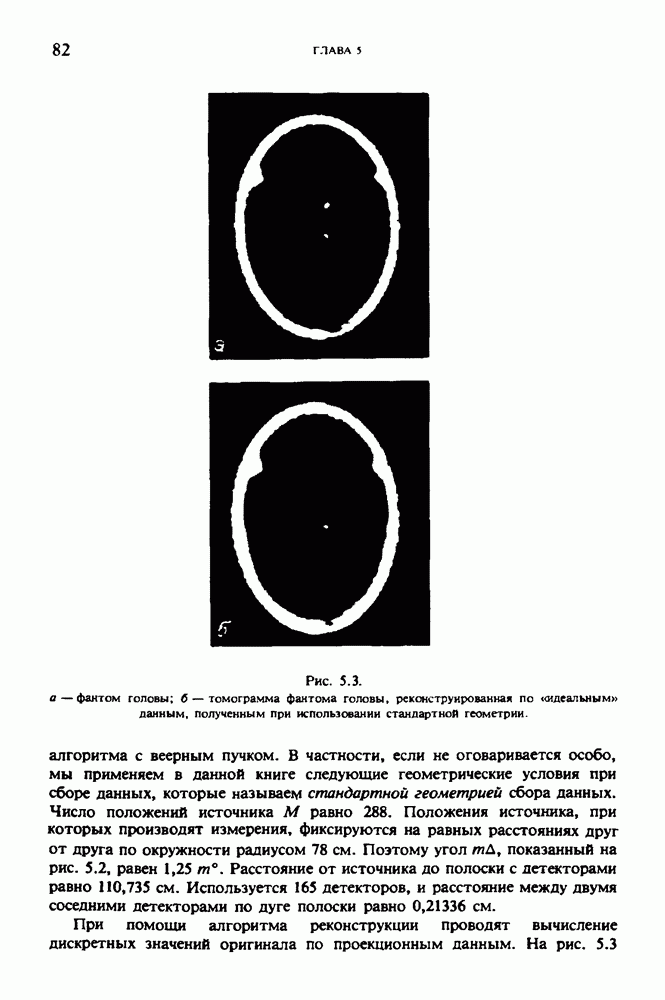15.5. ЭКСПЕРИМЕНТАЛЬНЫЕ РЕЗУЛЬТАТЫНаш первый пример относится к случаю отображения системы желудочков головного мозга человека, которое было сделано по восьми смежным срезам толщиной объема 1,5 х 1,5 х 8 мм, хотя более желательна, как и в предыдущих разделах, была бы кубическая форма элементарных объемов. Чтобы преобразовать элементарные объемы в кубические, использовалась линейная интерполяция данных для оценки 38 смежных срезов толщиной 1,5 мм. Таким образом, формируется массив из 80 х 80 х 32 чисел, характеризующих среднюю плотность множества элементарных объемов кубической формы. Причина, по которой желудочки мозга выглядят более темными, чем окружающие ткани, состоит в том, что они содержат спинномозговую жидкость с несколько меньшим, чем у мозга, линейным коэффициентом ослабления (табл. 4.1). Поэтому диапазон
