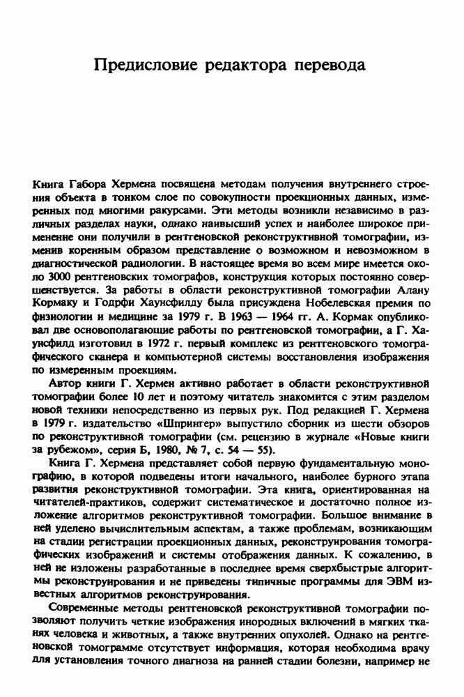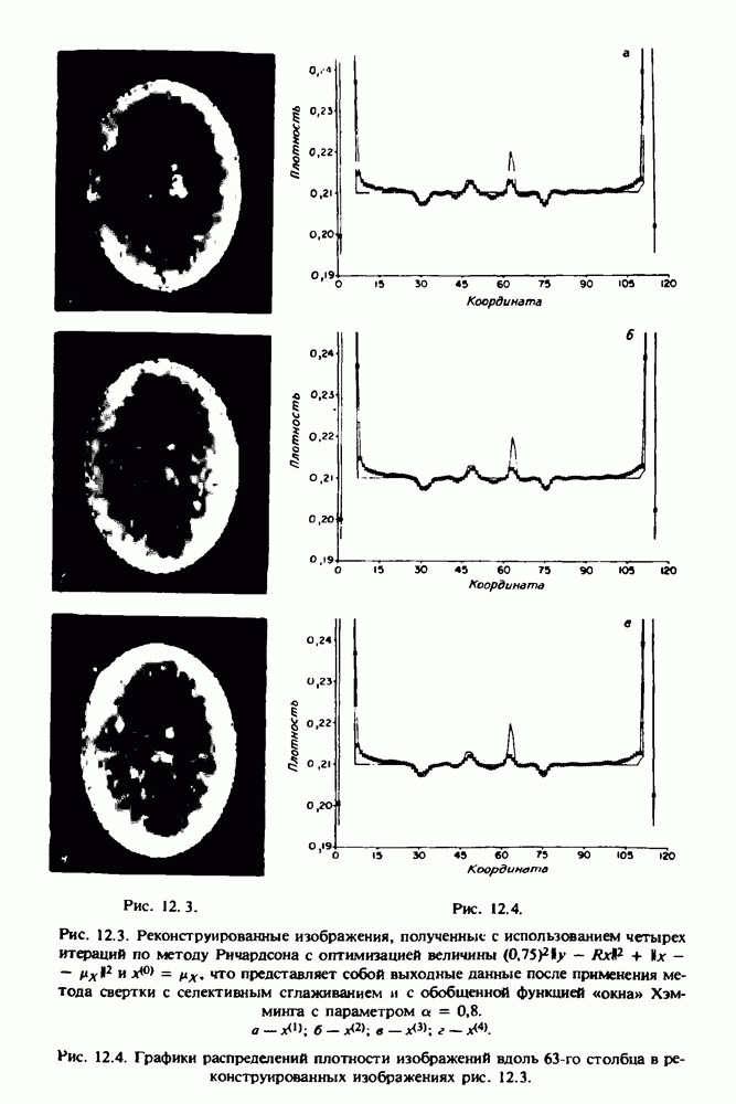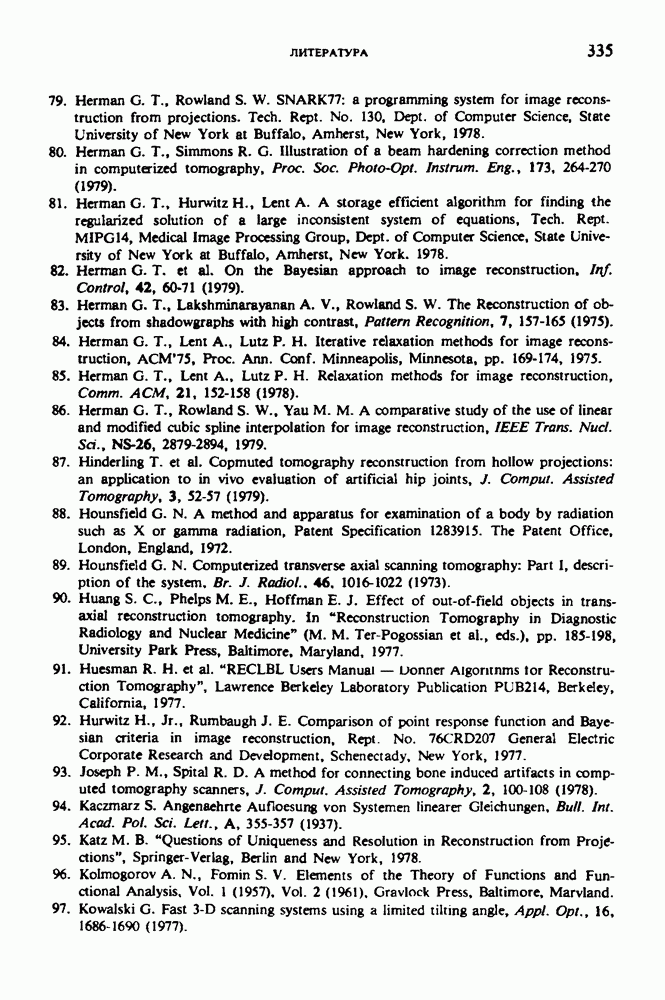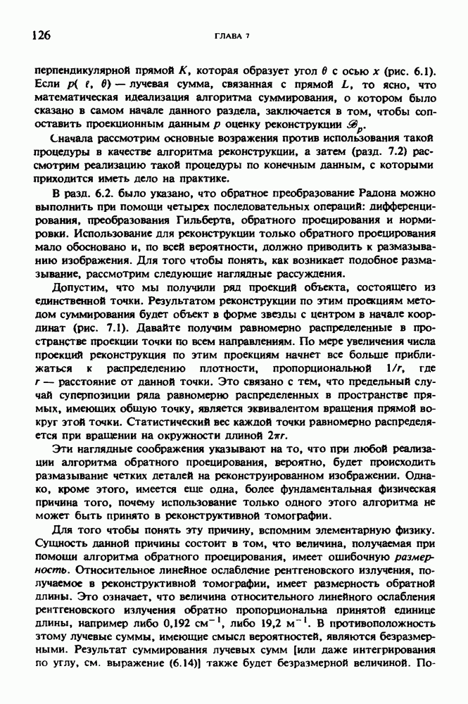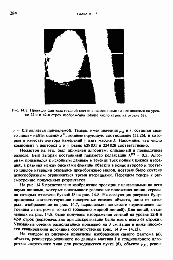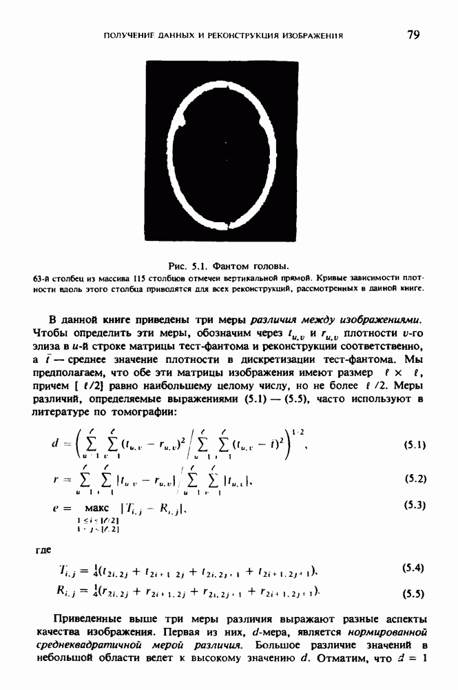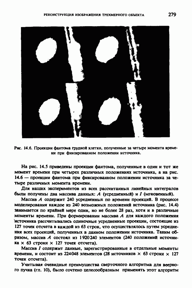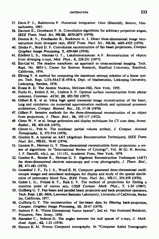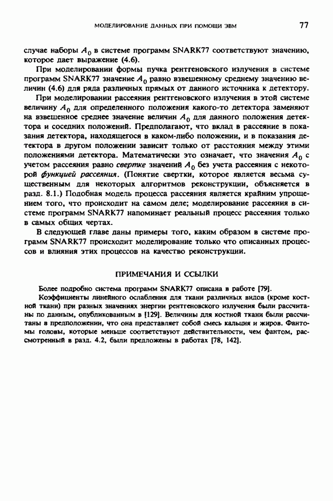 15.5. ЭКСПЕРИМЕНТАЛЬНЫЕ РЕЗУЛЬТАТЫНаш первый пример относится к случаю отображения системы желудочков головного мозга человека, которое было сделано по восьми смежным срезам толщиной объема 1,5 х 1,5 х 8 мм, хотя более желательна, как и в предыдущих разделах, была бы кубическая форма элементарных объемов. Чтобы преобразовать элементарные объемы в кубические, использовалась линейная интерполяция данных для оценки 38 смежных срезов толщиной 1,5 мм. Таким образом, формируется массив из 80 х 80 х 32 чисел, характеризующих среднюю плотность множества элементарных объемов кубической формы. Причина, по которой желудочки мозга выглядят более темными, чем окружающие ткани, состоит в том, что они содержат спинномозговую жидкость с несколько меньшим, чем у мозга, линейным коэффициентом ослабления (табл. 4.1). Поэтому диапазон