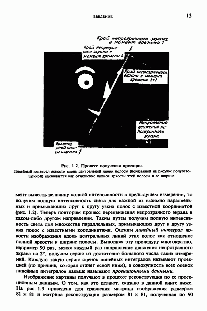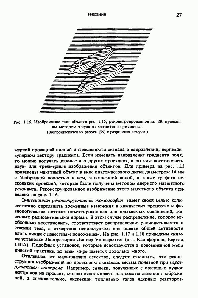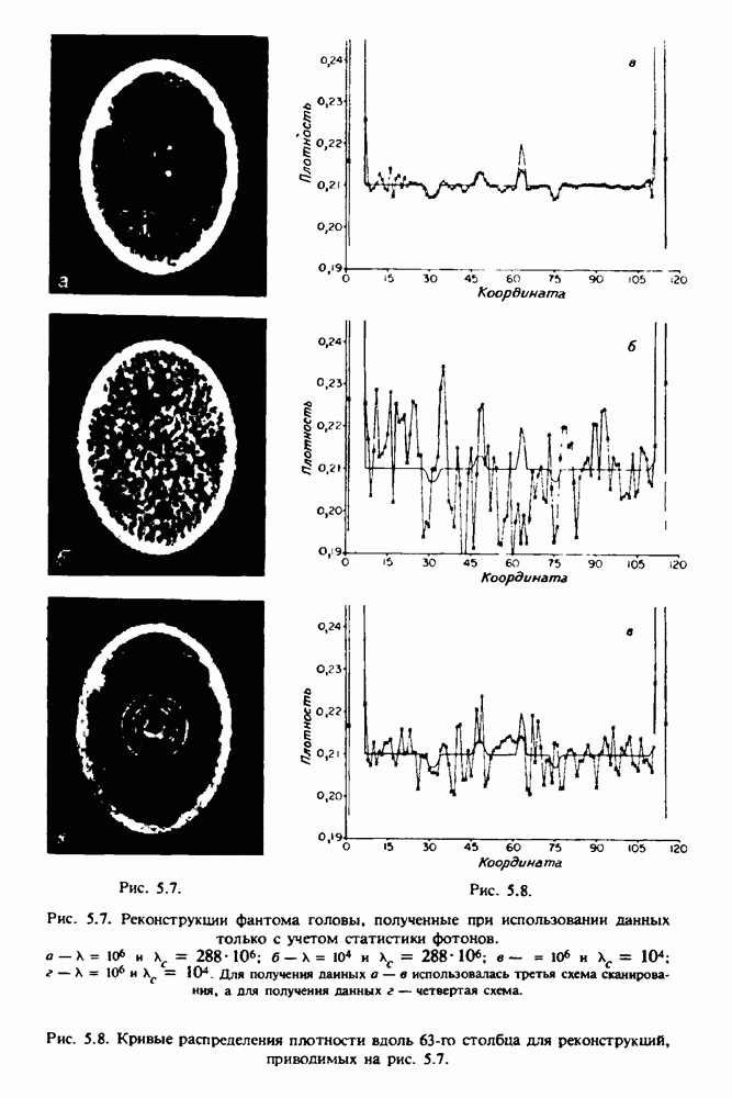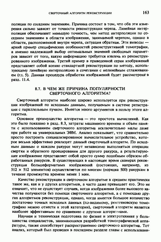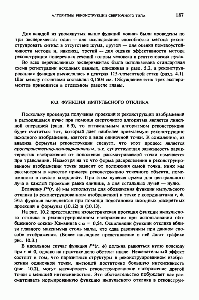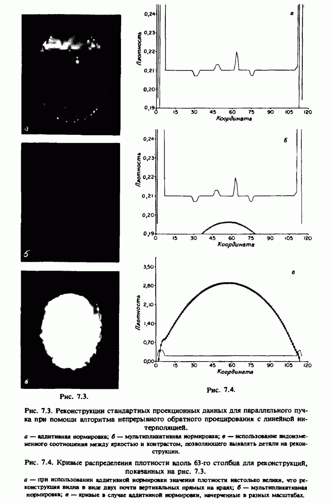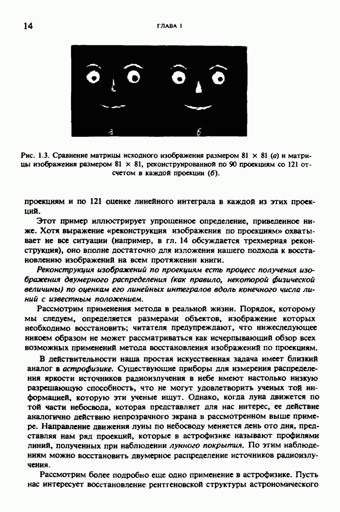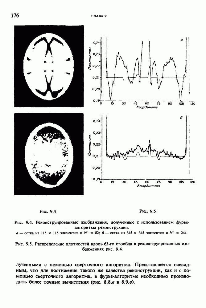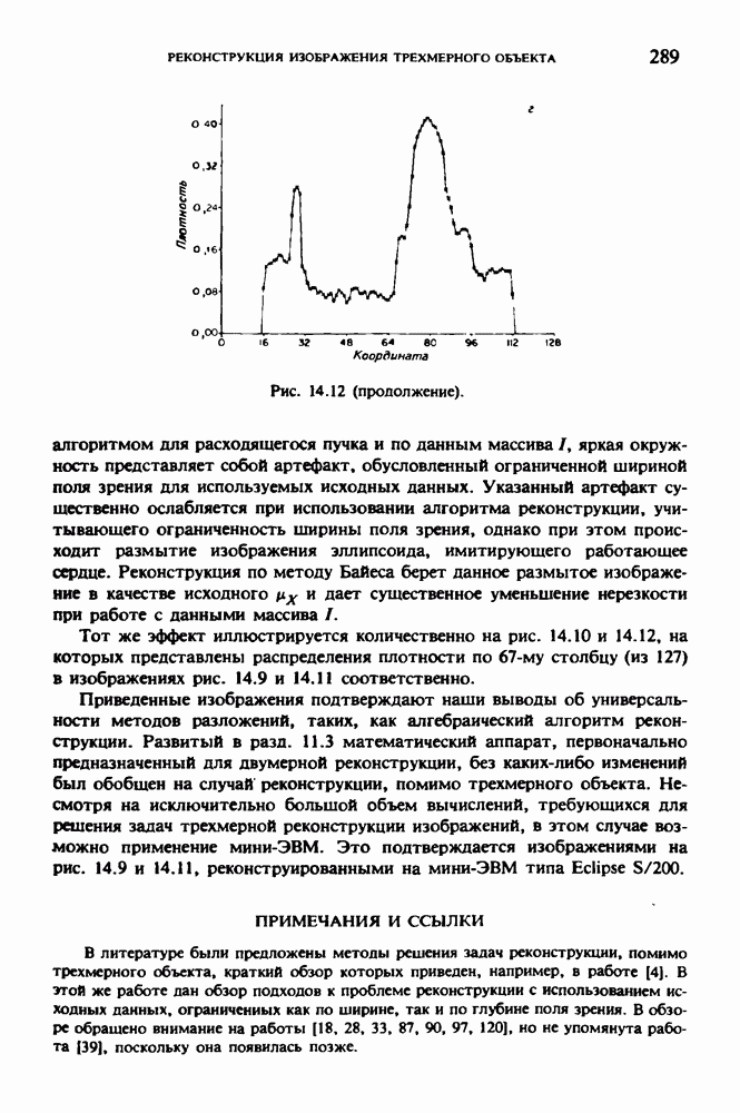 15.5. ЭКСПЕРИМЕНТАЛЬНЫЕ РЕЗУЛЬТАТЫНаш первый пример относится к случаю отображения системы желудочков головного мозга человека, которое было сделано по восьми смежным срезам толщиной объема 1,5 х 1,5 х 8 мм, хотя более желательна, как и в предыдущих разделах, была бы кубическая форма элементарных объемов. Чтобы преобразовать элементарные объемы в кубические, использовалась линейная интерполяция данных для оценки 38 смежных срезов толщиной 1,5 мм. Таким образом, формируется массив из 80 х 80 х 32 чисел, характеризующих среднюю плотность множества элементарных объемов кубической формы. Причина, по которой желудочки мозга выглядят более темными, чем окружающие ткани, состоит в том, что они содержат спинномозговую жидкость с несколько меньшим, чем у мозга, линейным коэффициентом ослабления (табл. 4.1). Поэтому диапазон
