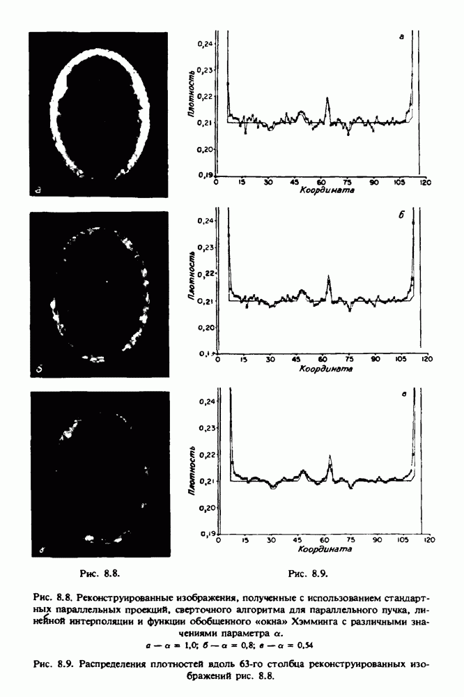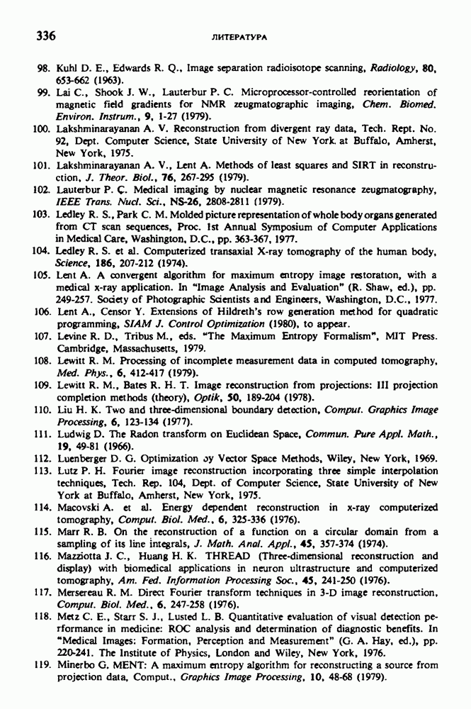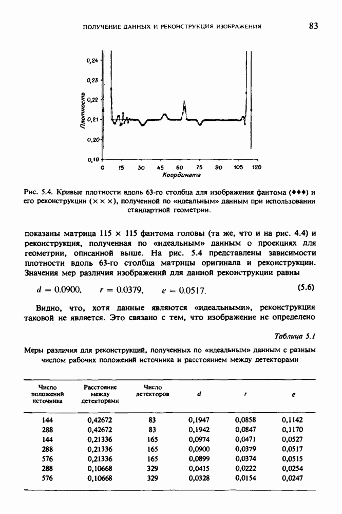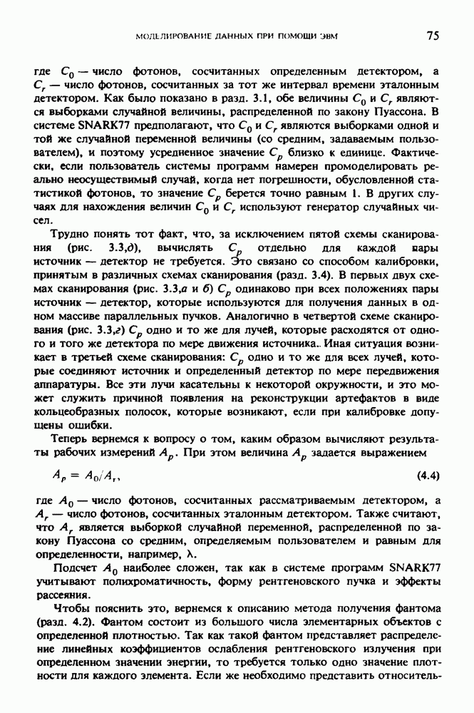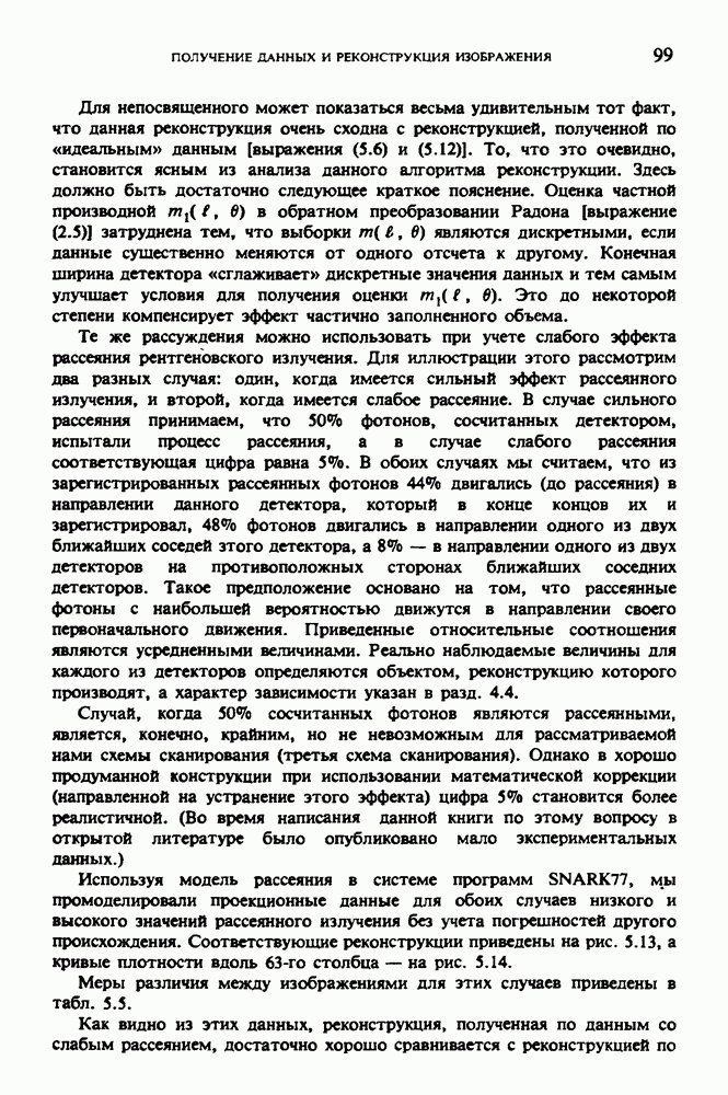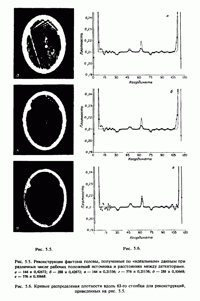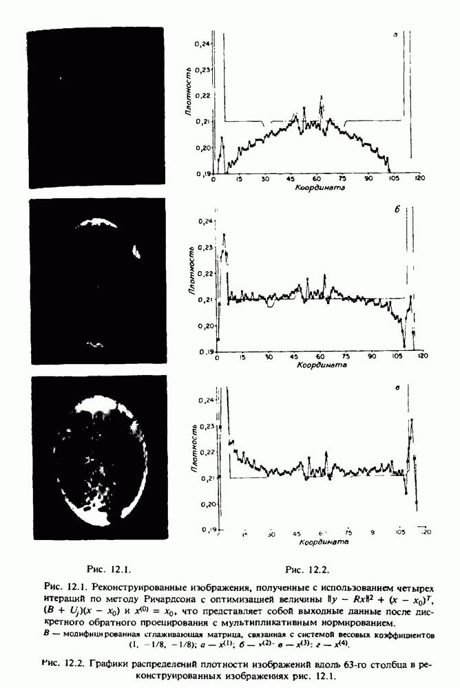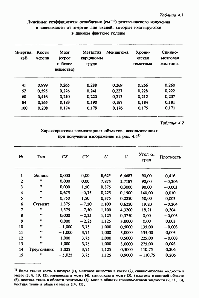15.5. ЭКСПЕРИМЕНТАЛЬНЫЕ РЕЗУЛЬТАТЫНаш первый пример относится к случаю отображения системы желудочков головного мозга человека, которое было сделано по восьми смежным срезам толщиной объема 1,5 х 1,5 х 8 мм, хотя более желательна, как и в предыдущих разделах, была бы кубическая форма элементарных объемов. Чтобы преобразовать элементарные объемы в кубические, использовалась линейная интерполяция данных для оценки 38 смежных срезов толщиной 1,5 мм. Таким образом, формируется массив из 80 х 80 х 32 чисел, характеризующих среднюю плотность множества элементарных объемов кубической формы. Причина, по которой желудочки мозга выглядят более темными, чем окружающие ткани, состоит в том, что они содержат спинномозговую жидкость с несколько меньшим, чем у мозга, линейным коэффициентом ослабления (табл. 4.1). Поэтому диапазон